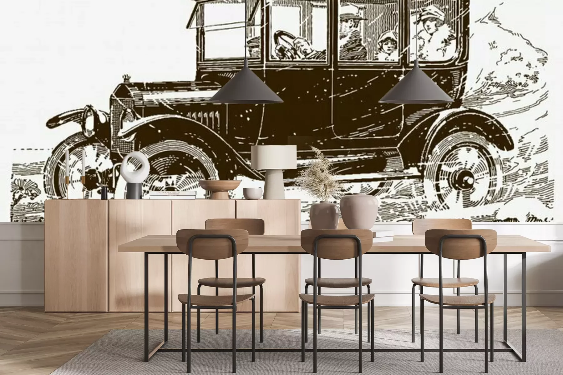 Sticker Four people driving in a vintage car in a snowy landscape. Illustration after a historical engraving from the early 20th century