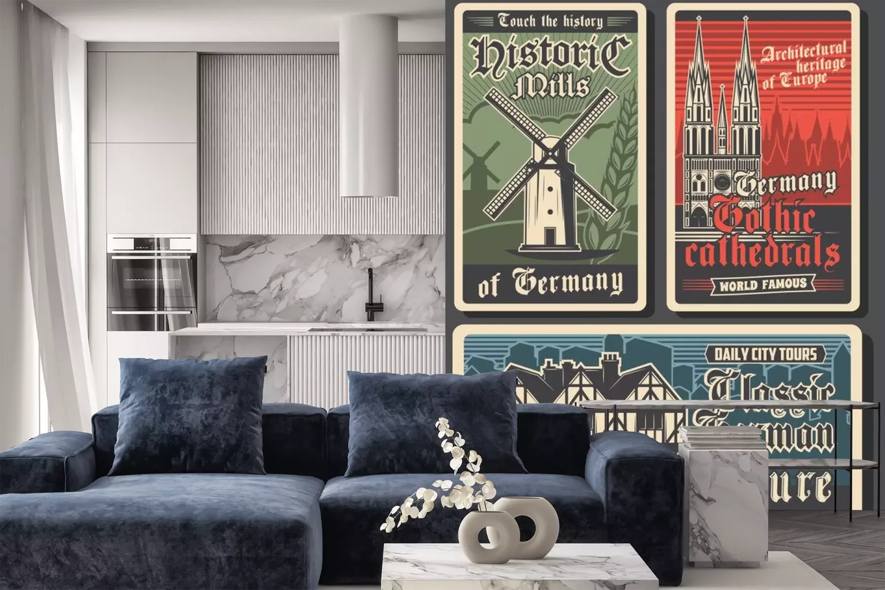 Sticker Germany travel retro posters, German landmarks and Berlin city buildings, culture and tourism, vector. German Gothic architecture, castles, cathedrals and historic mills, Europe travel destinations