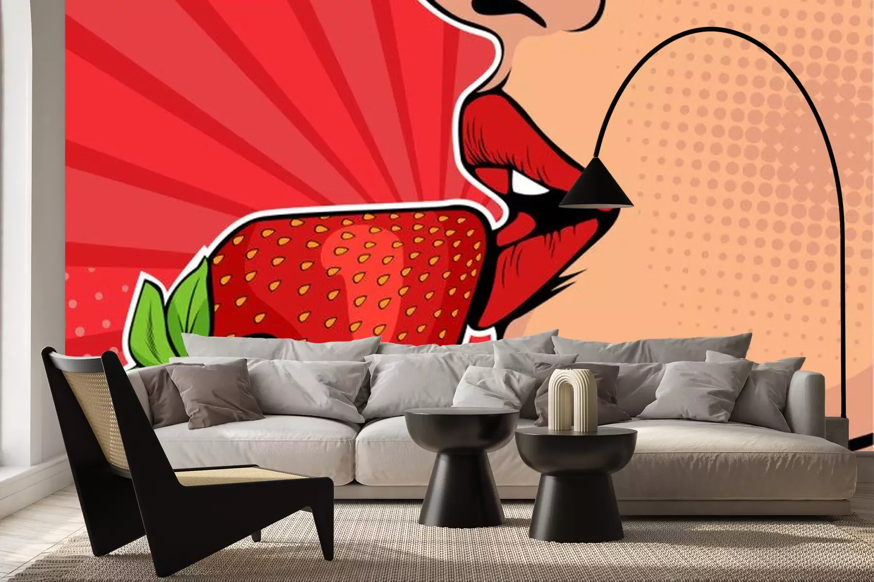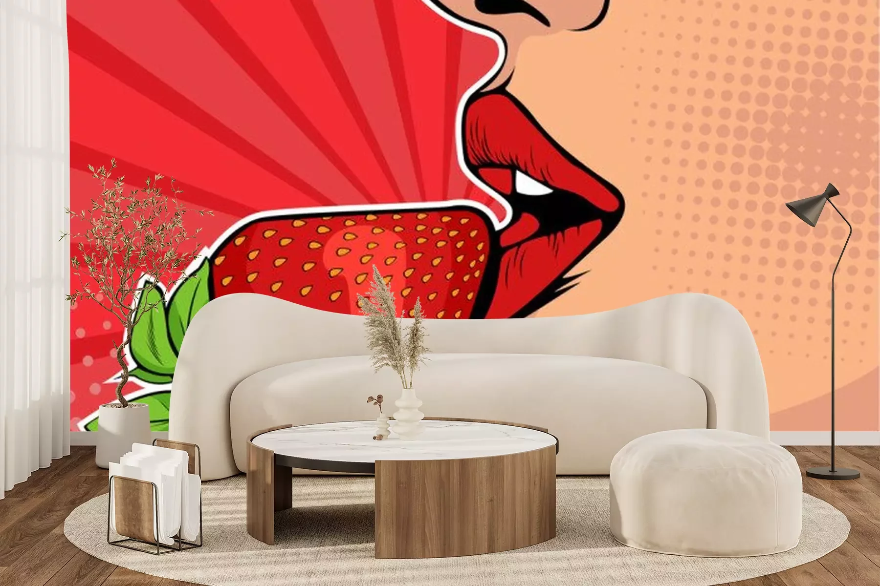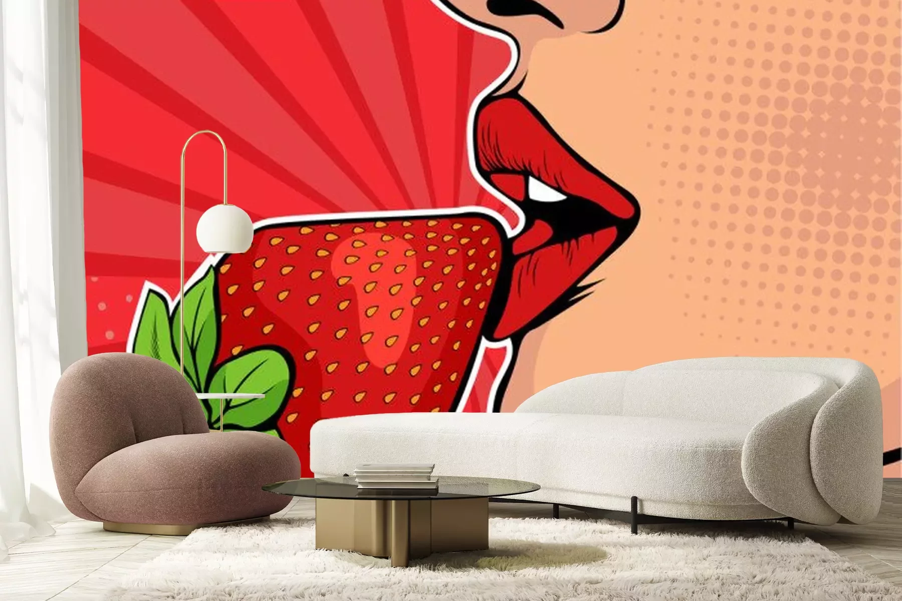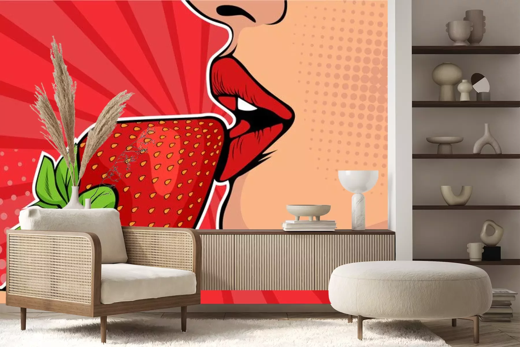 Sticker Girls lips with strawberry. Woman eating healthy food. Erotic fantasy. Vector Illustration in pop art retro comic style.