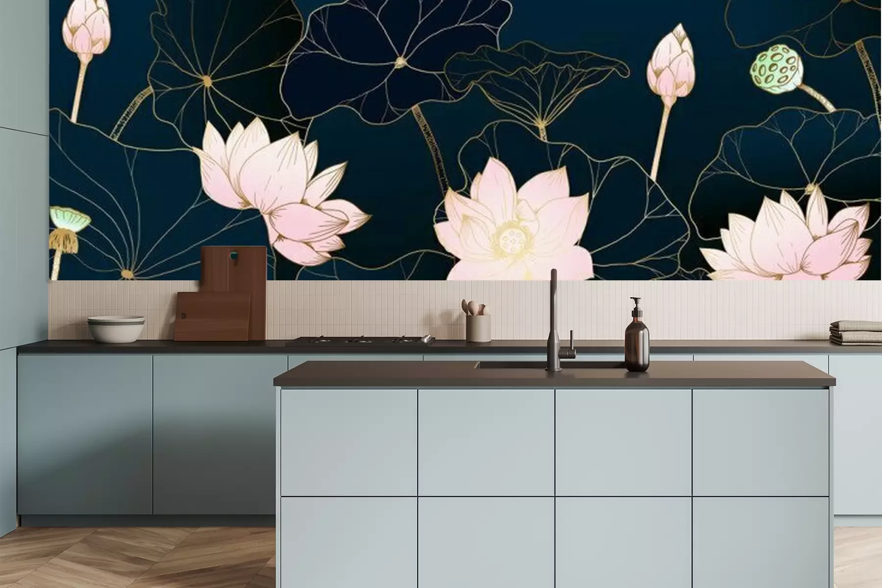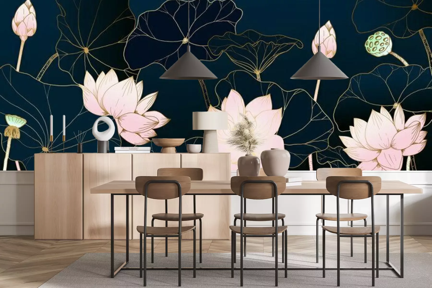Sticker Golden lotus line arts on dark background, Luxury gold wallpaper design for prints, banner, fabric, poster, cover, digital arts vector illustration.