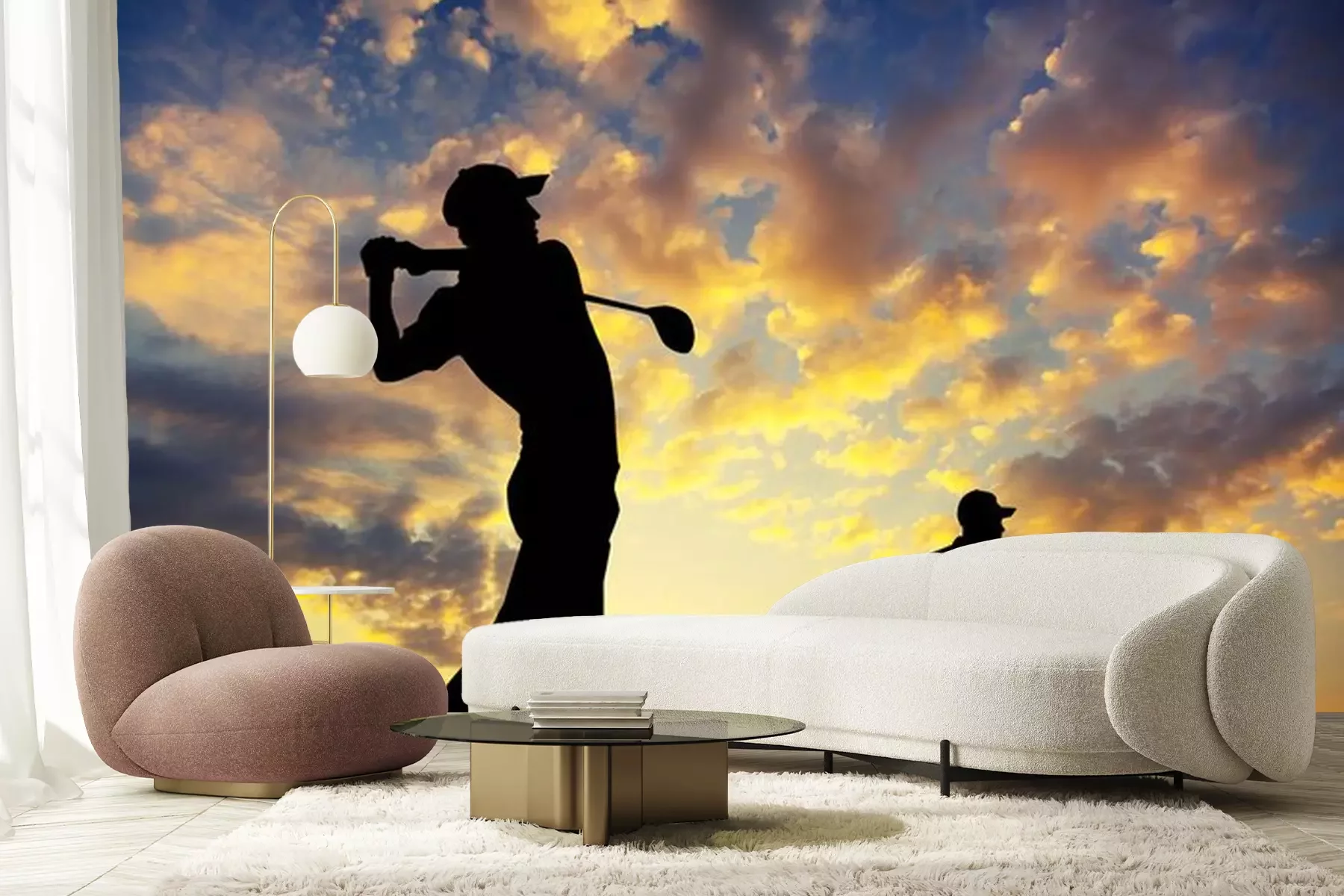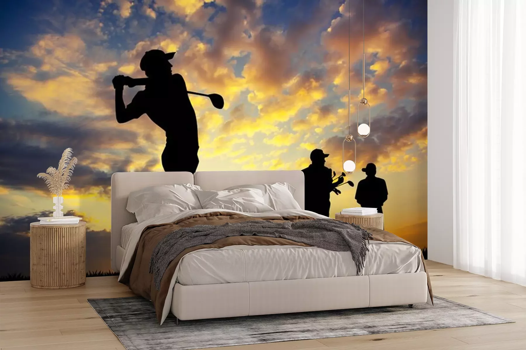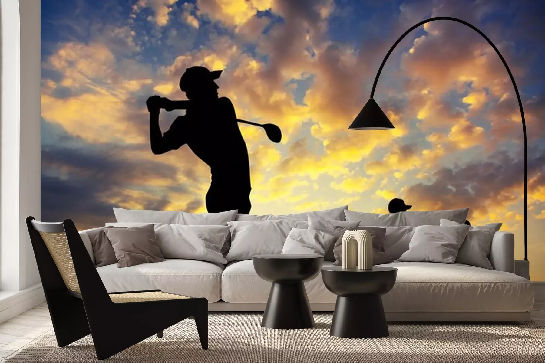 Sticker Golfspieler auf dem Golfplatz bei Sonnenuntergang