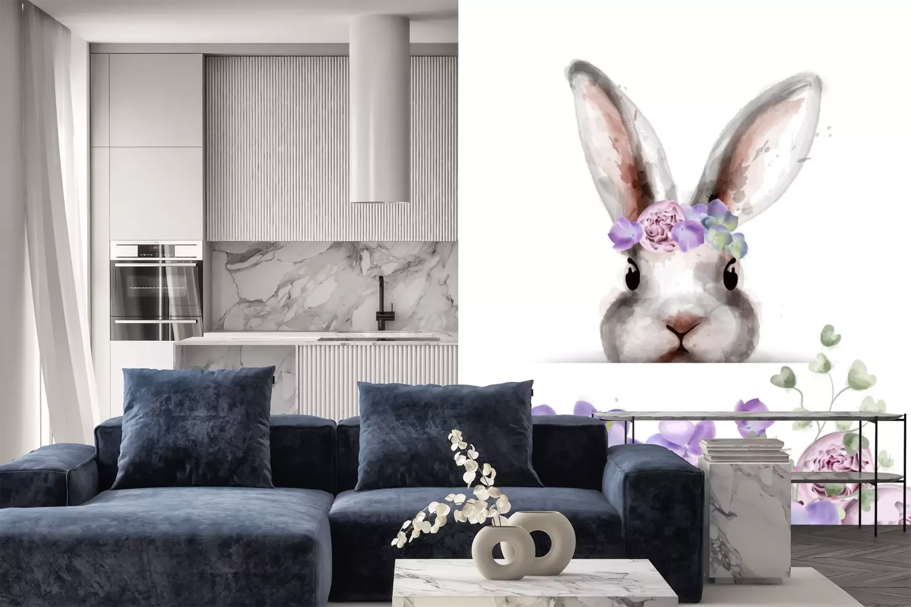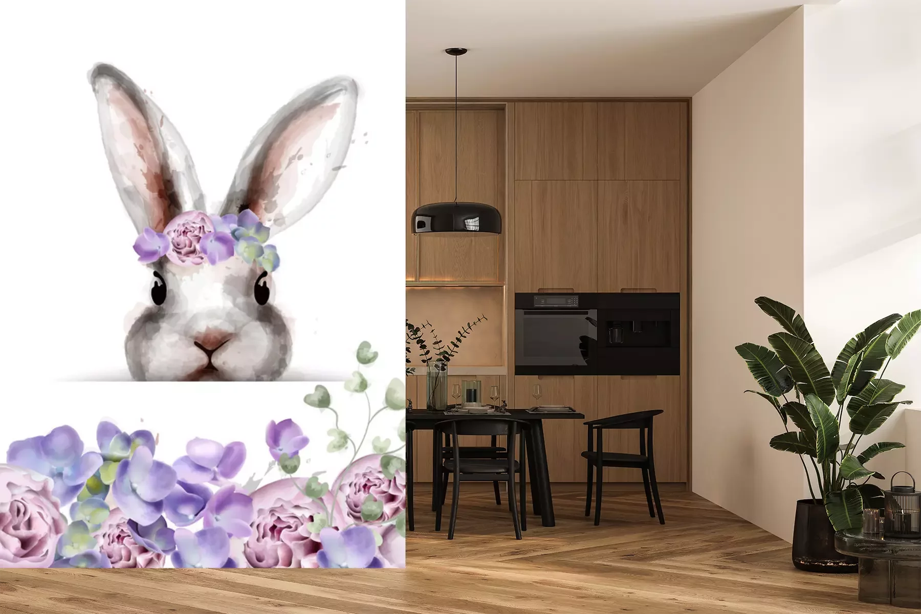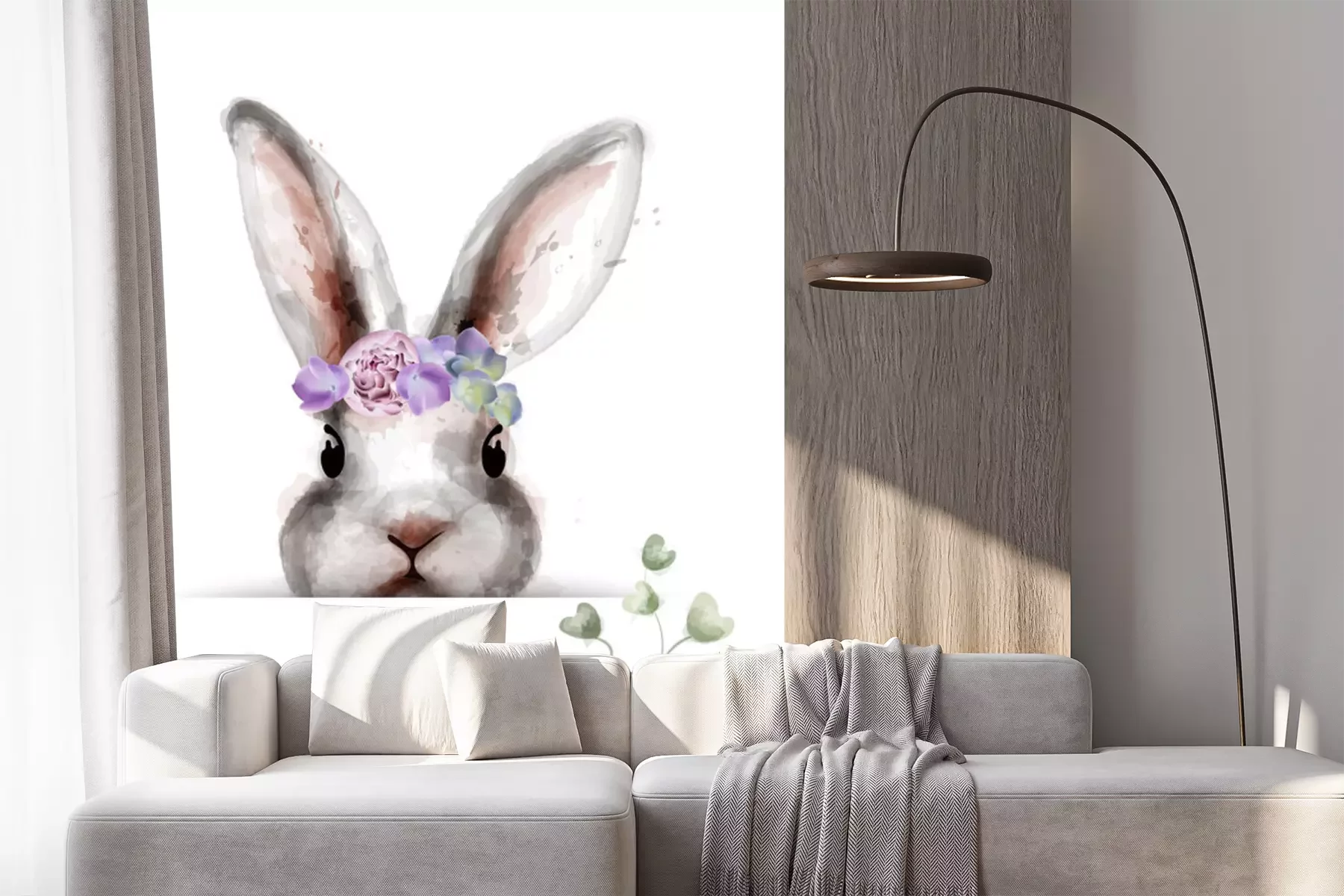 Sticker Grauer Hase mit Aquarell-Blumen in Violett