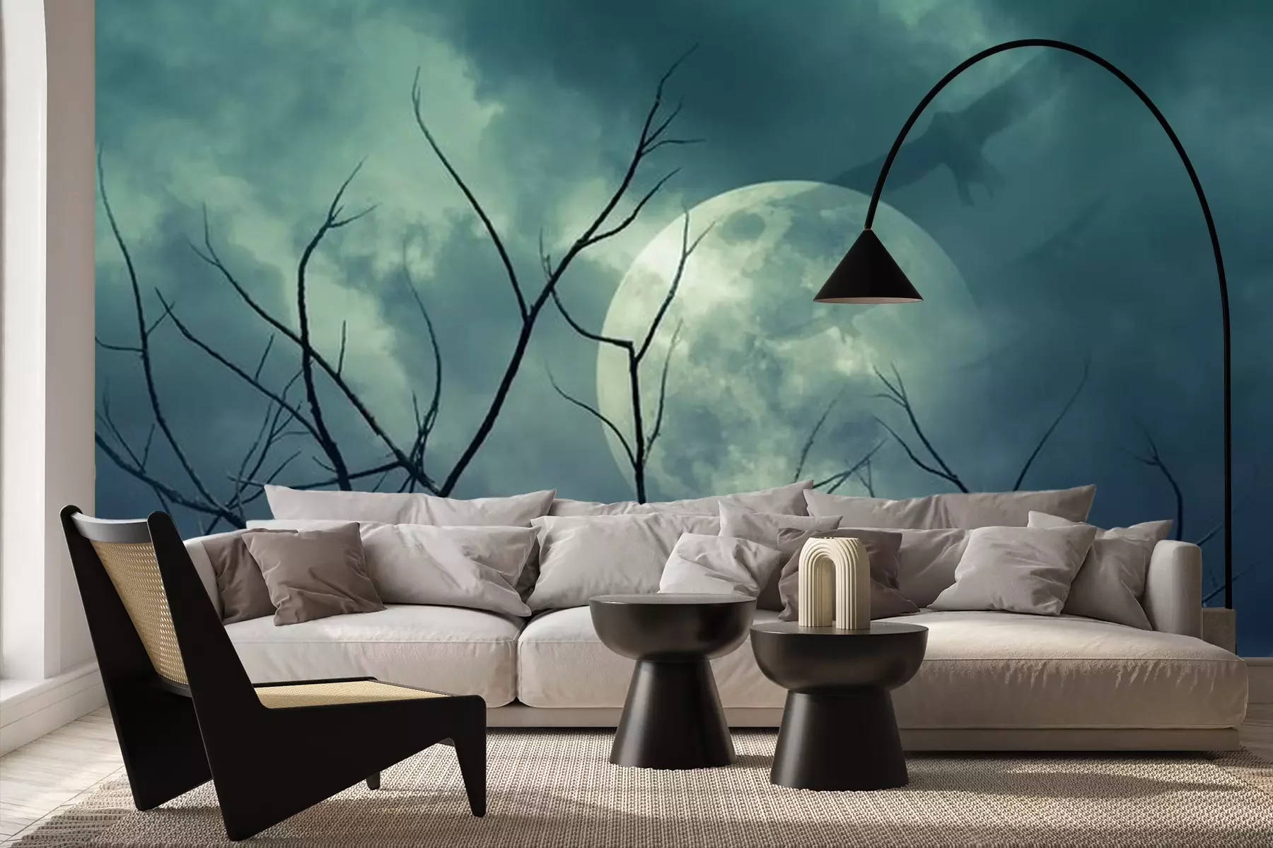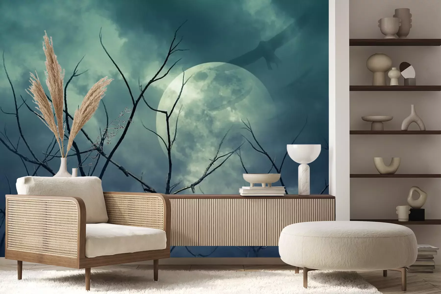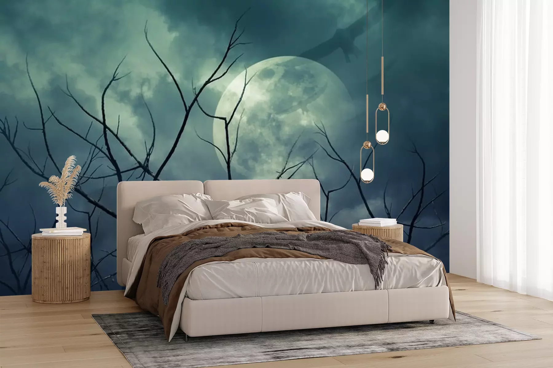 Sticker Gruseliger Wald mit Vollmond, toten Bäumen, Halloween-Hintergrund