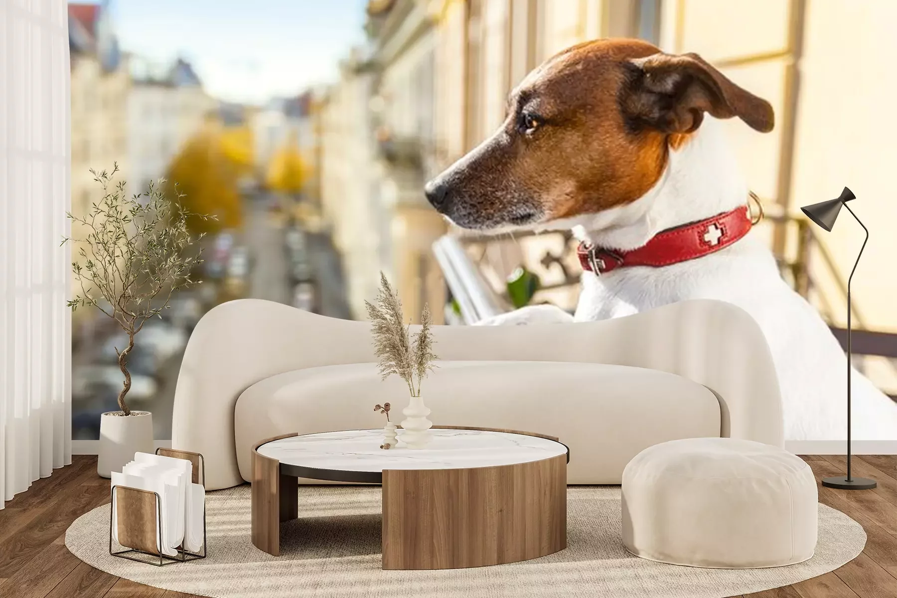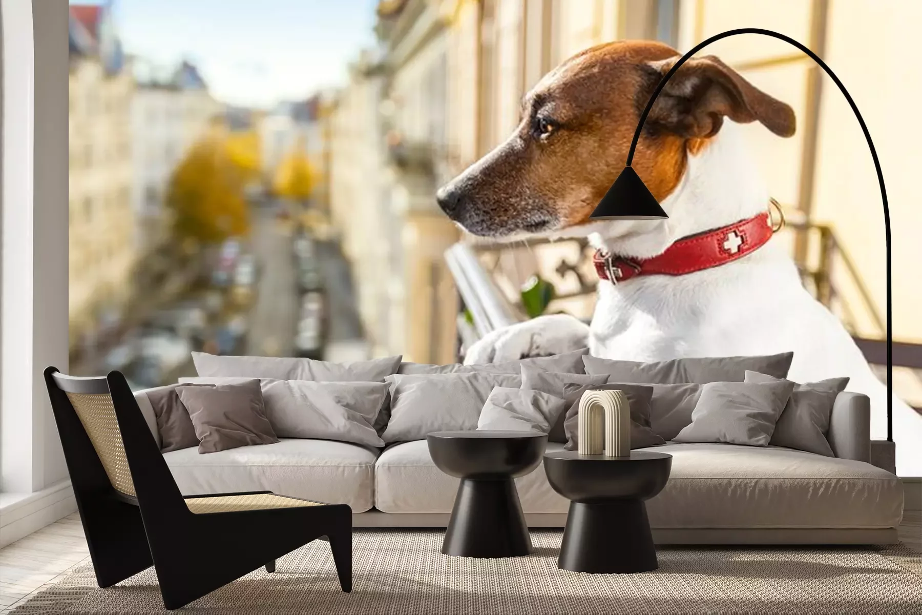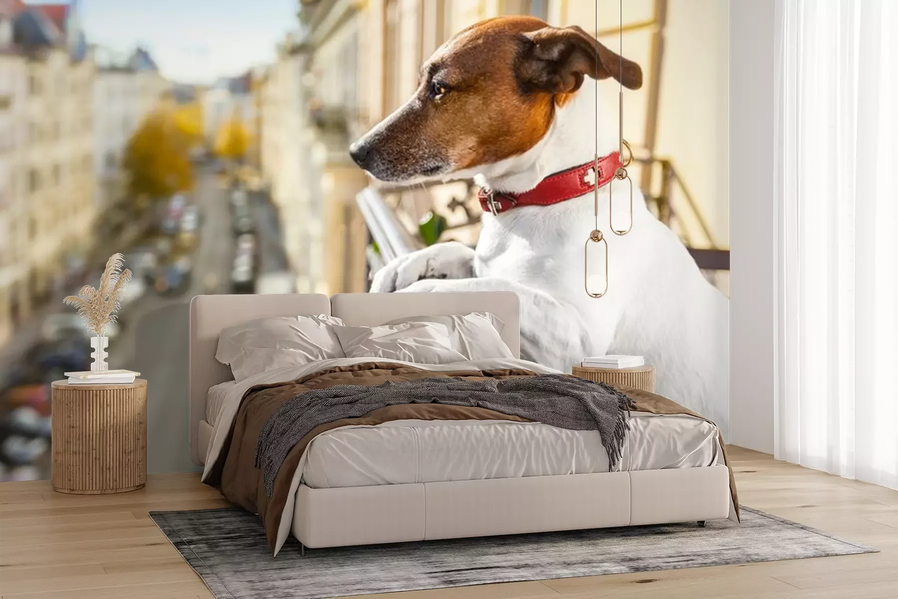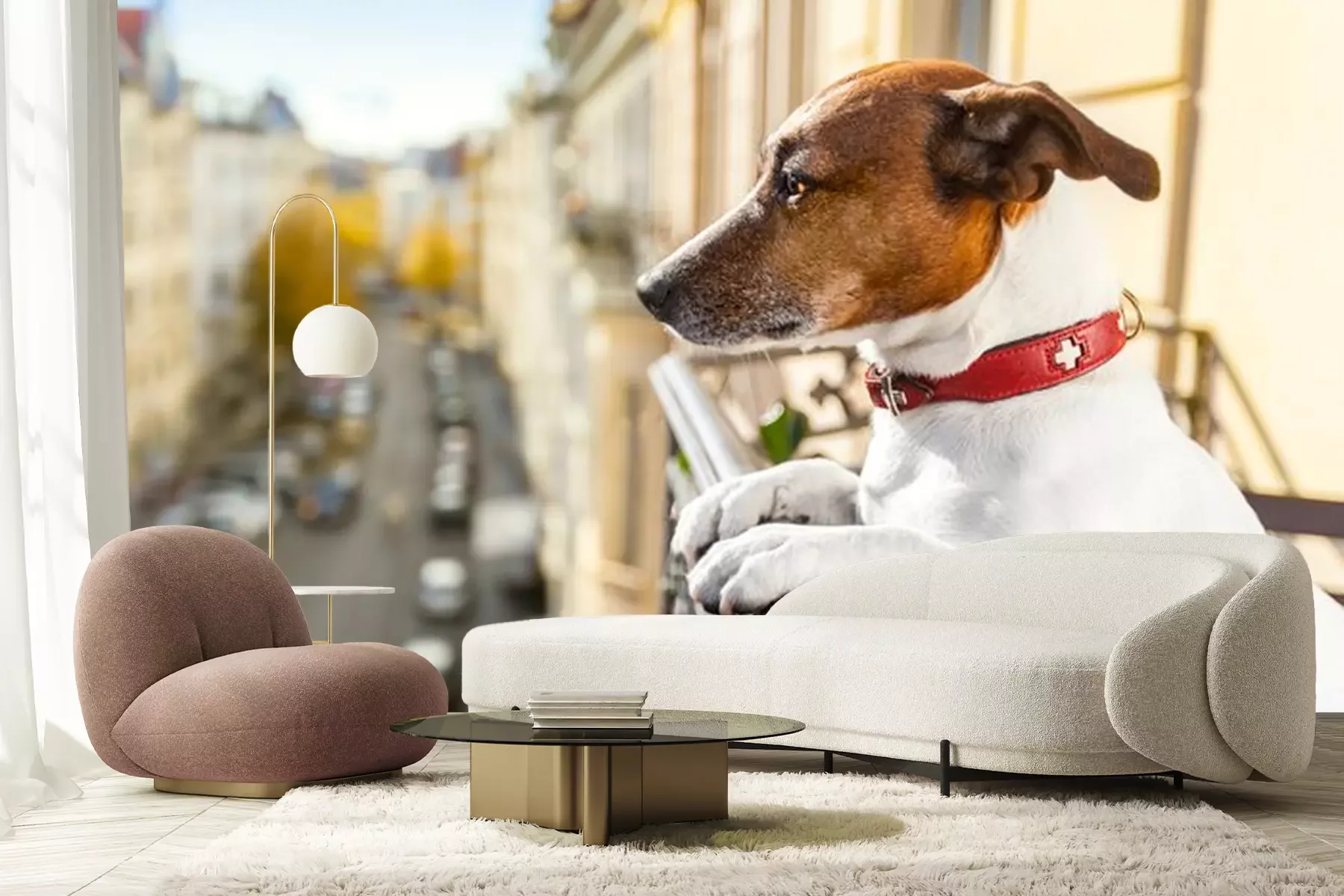 Sticker Haustiere Hund schaut über das Geländer auf dem Balkon