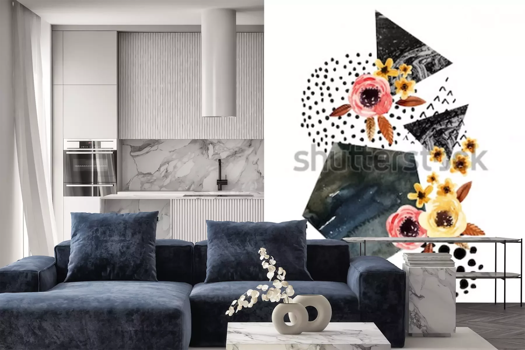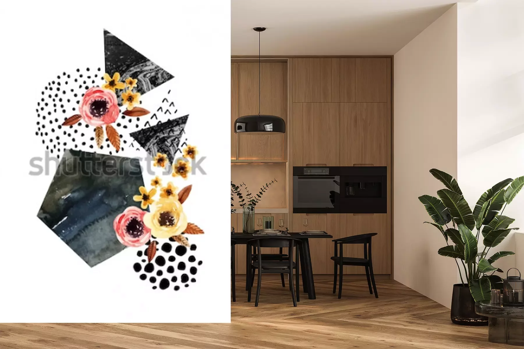 Sticker Herbsthintergrund: fallende Blätter, Blumen, geometrische Elemente. Aquarellillustration mit Blatt, Dreiecken, Marmor, Wasserfarbe, Gekritzelbeschaffenheiten für Falldesign. Handgemalte Aquarellkunst