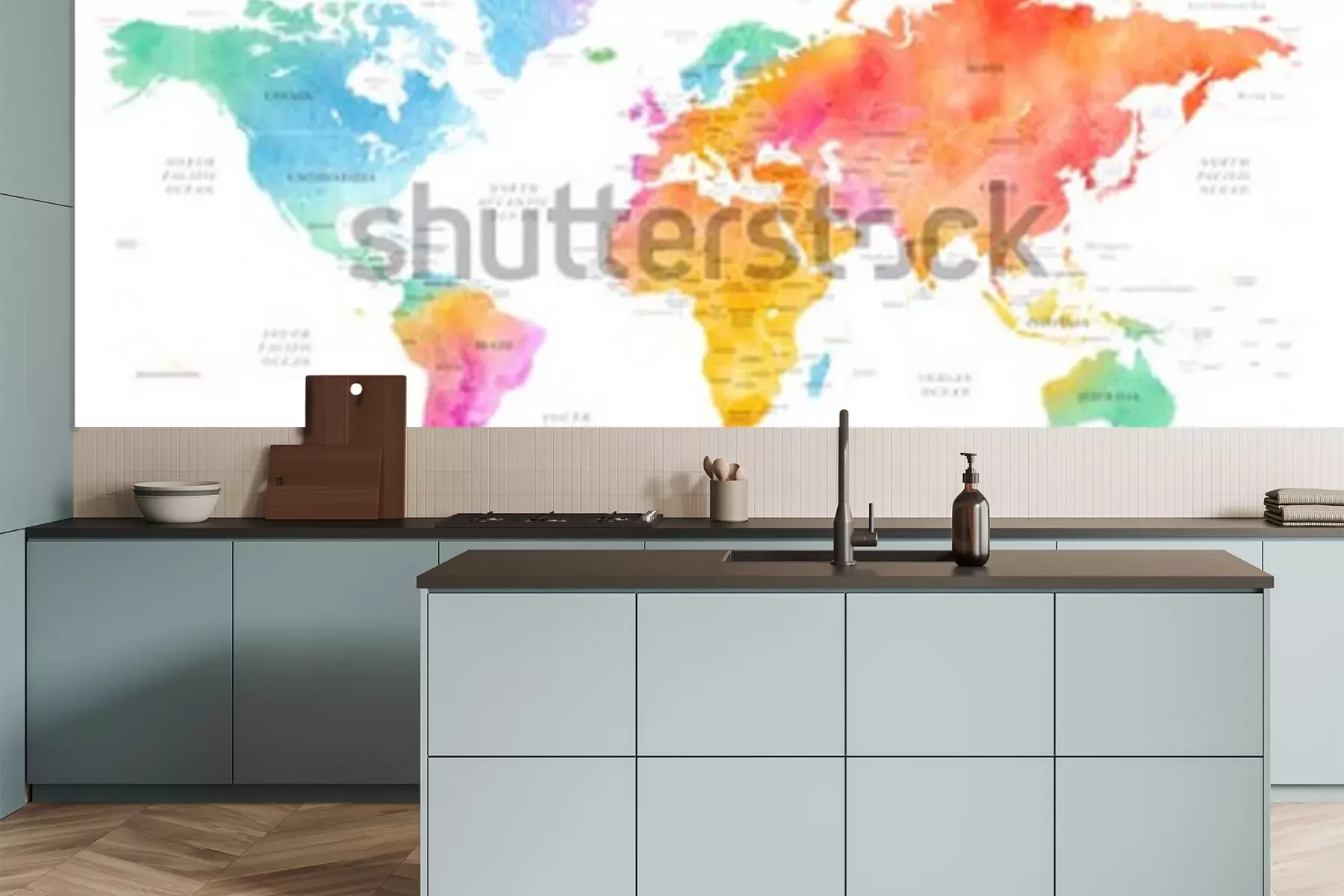 Sticker Hohe detaillierte mehrfarbige Aquarell-Weltkartenillustration mit Grenzen, Ozeanen und Ländern auf weißem Hintergrund, Seitenansicht