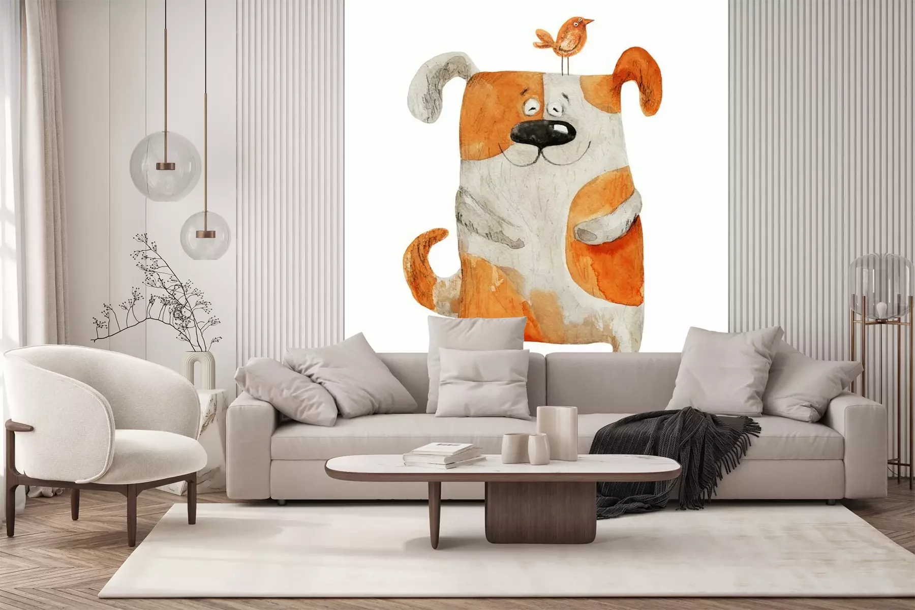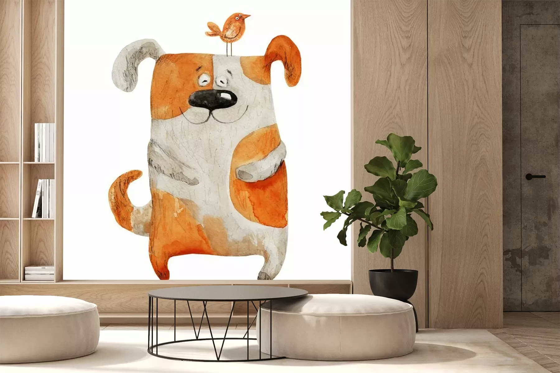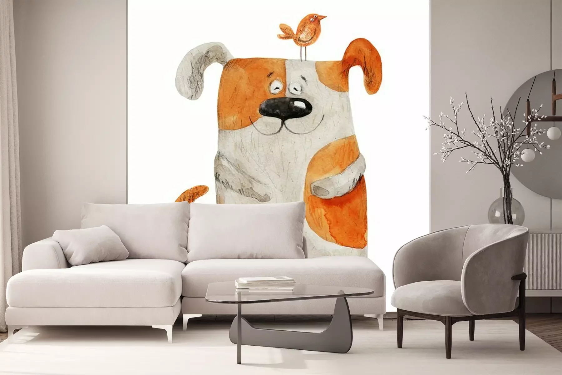 Sticker Hund lächelnd mit Vogel. Aquarellabbildung