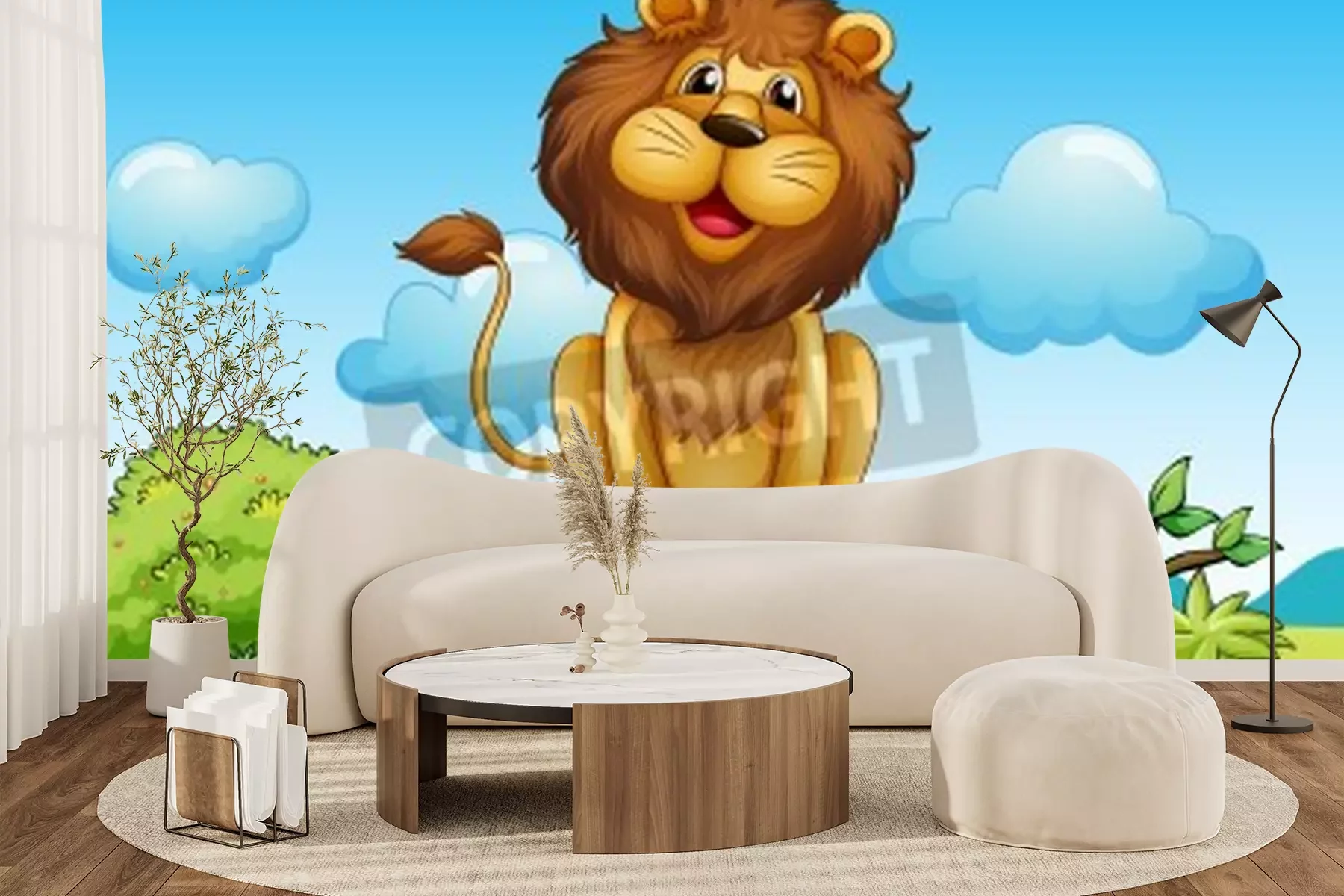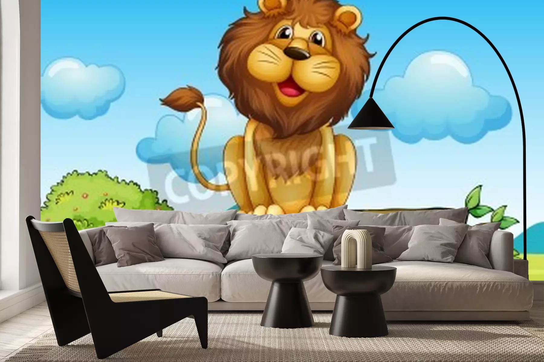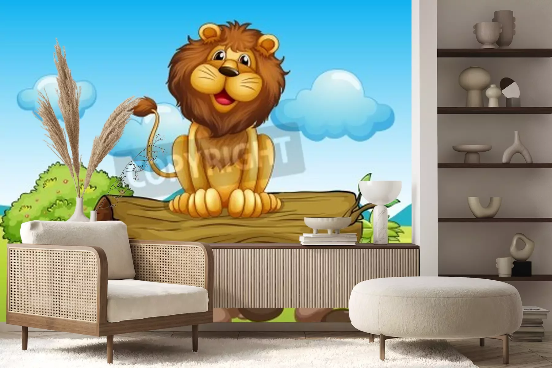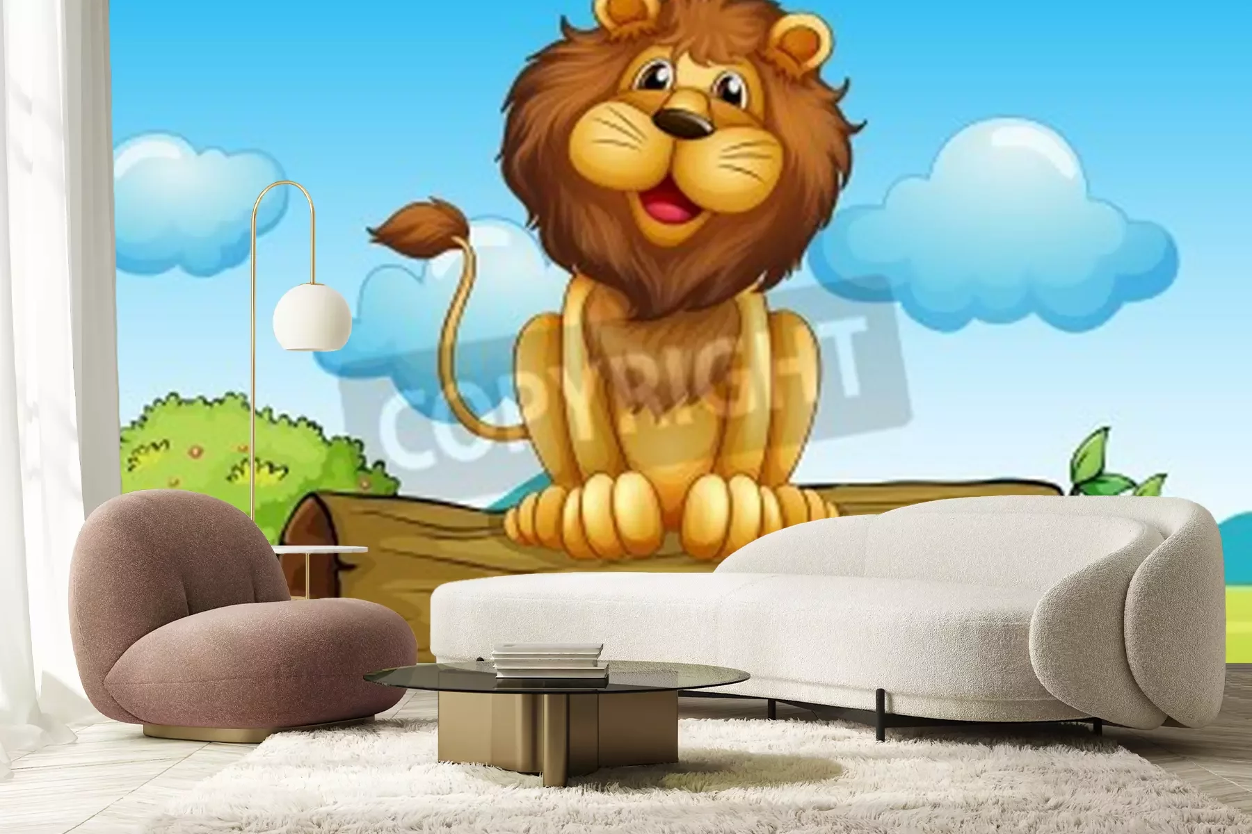 Sticker Illustration eines glücklichen Löwen auf einem Stamm eines Baumes