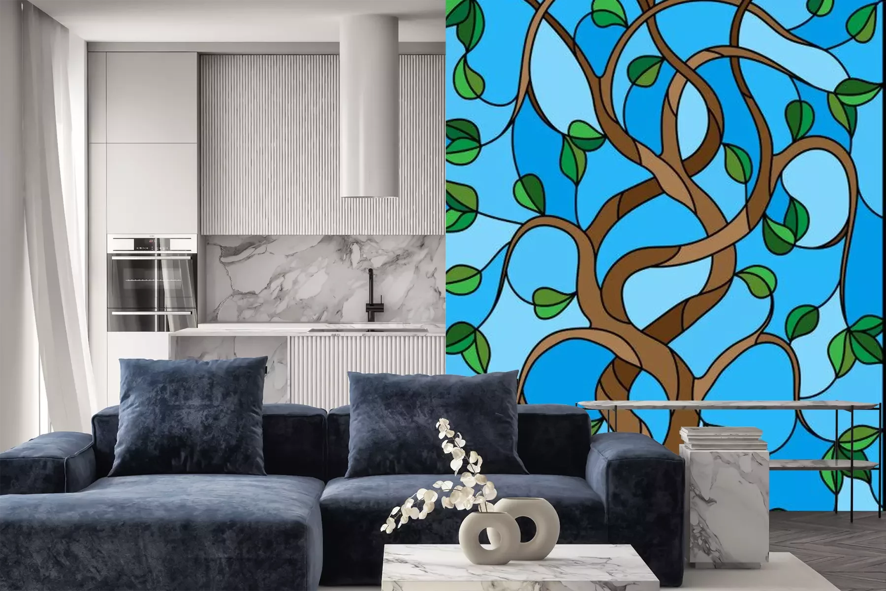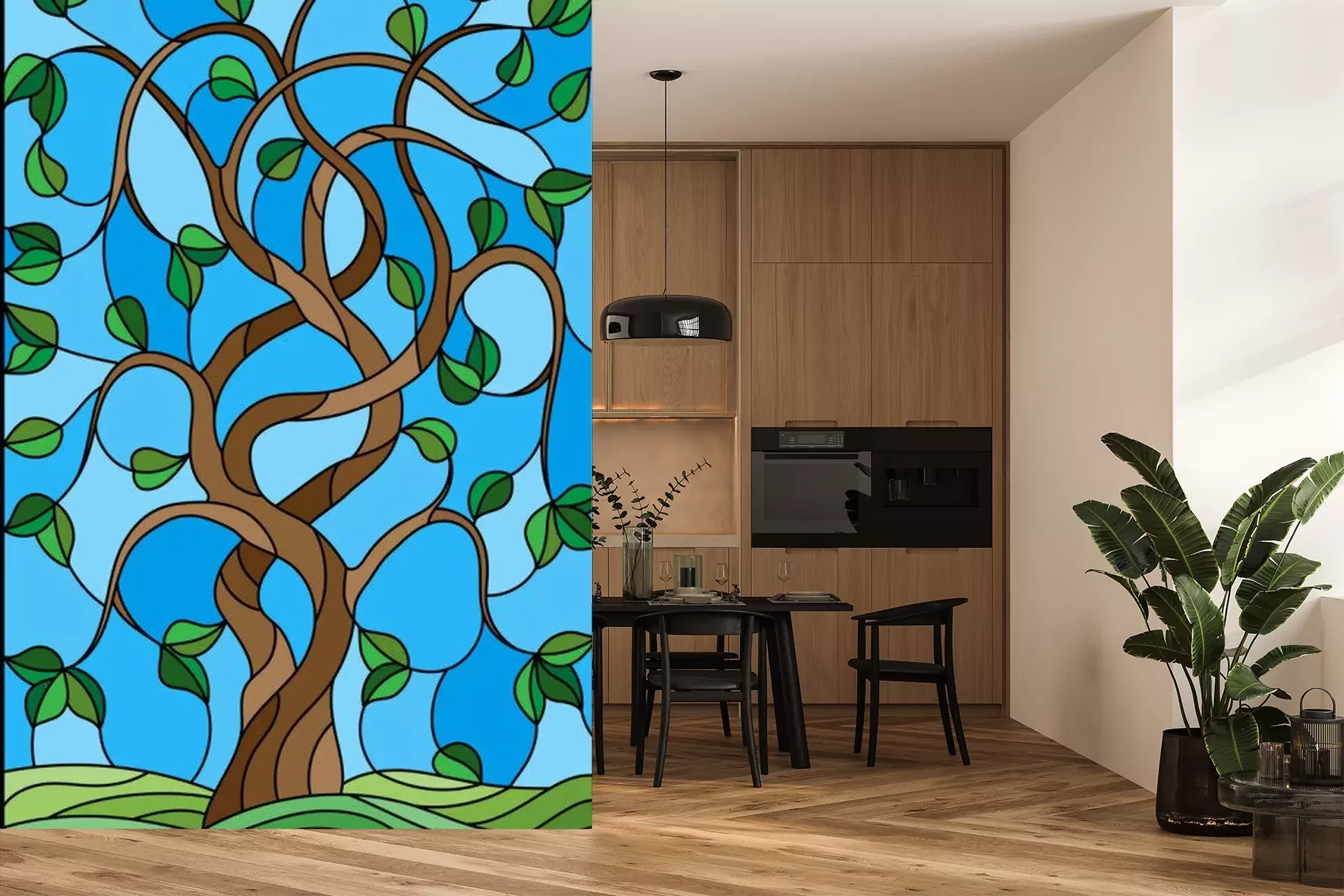 Sticker Illustration in der Buntglasart mit verdrehtem grünem Baum auf Himmelhintergrund