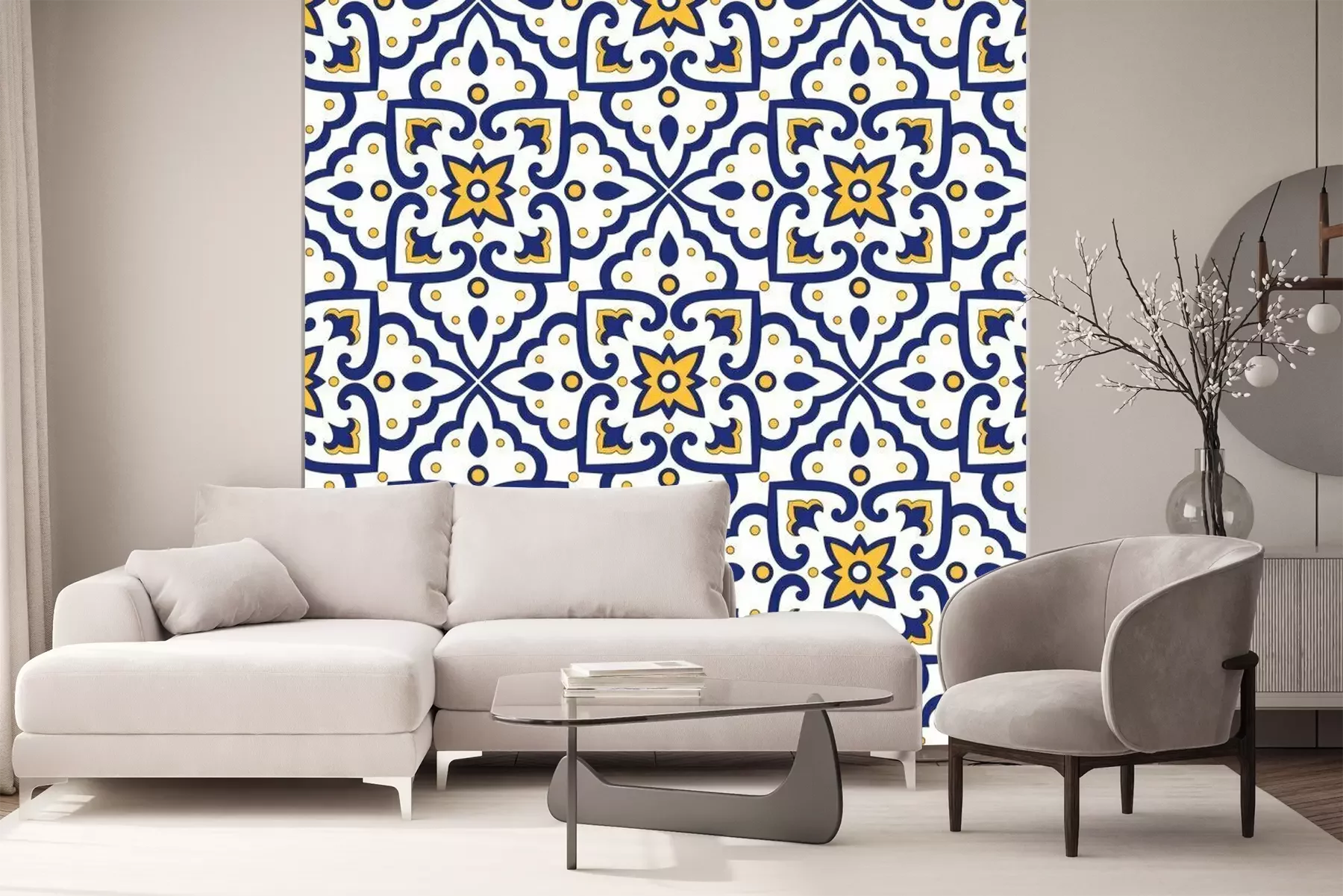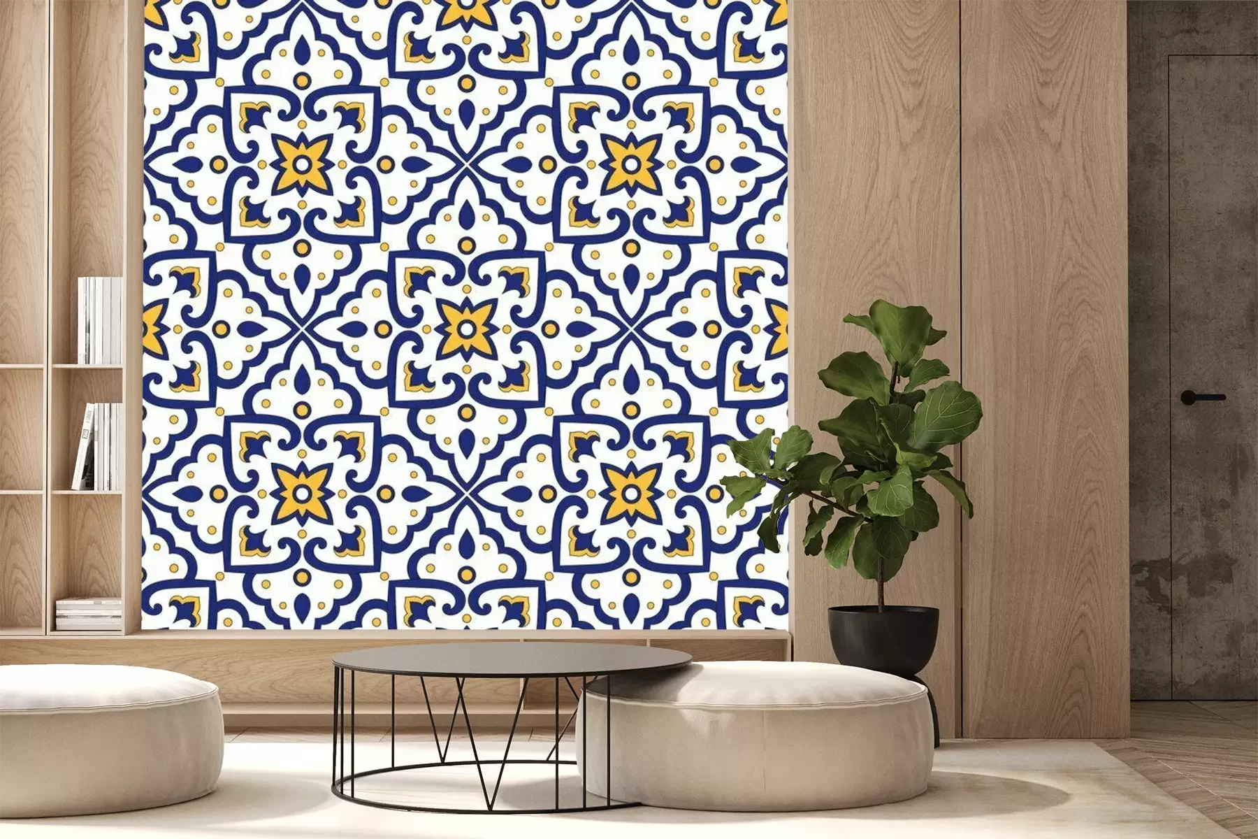 Sticker Italian tile pattern vector seamless with vintage ornaments. Portuguese azulejos, mexican talavera, italy sicily majolica motifs. Tiled texture for ceramic kitchen wall or bathroom mosaic floor.