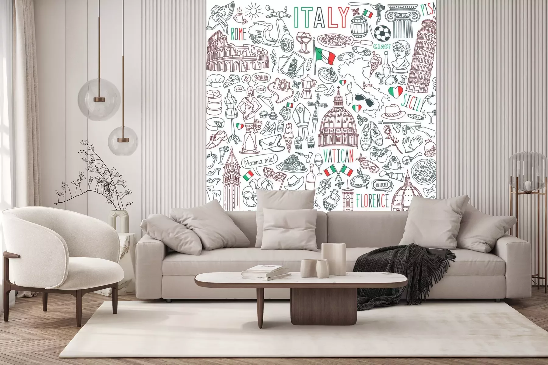 Sticker Italy doodle set. Famous landmarks and traditional Italian symbols - architecture, cuisine, Venice carnival. Objects isolated on white background