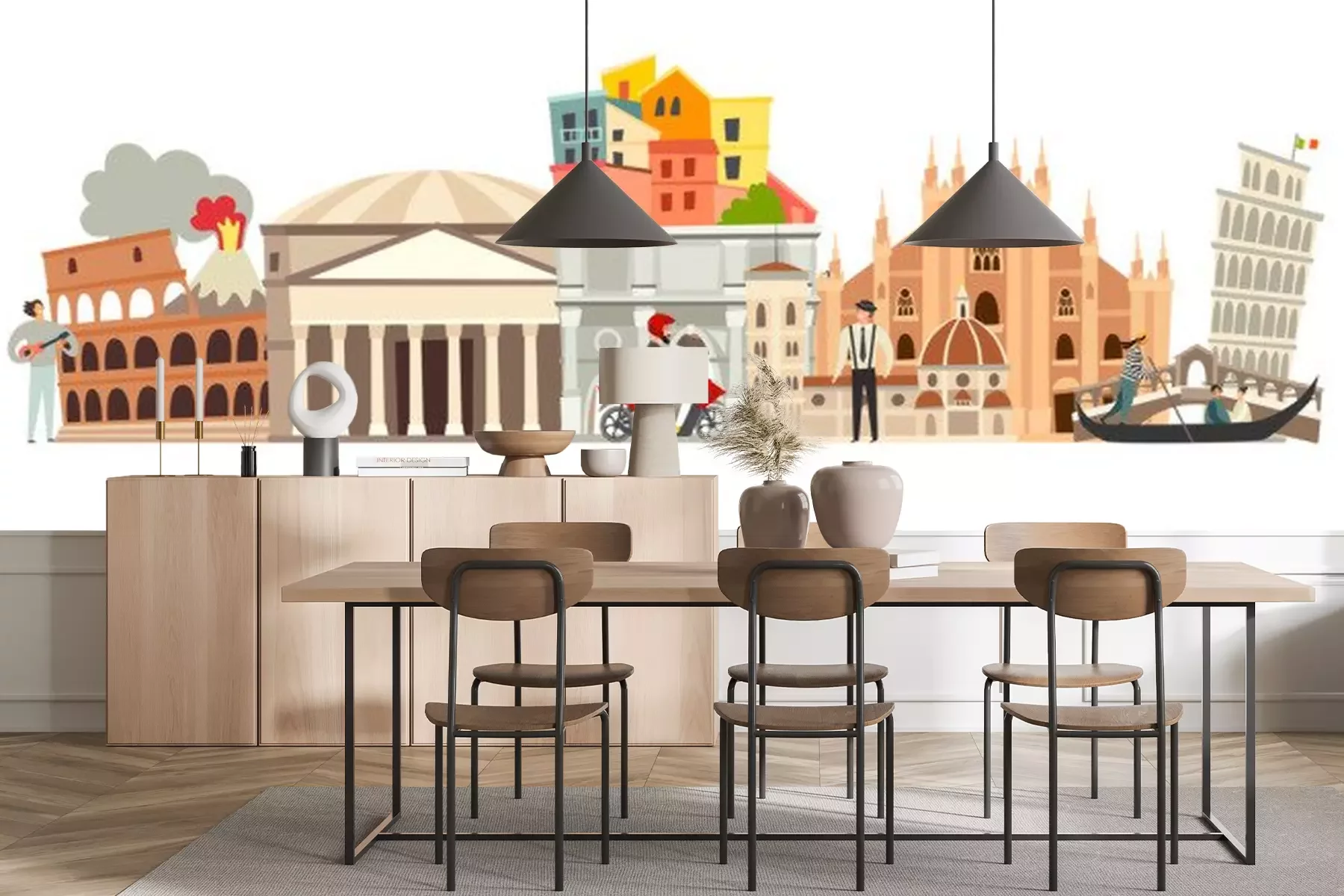 Sticker Italy skyline colorful background. Famous Italy building. Italy hand drawn vector illustration. Italian travel landmarks/attraction. Vector illustration isolated on white background