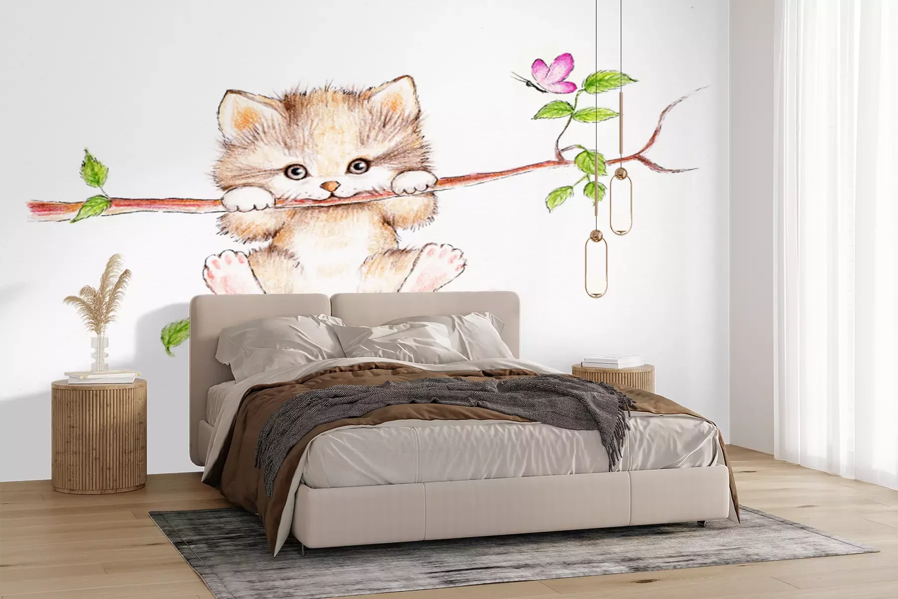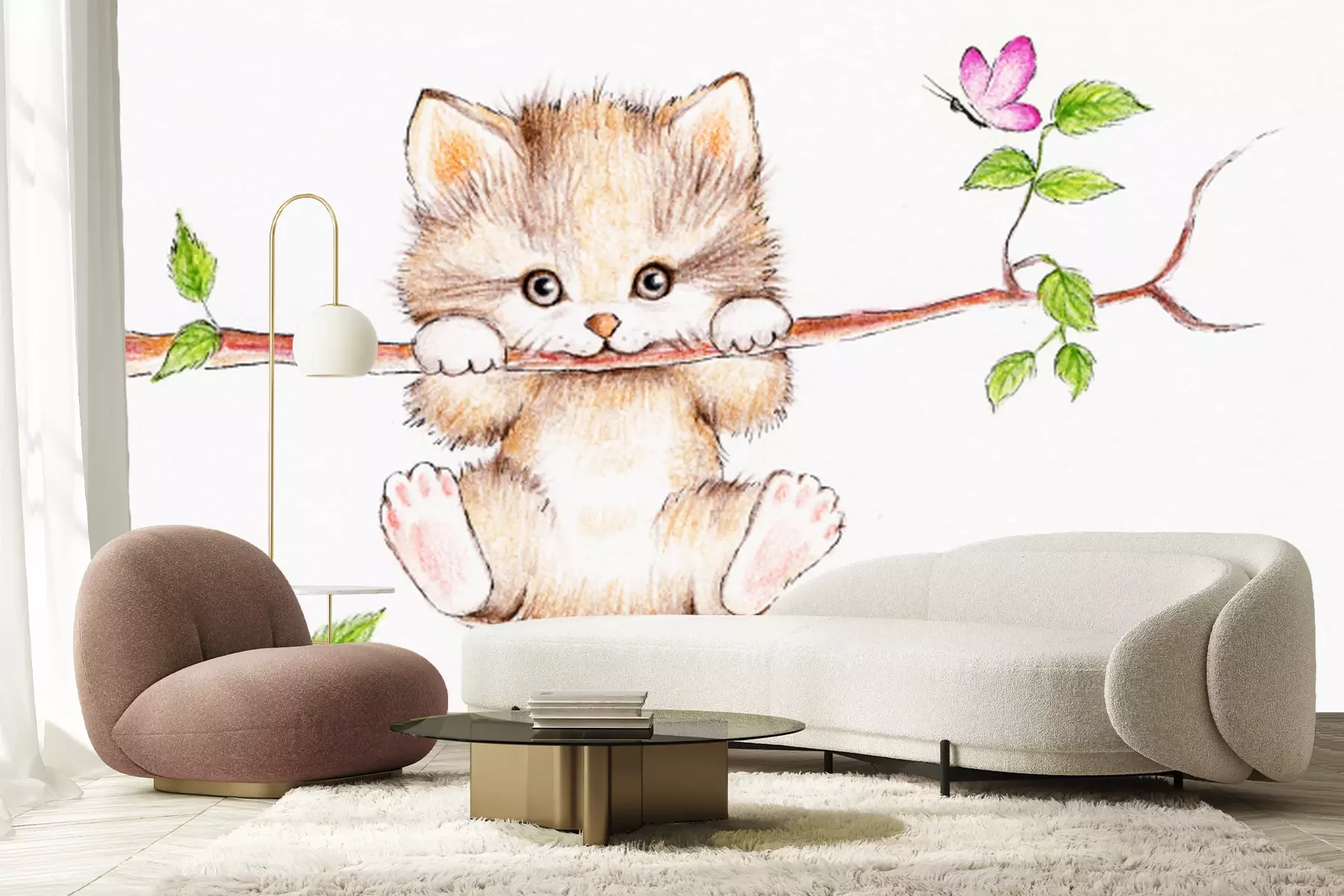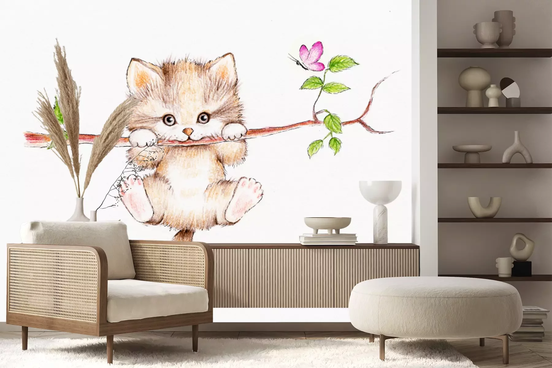 Sticker Katze für Kinder, die an einem Ast hängt, und ein rosa Schmetterling