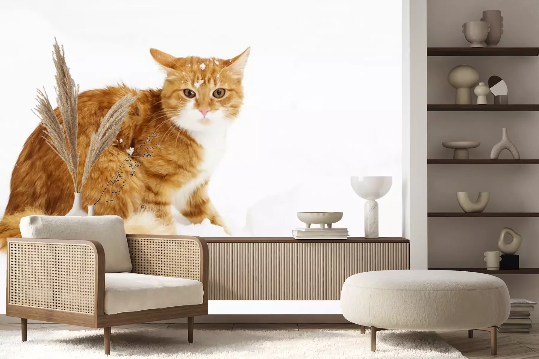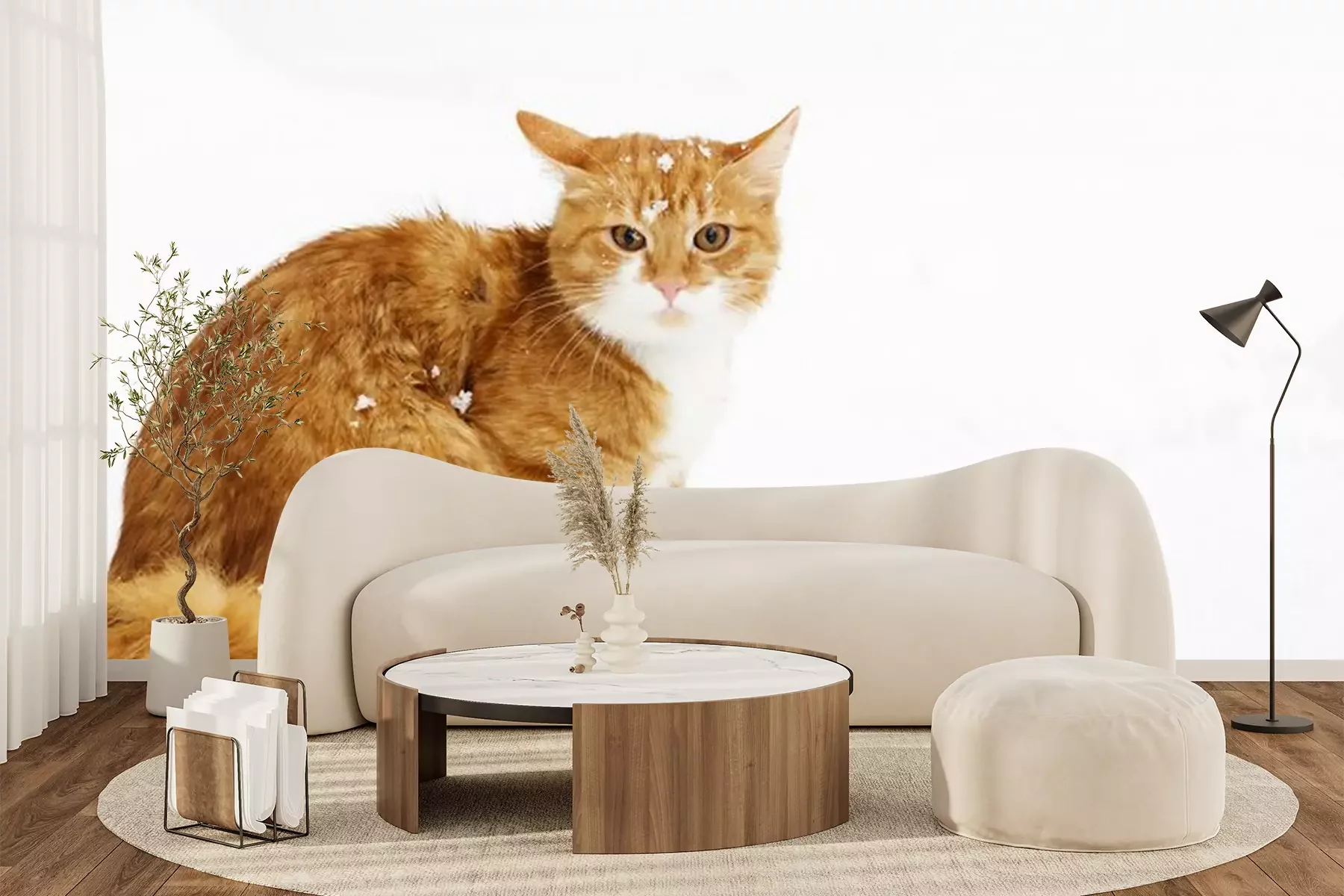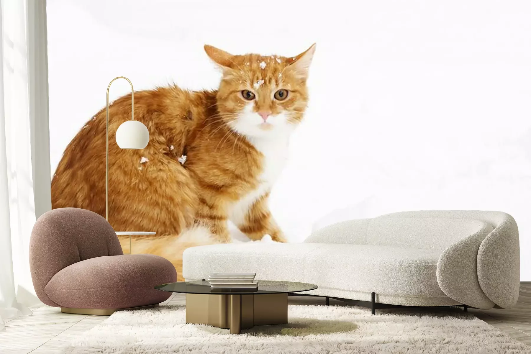 Sticker Katzen flauschige rote Katze mit Schnee auf dem Kopf