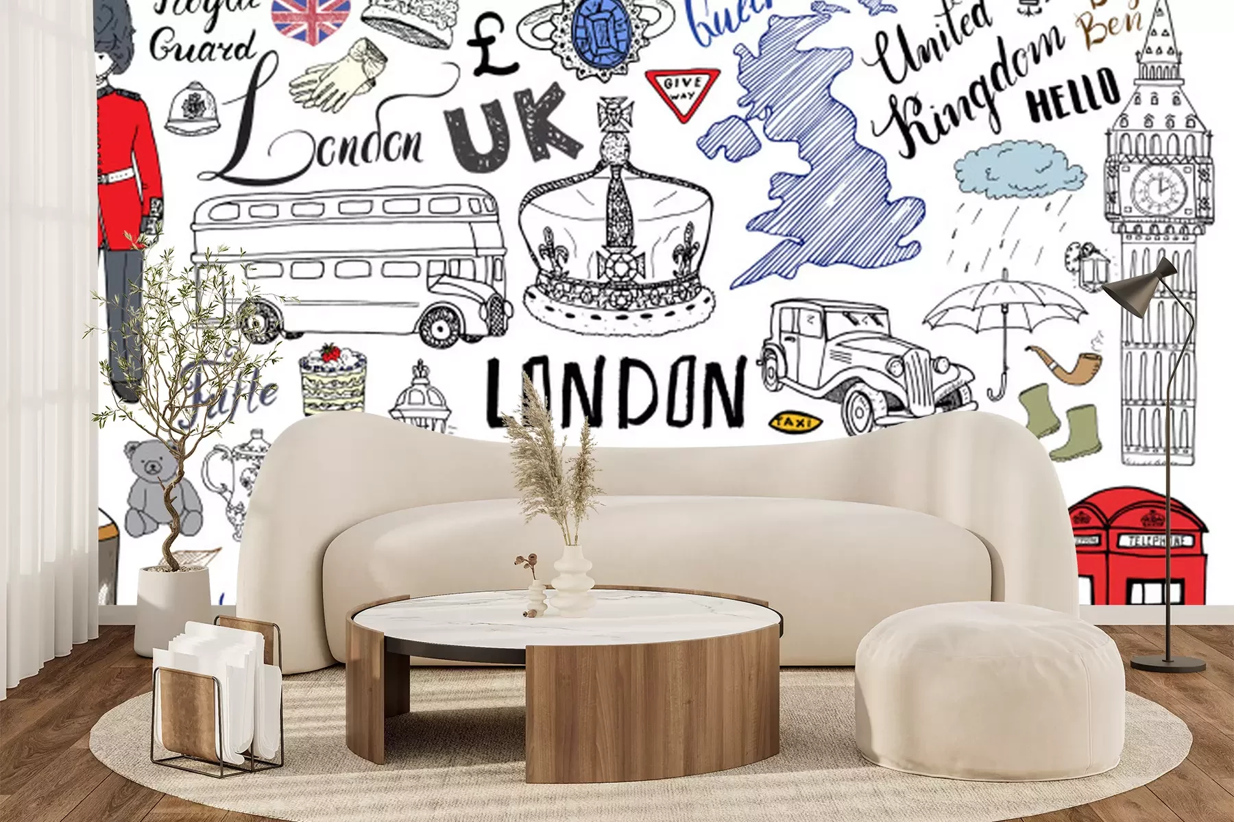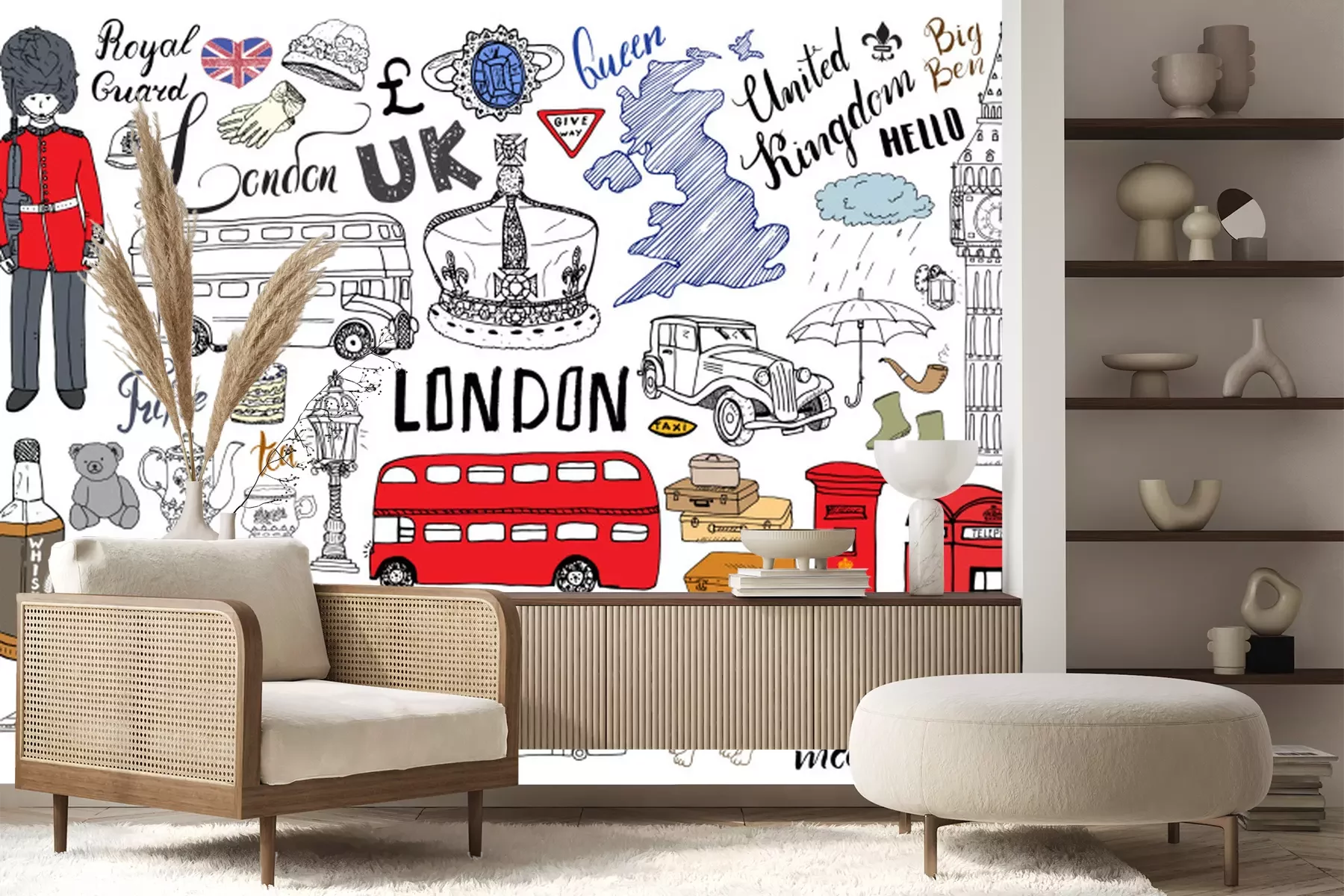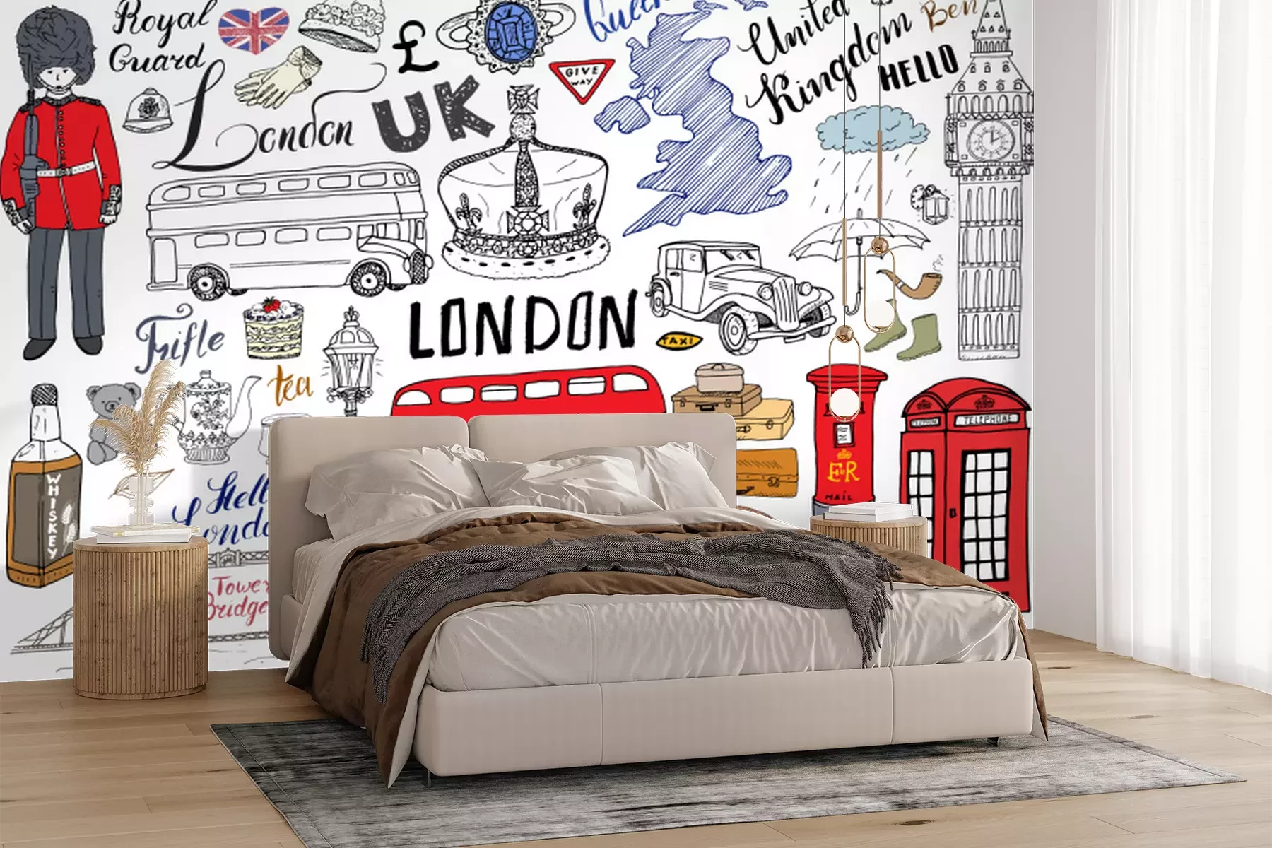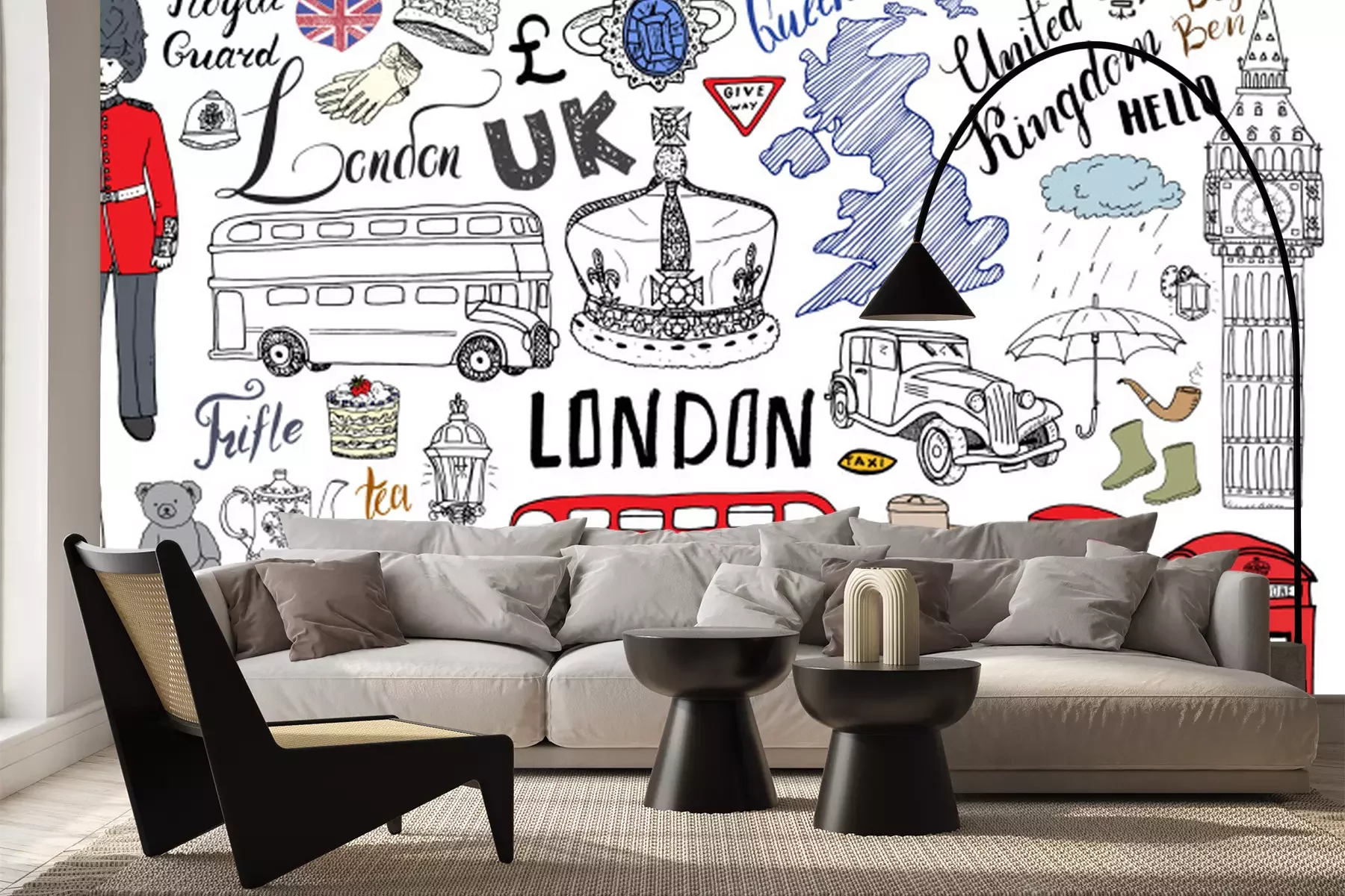 Sticker London-Stadt kritzelt Elementsammlung. Hand gezeichneter Satz mit, Turmbrücke, Krone, Big Ben, königlicher Schutz, roter Bus und Fahrerhaus, BRITISCHE Karte und Flagge, Teetopf, Beschriftung, Vektoril