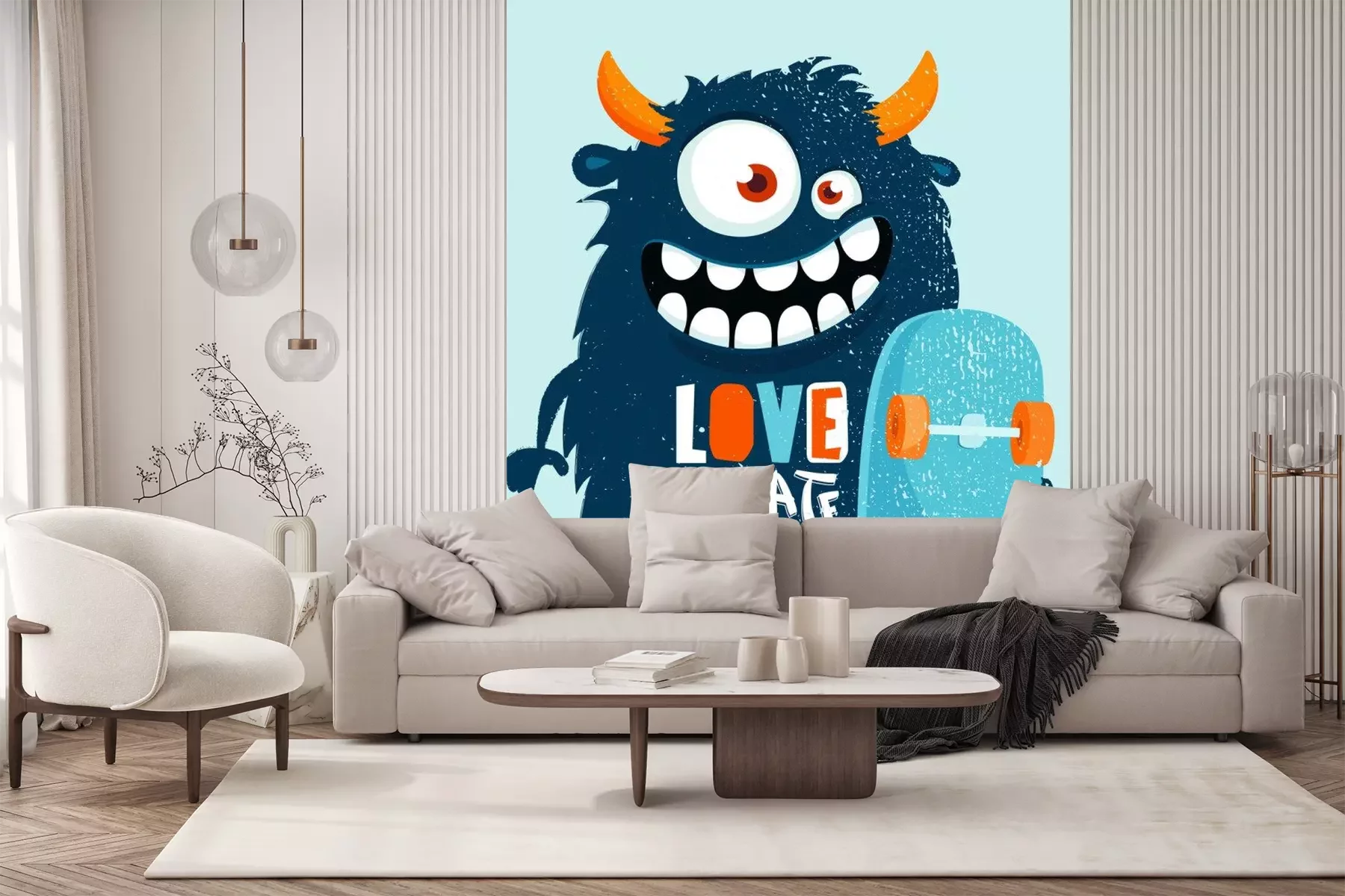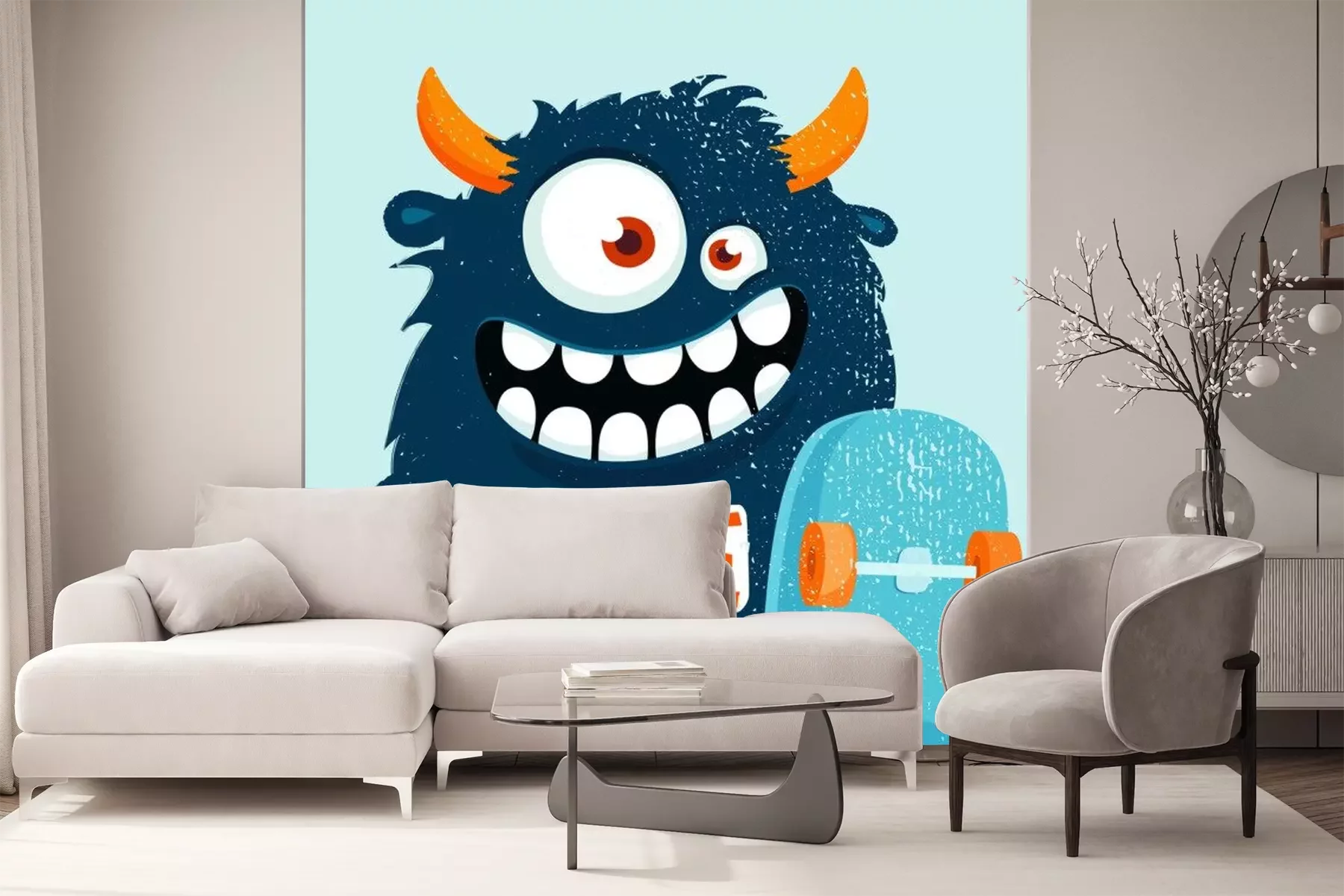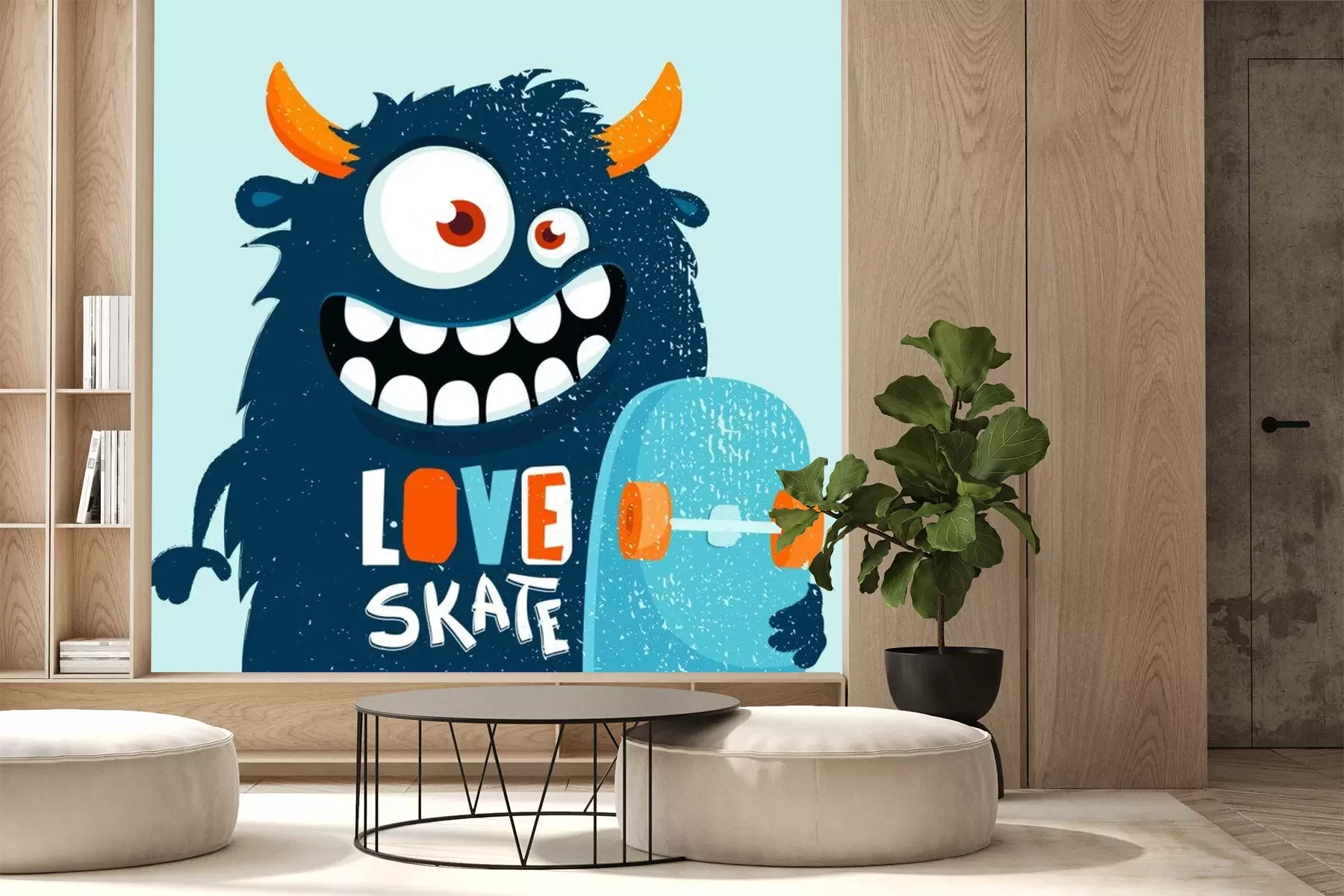 Sticker Lustiges Cartoon-Monster mit Skateboard.  Vektorillustration