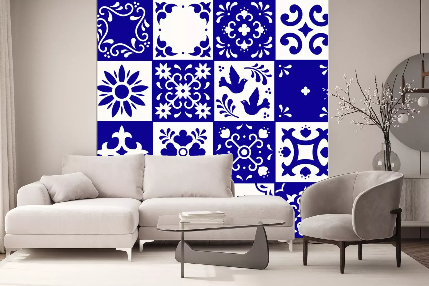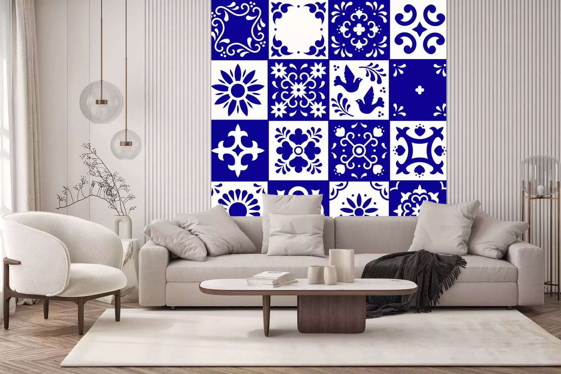 Sticker Mexican talavera pattern. Ceramic tiles with flower, leaves and bird ornaments in traditional style from Puebla. Mexico floral mosaic in navy blue and white. Folk art design.