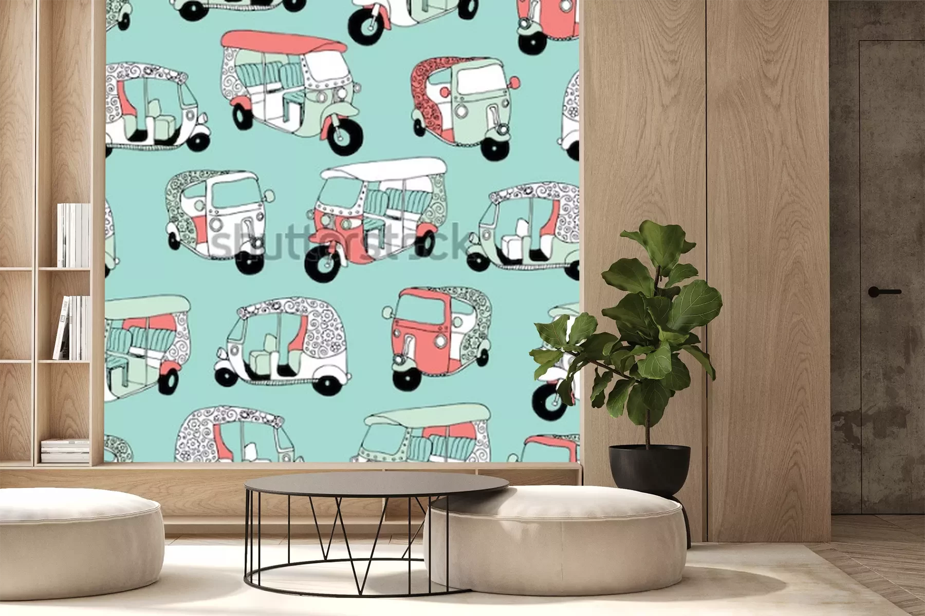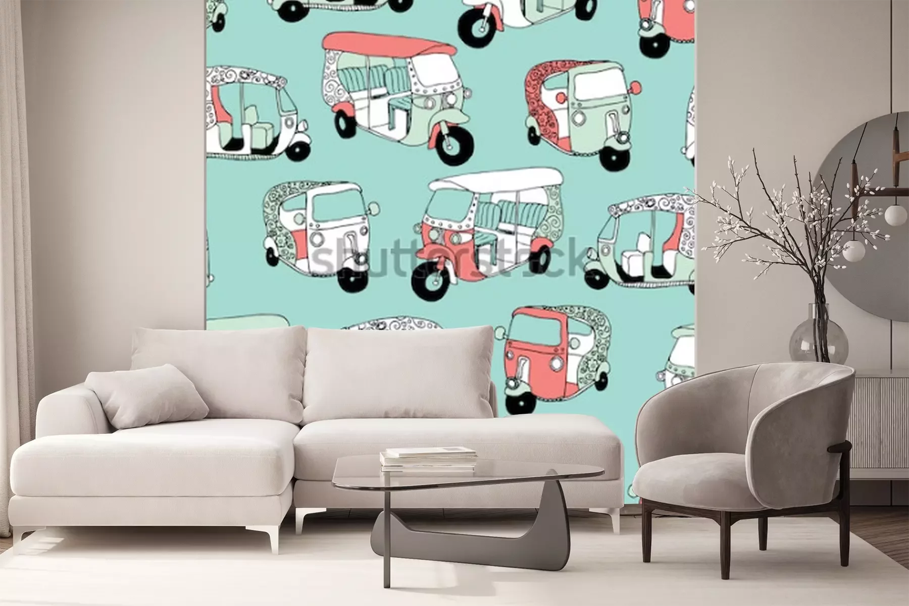 Sticker Nahtlose asiatische Transportikonen-Indien-Königin des Straßenrikschaillustrations-Hintergrundmusters im Vektor