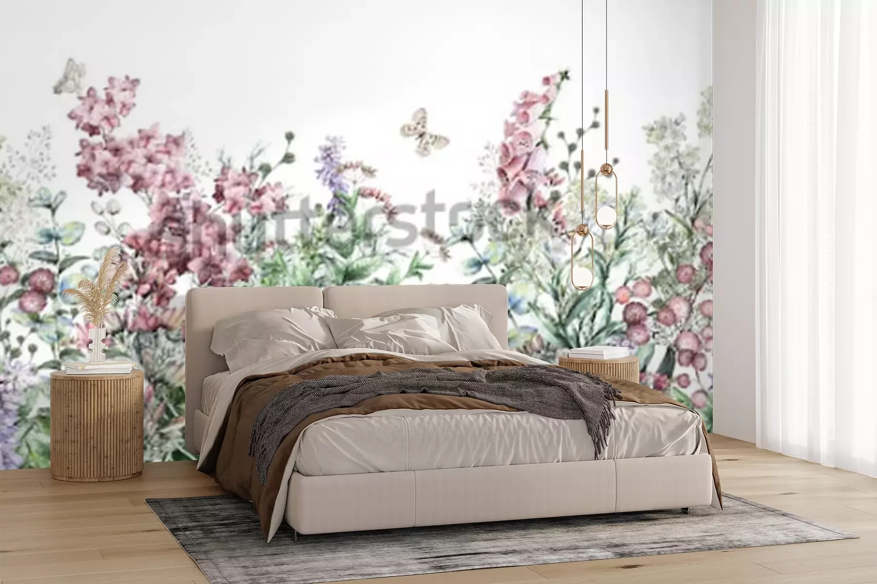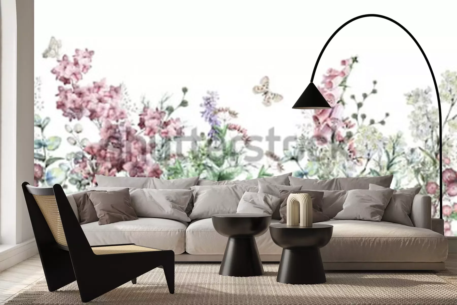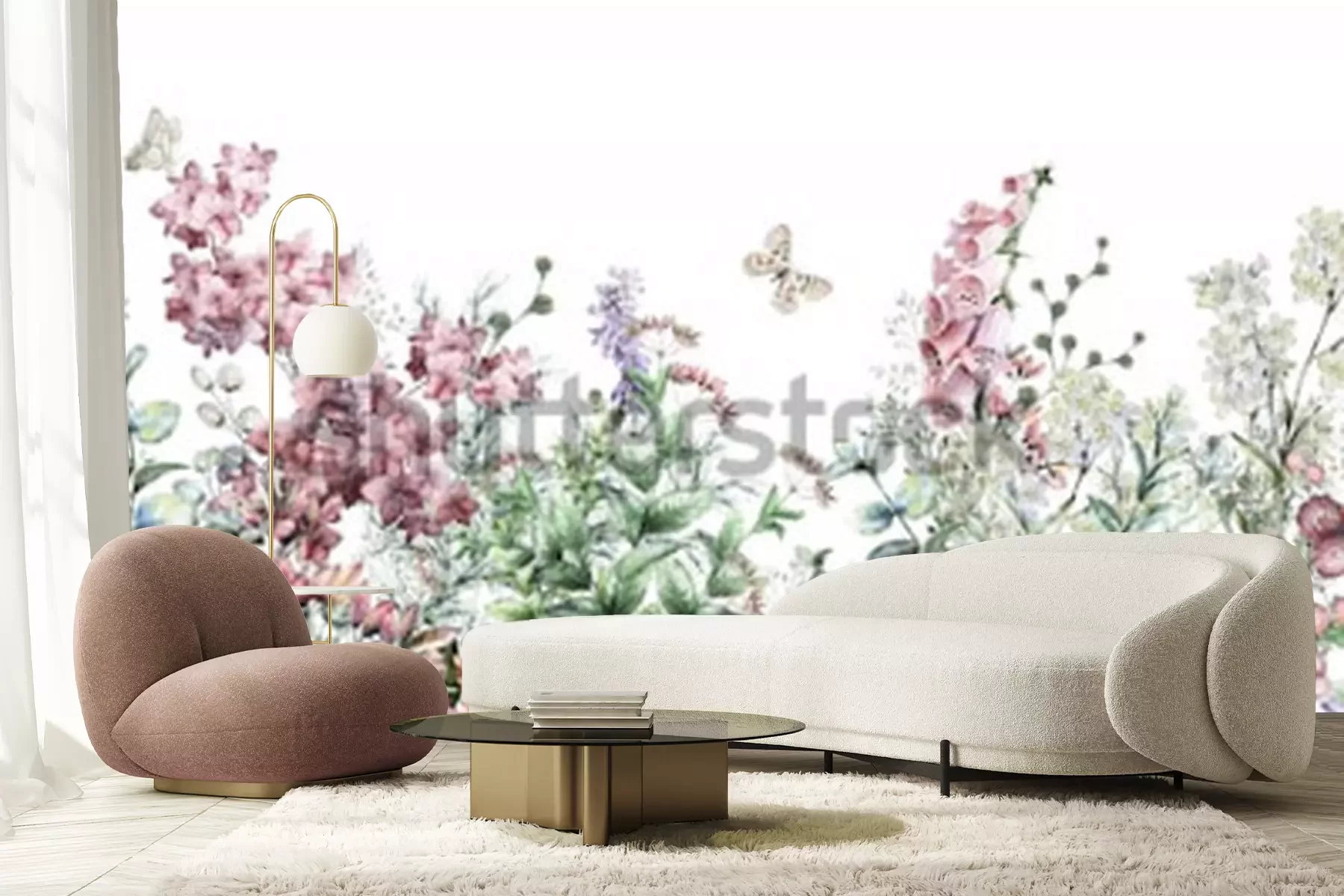 Sticker nahtlose Felge. Grenze mit Kräutern und wilden Blumen, Blättern. Botanische Illustration Bunte Illustration auf weißem Hintergrund. Frühlingszusammensetzung mit Schmetterling