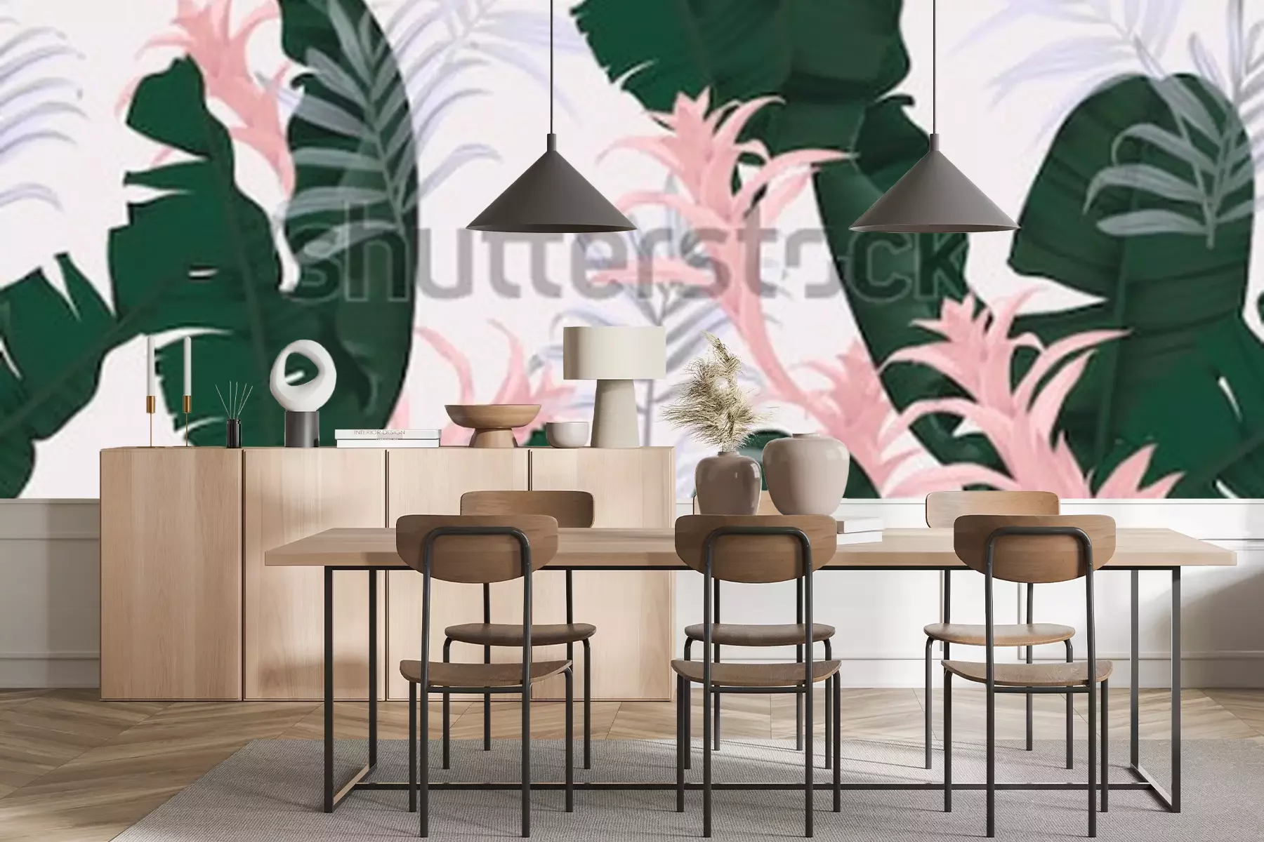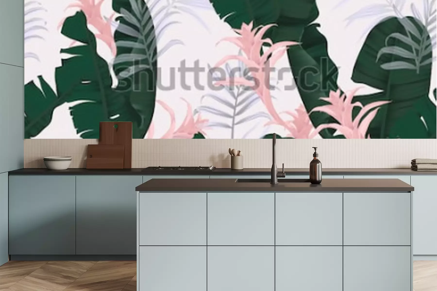 Sticker Nahtloses mit Blumenmuster, grüne Bananenblätter, rosa Bromeliaceaeanlage und Palmblätter auf hellgrauem Hintergrund, Pastellweinlesethema