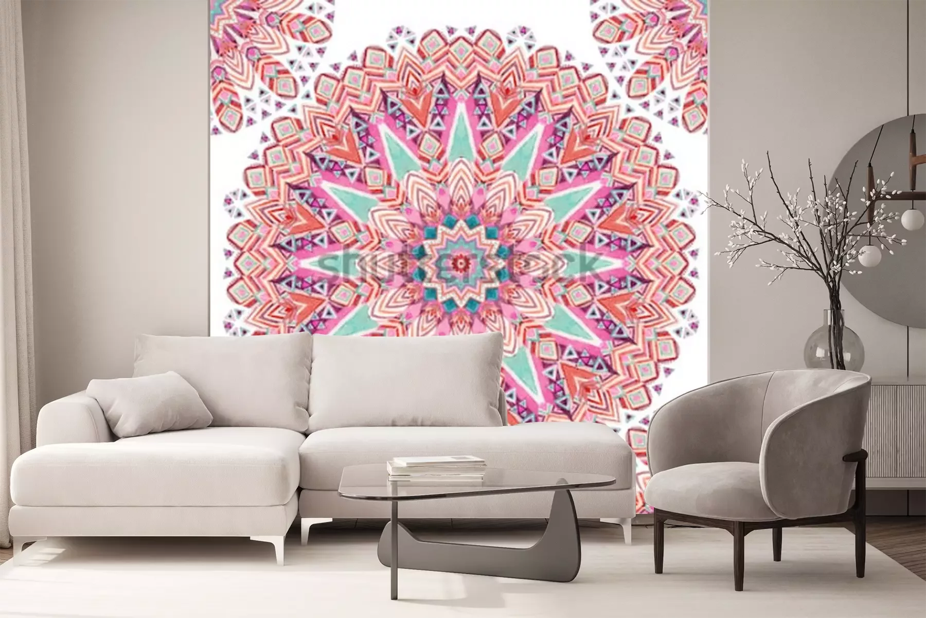 Sticker Nahtloses Muster der ethnischen aufwändigen Federn des Aquarells abstrakten Mandala. Schnüren Sie sich Muster mit Stammes- Federn, geometrisches Muster auf weißem Hintergrund. Handgemalte Kunstillustr