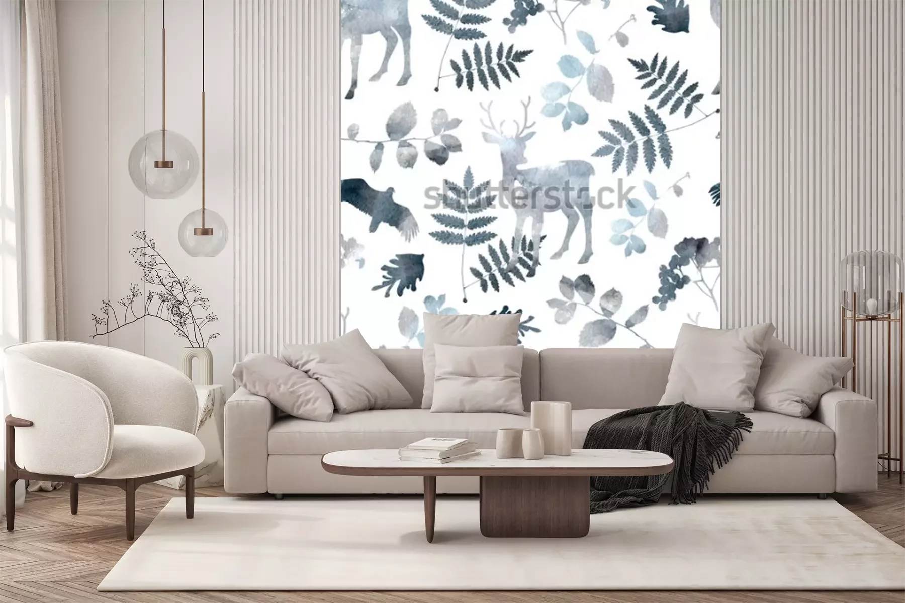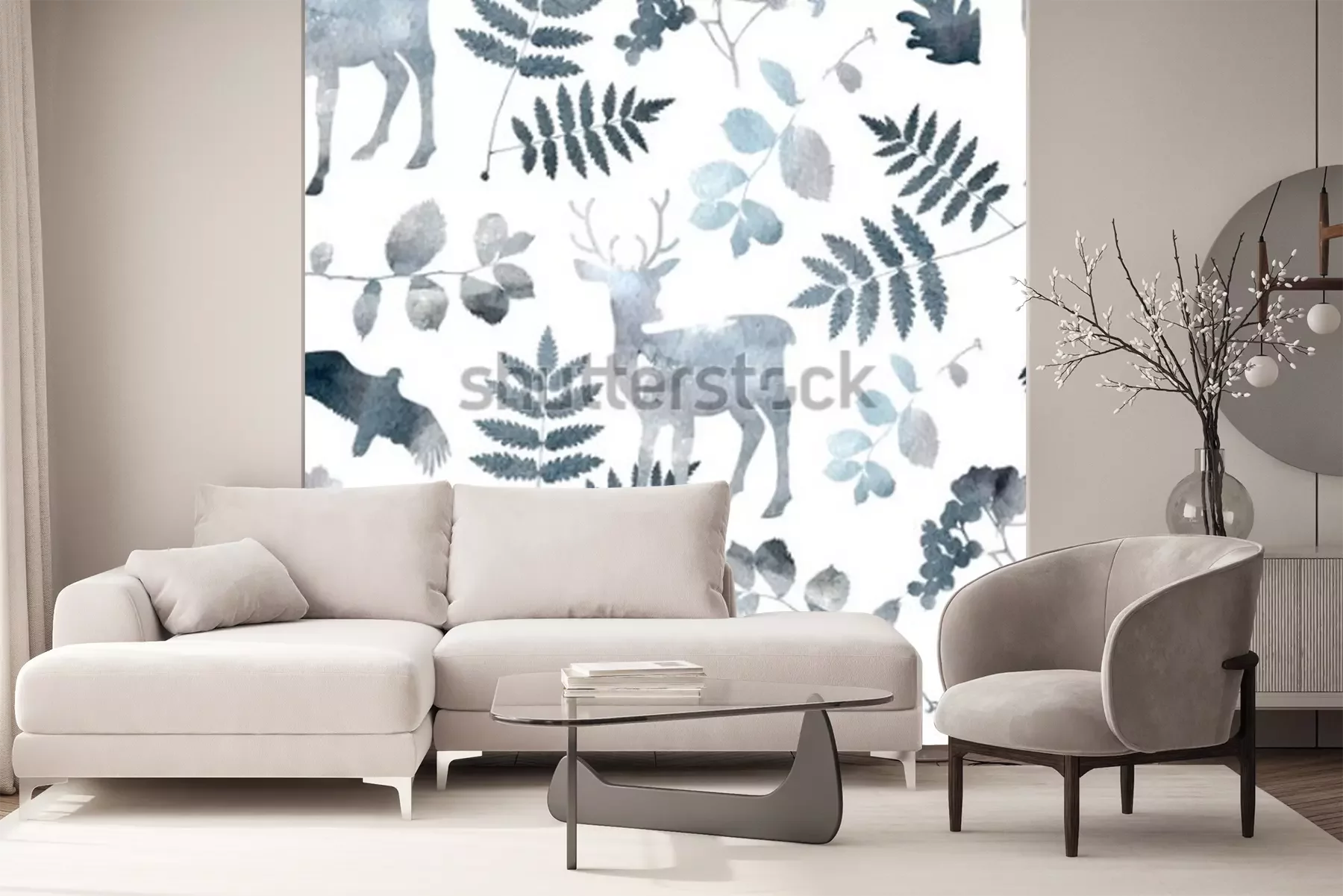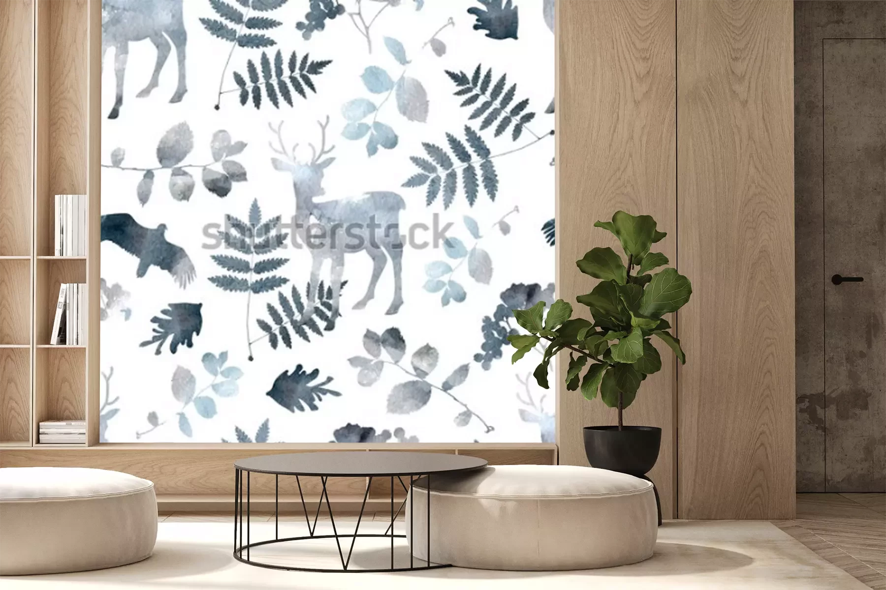 Sticker Nahtloses Muster des Nordwaldes mit Rotwild, Vögel, Blattelemente. Aquarell von Hand gezeichnet