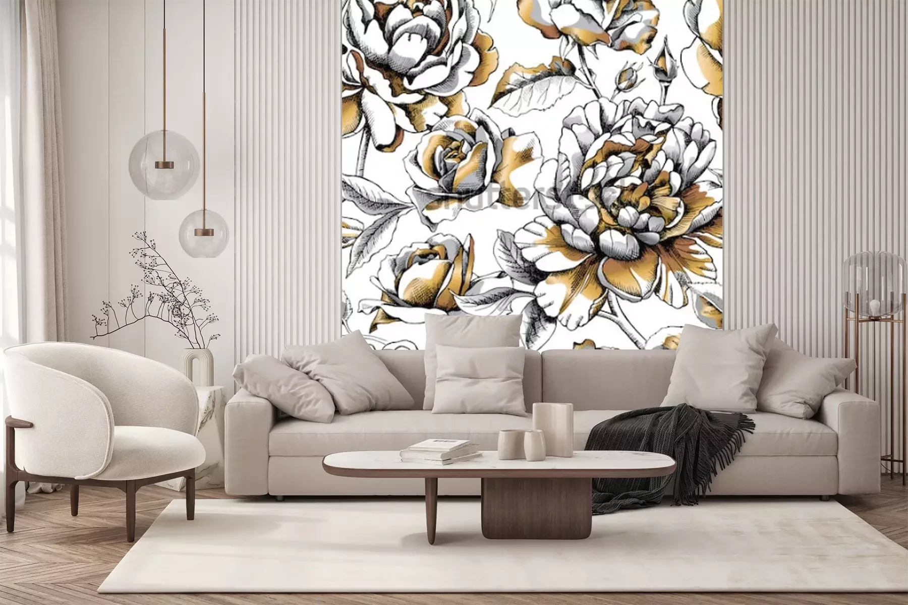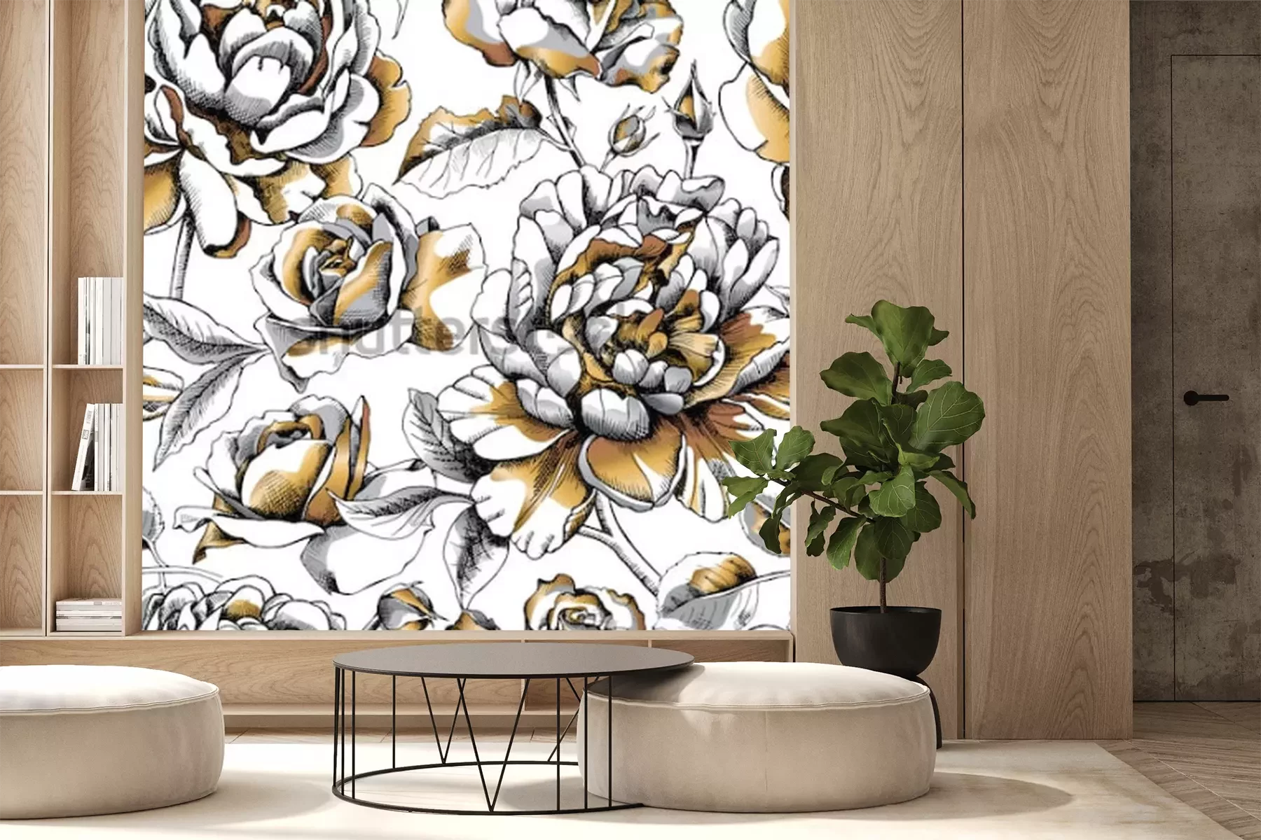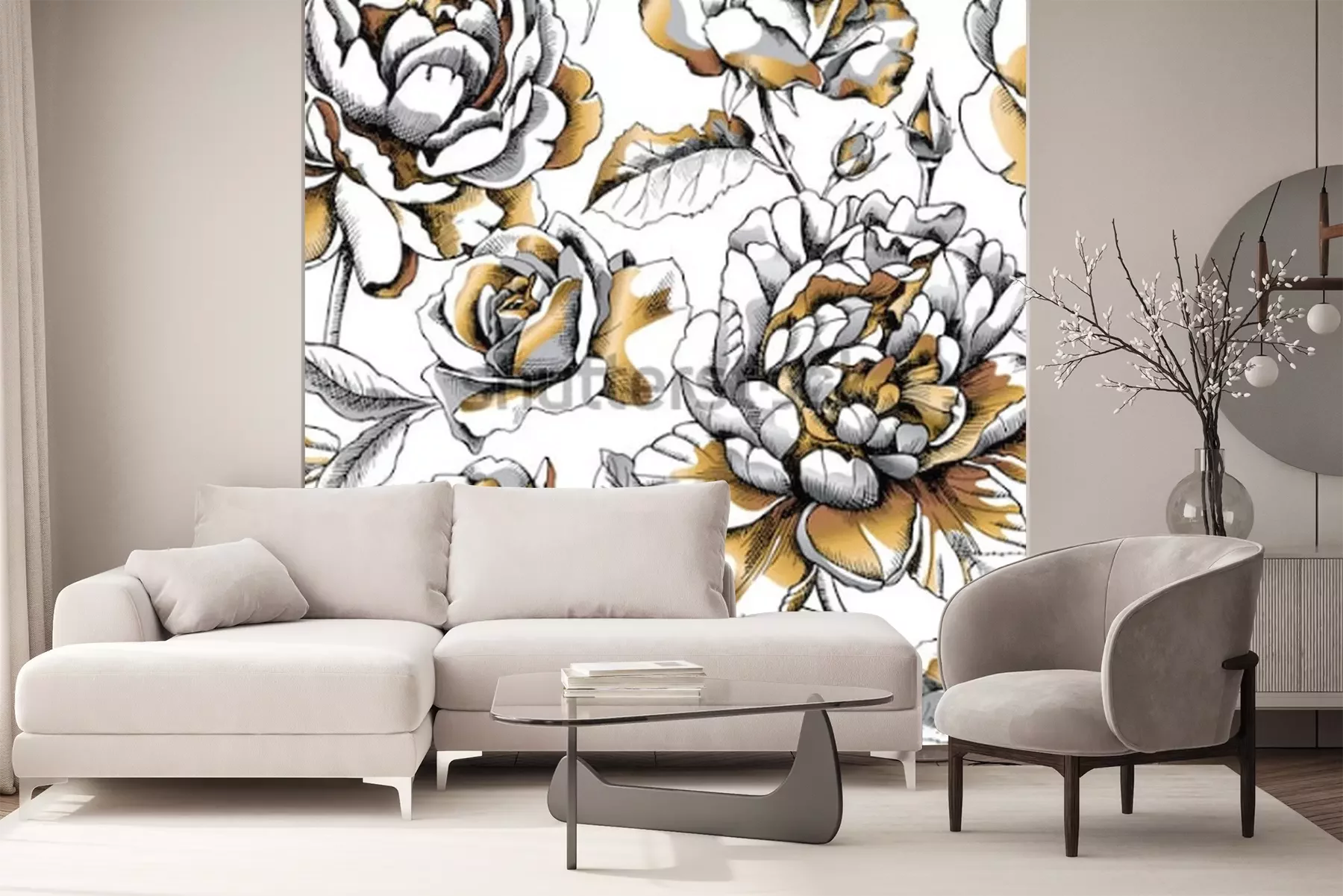 Sticker Nahtloses Muster mit Bildgoldpfingstrose und -rose auf einem weißen Hintergrund. Vektor-Illustration