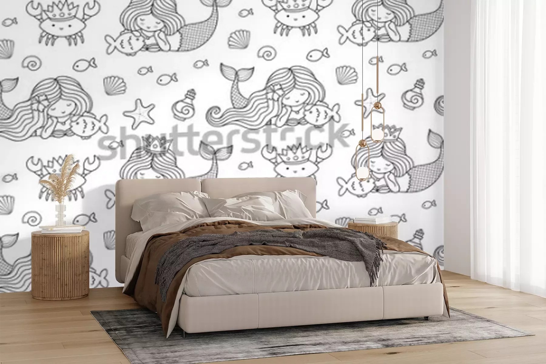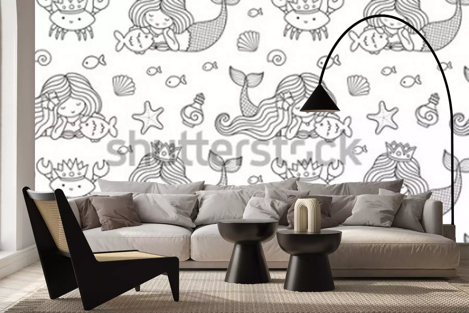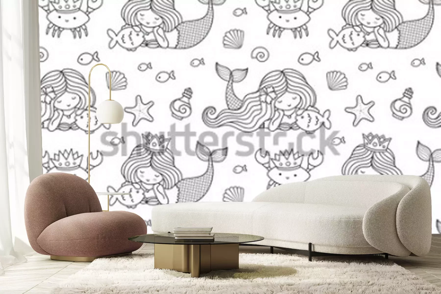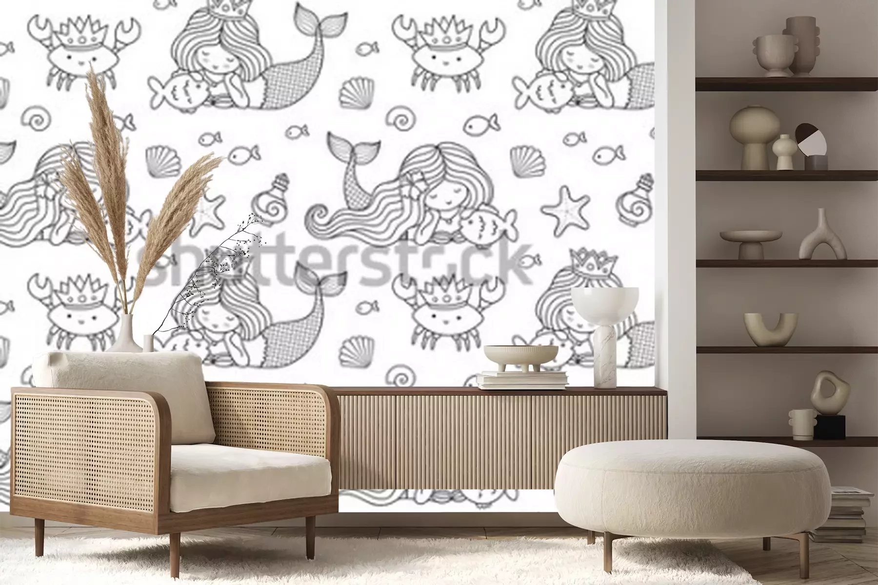 Sticker Nahtloses Muster mit kleiner liegender Meerjungfrau, großem Fisch, Krabbe, Krone. Druckdesign für Malbuch, Textil, Stoff, Poster, Dekor, Grußkarten, Papier, Kleidung, Tapete. Vektorillustration
