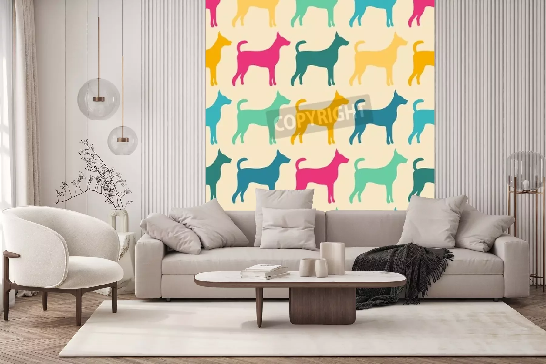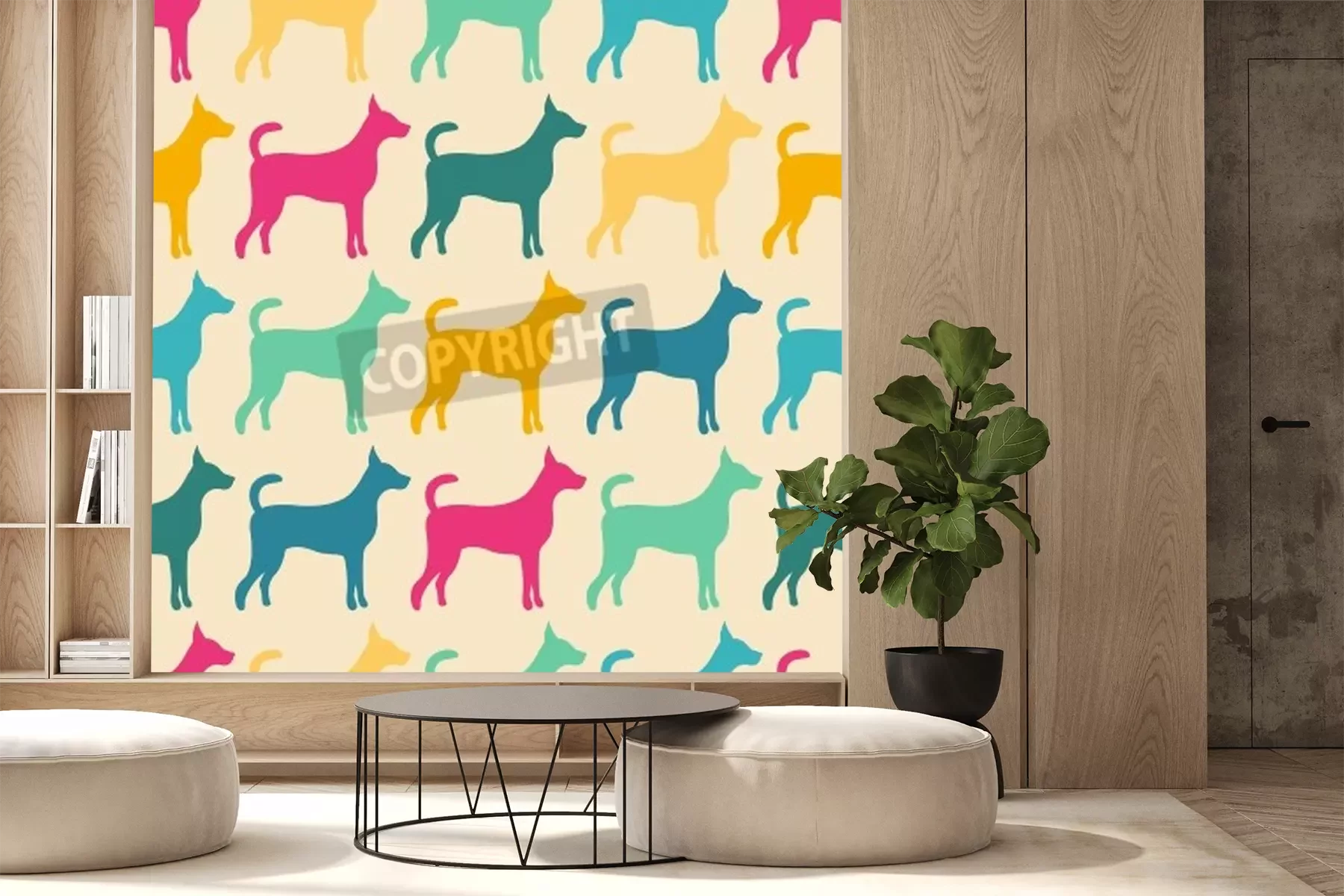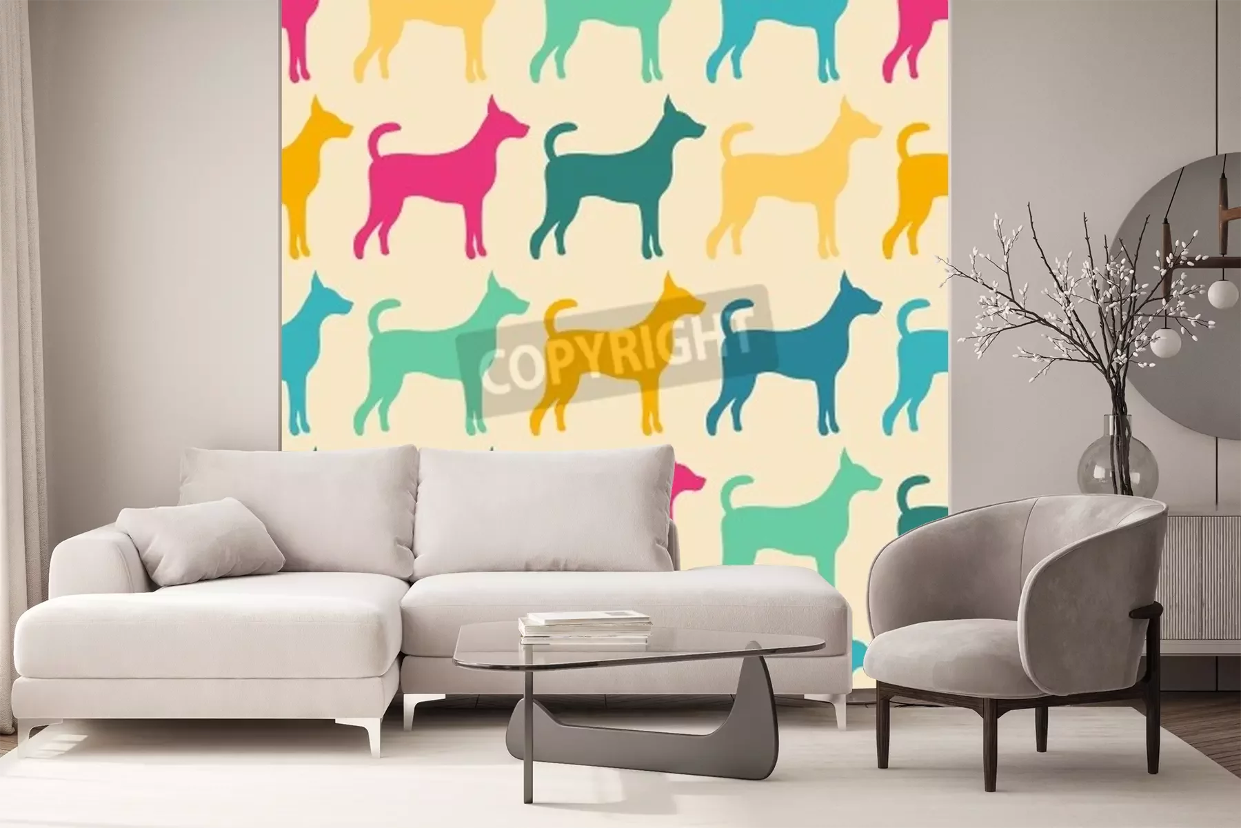 Sticker Nahtloses Vektormuster des lustigen Tieres der Hundeschattenbilder. Endlose Textur kann zum Drucken auf Stoff, Webseitenhintergrund und Papier oder Einladung verwendet werden. Doggystyle. Bunt