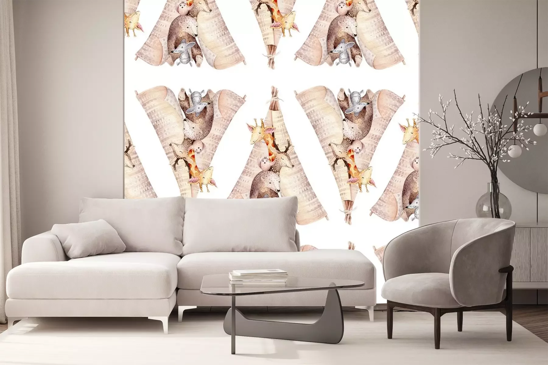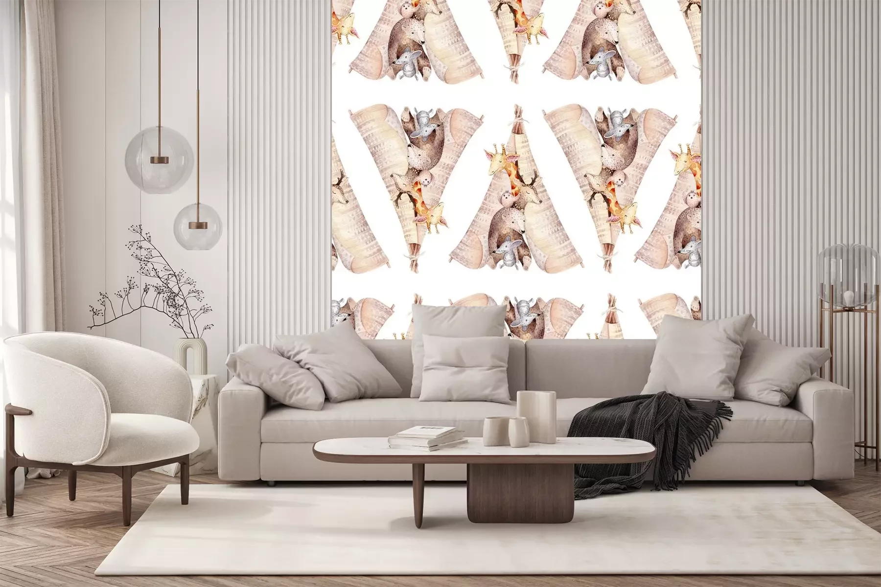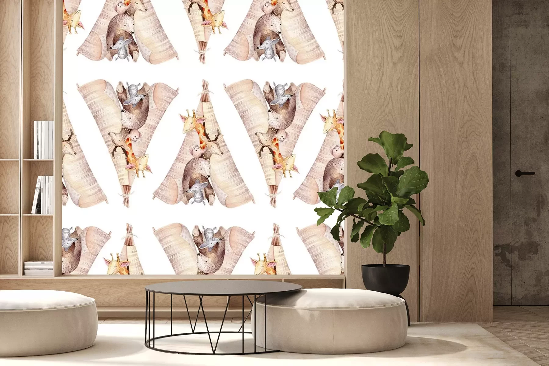 Sticker Netter Familienbaby Raccon, Rotwild und Häschen. Tierkindergartengiraffe und Bär lokalisierten Illustration. Aquarell boho Raccon Zeichnung Kinderzimmer nahtlose Muster. Kinder Hintergrund, Kindergart
