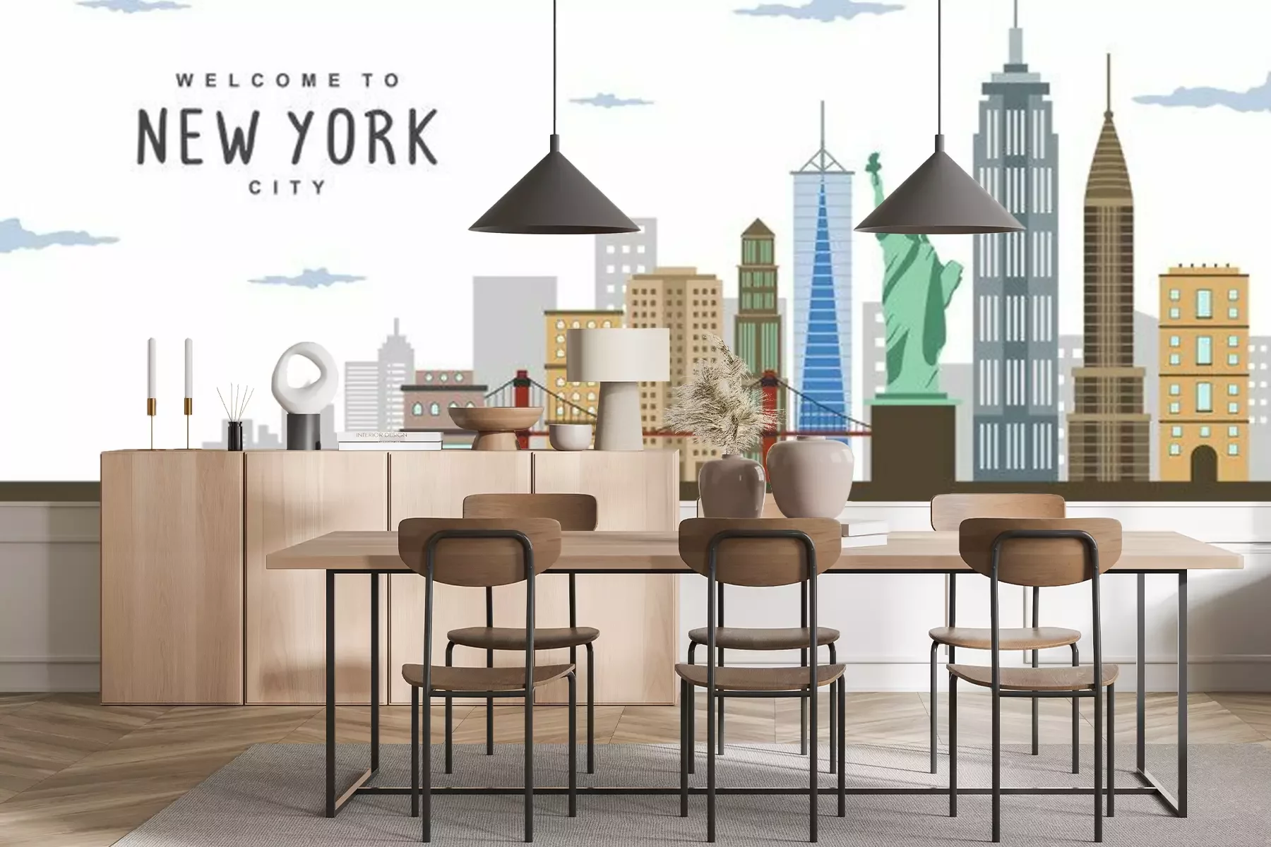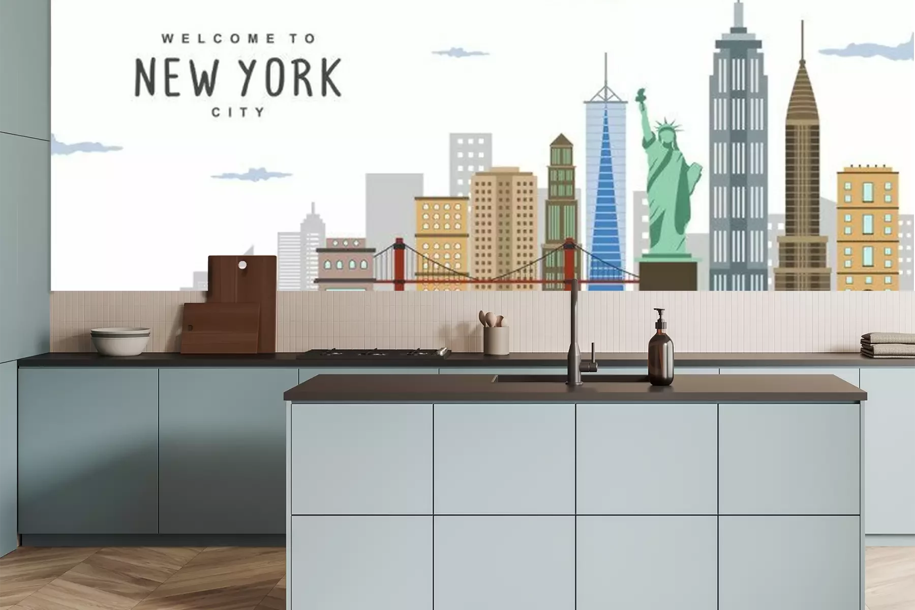 Sticker New York City panorama landscape scene with Brooklyn Bridge, The Statue of Liberty and wide angle view of the Lower Manhattan. Beautiful view of metropolitan. Landmarks of New York City, USA