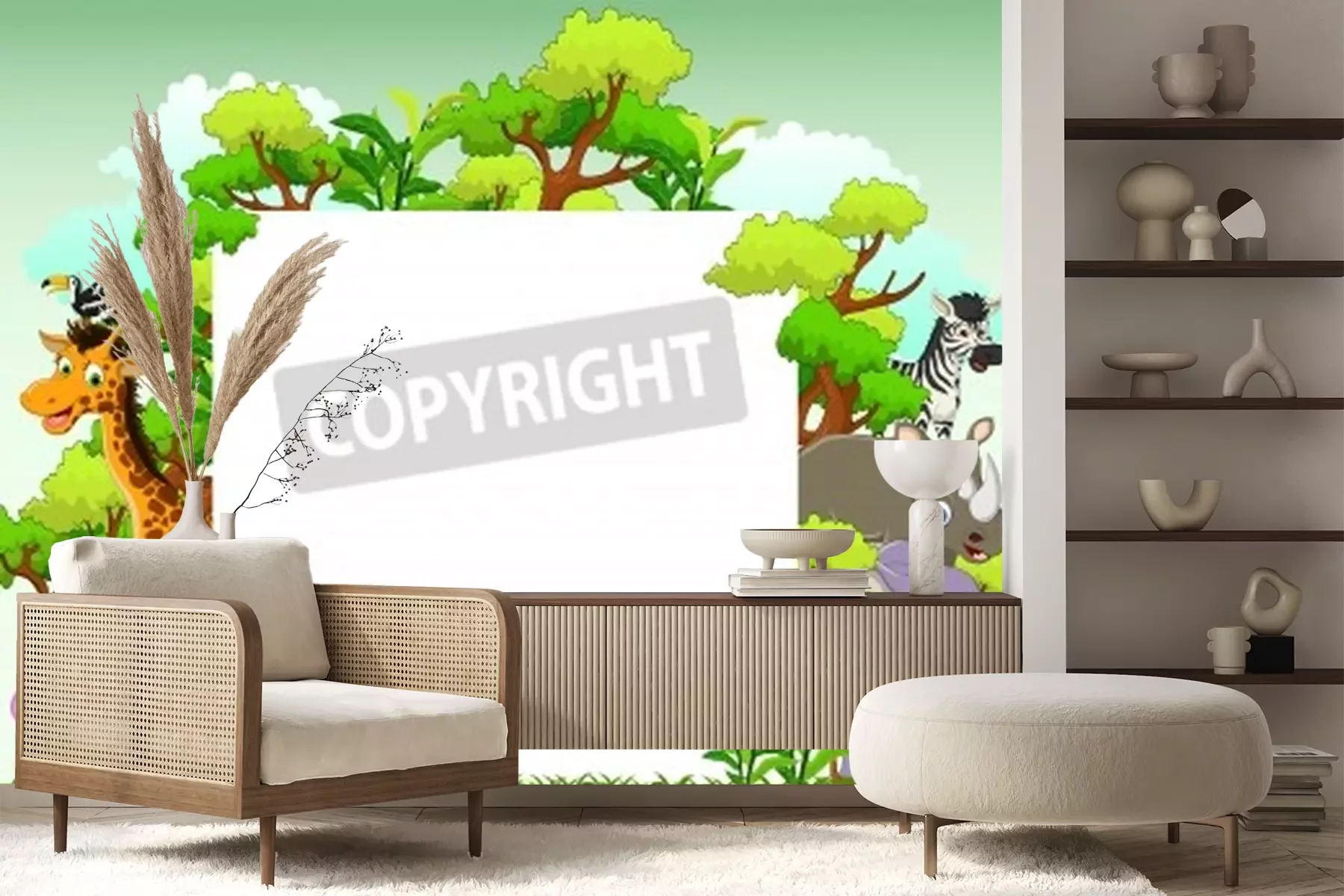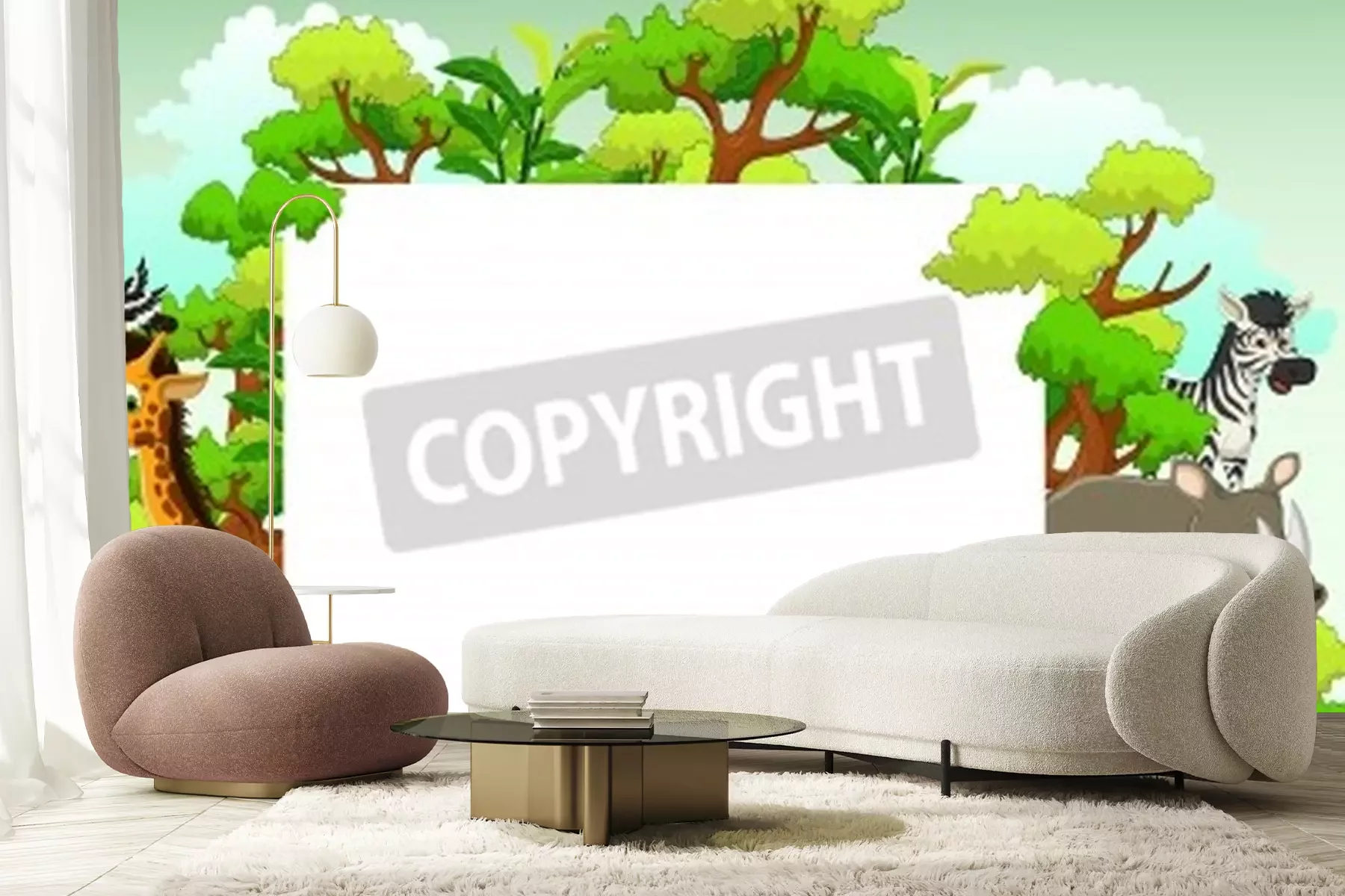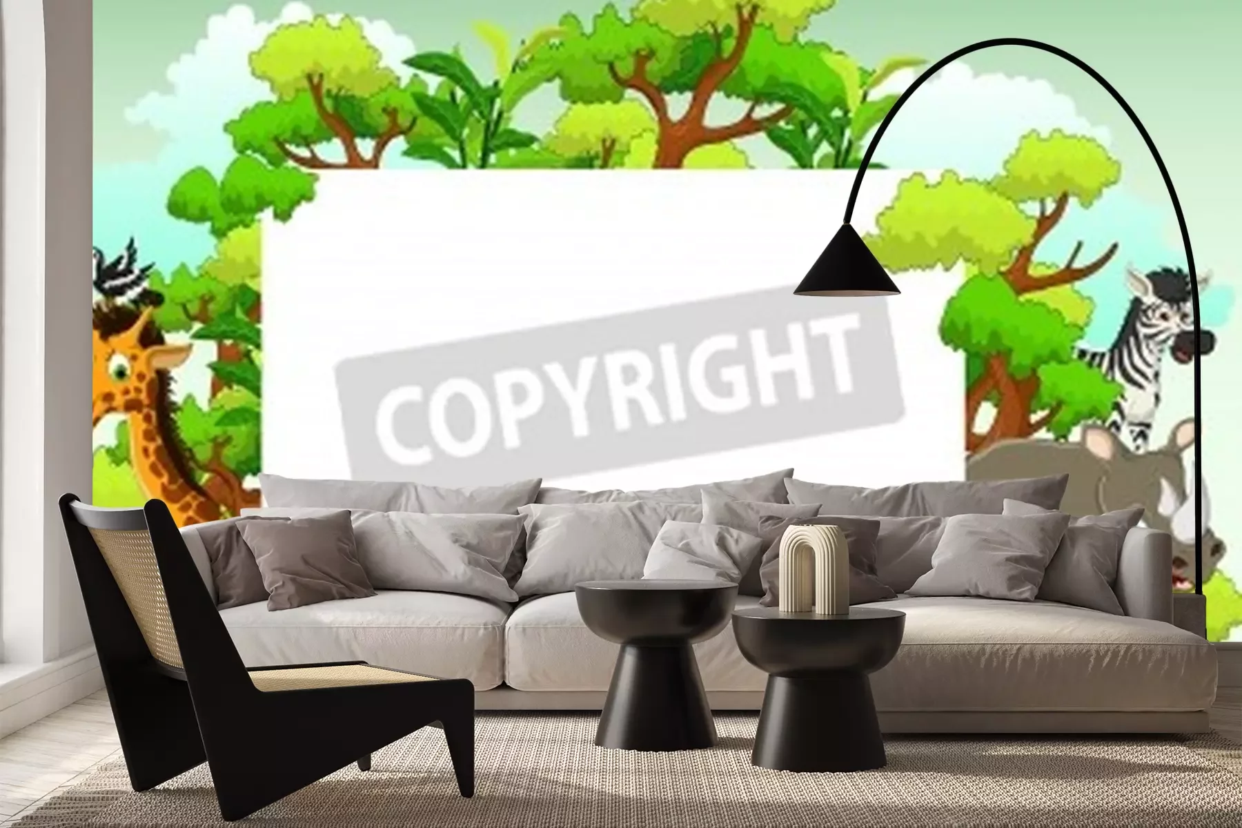 Sticker niedlicher Tierkarikatur mit leerem Zeichen und tropischem Waldhintergrund