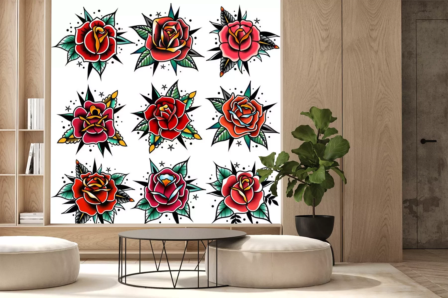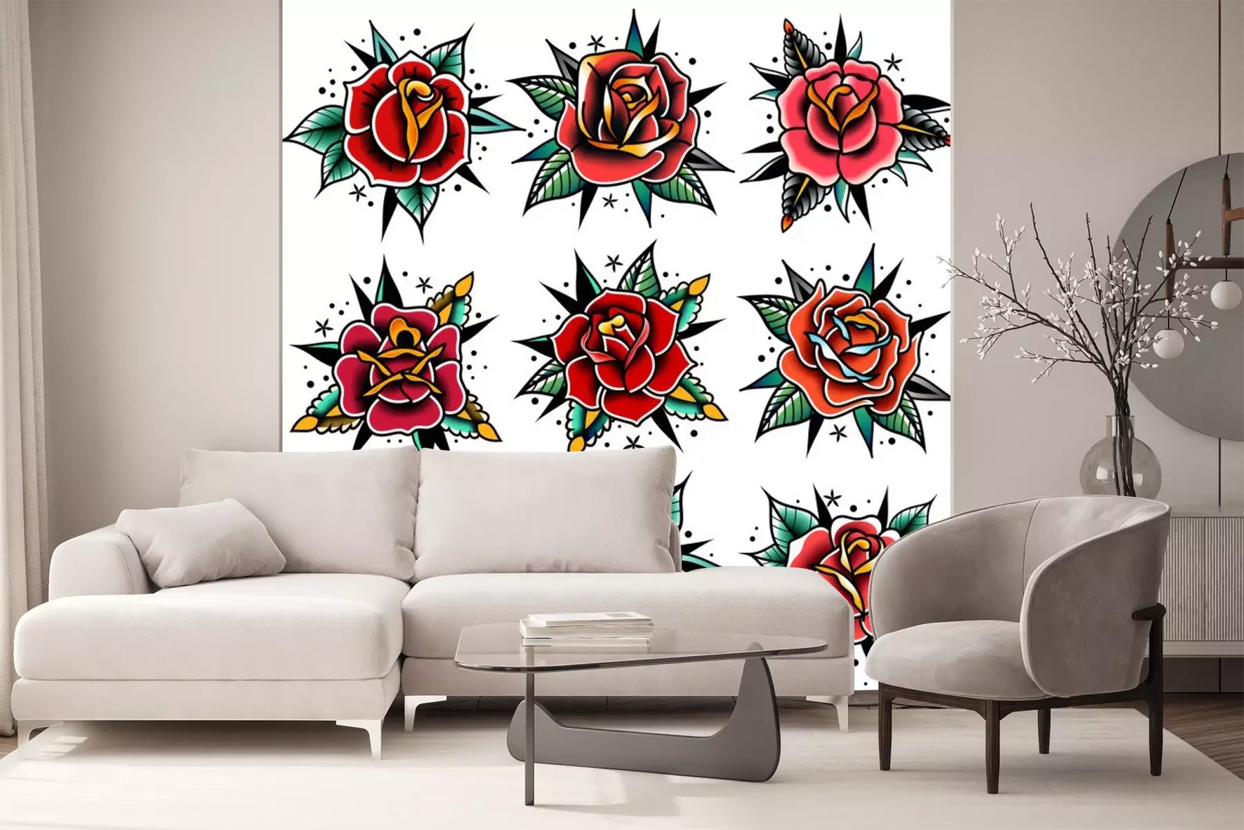 Sticker old school tattoo red roses with leaves set