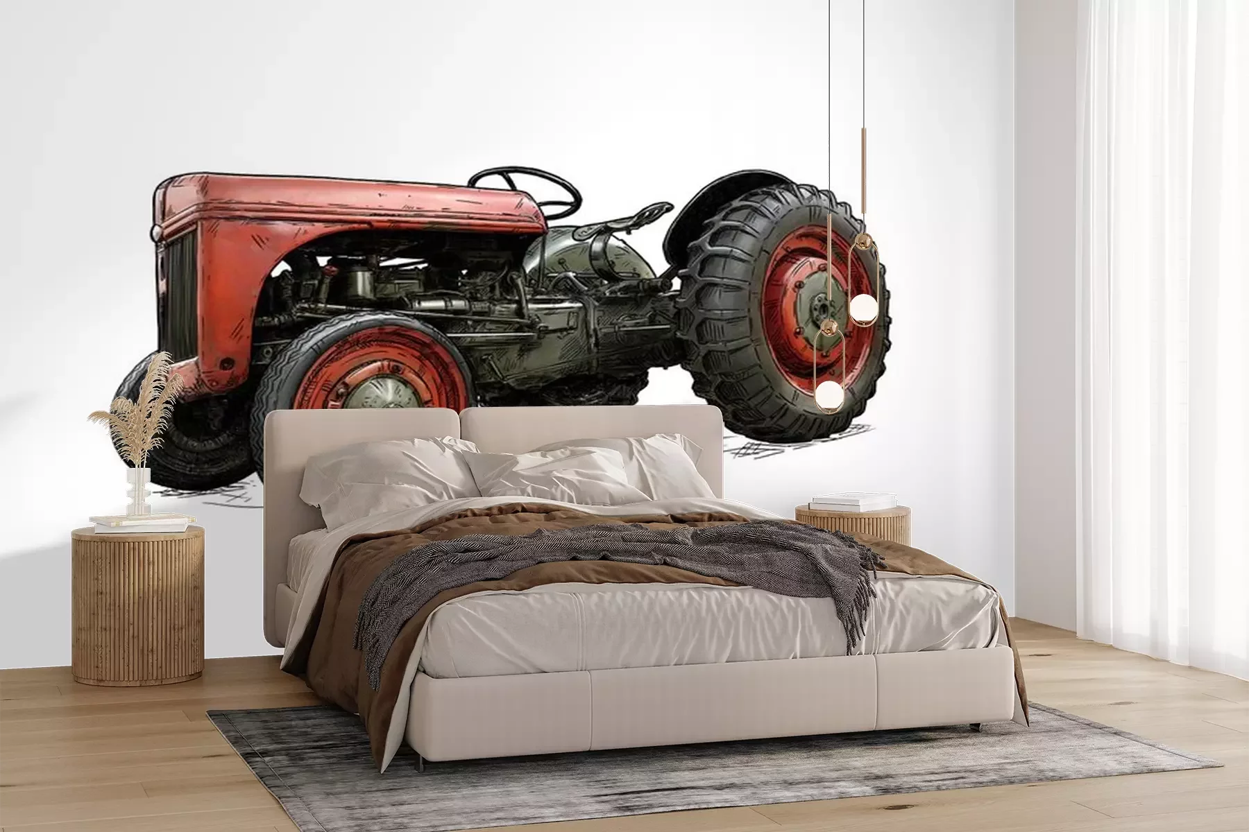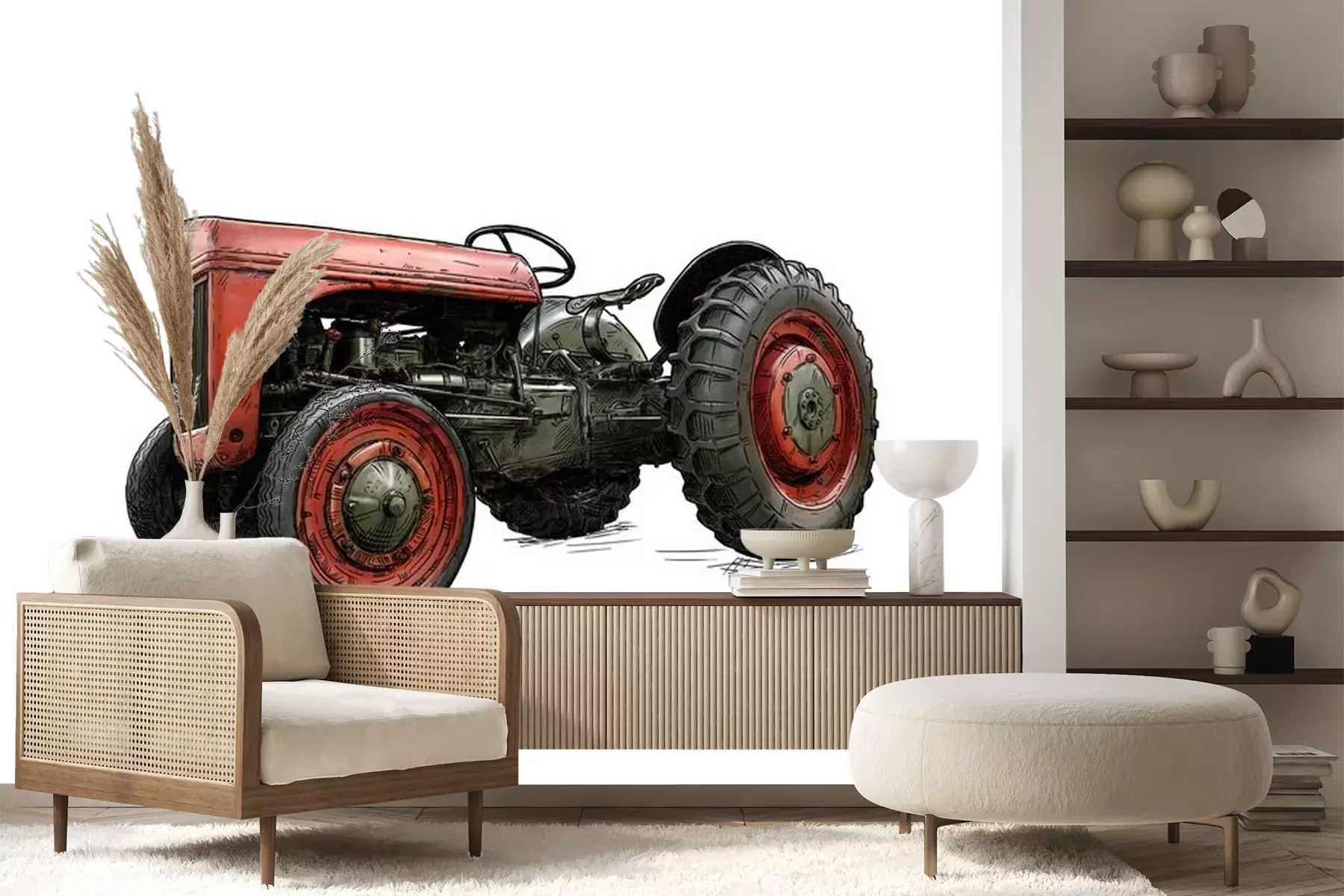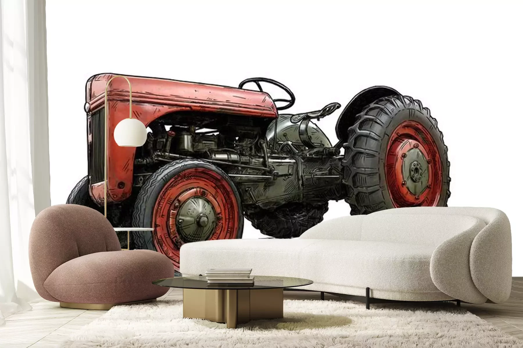Sticker Old vintage red tractor illustration in cartoon or comic style. Tractor was made in Dearborn, Michigan, United States or USA from 1939 to 1942 or 30's to 40's.