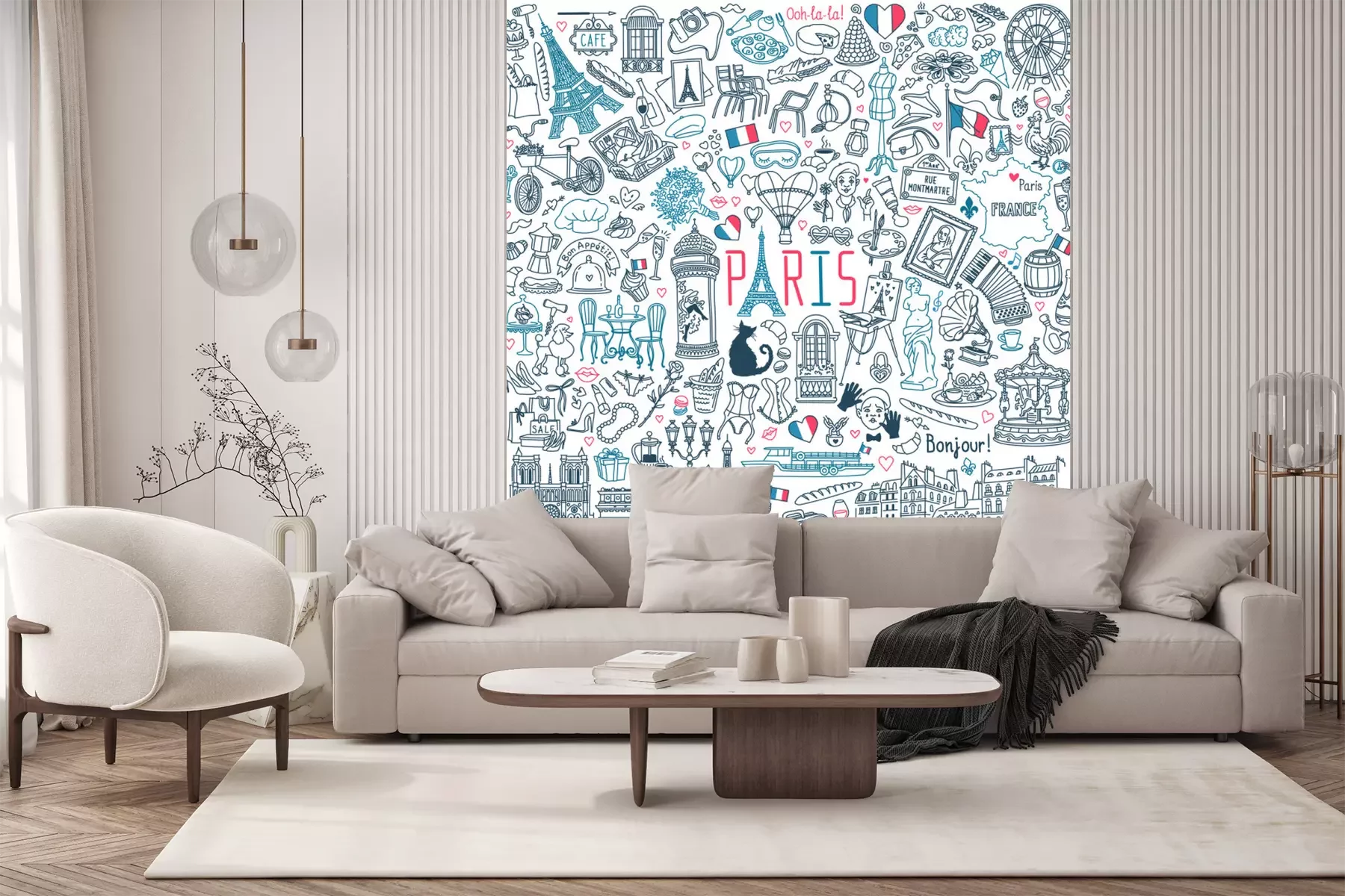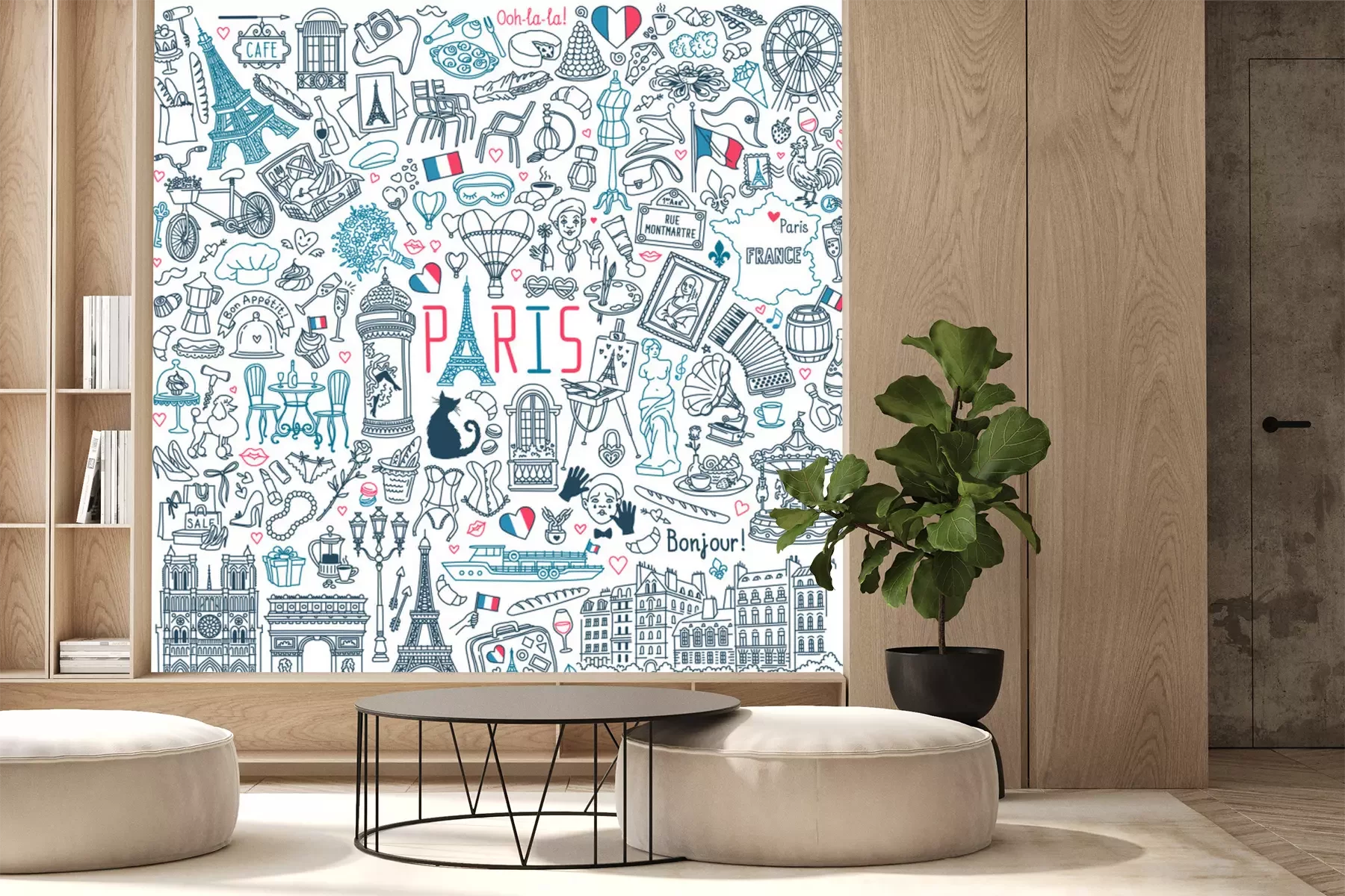 Sticker Paris doodle set. Popular French landmarks, food and attractions. Vector illustration isolated on white background