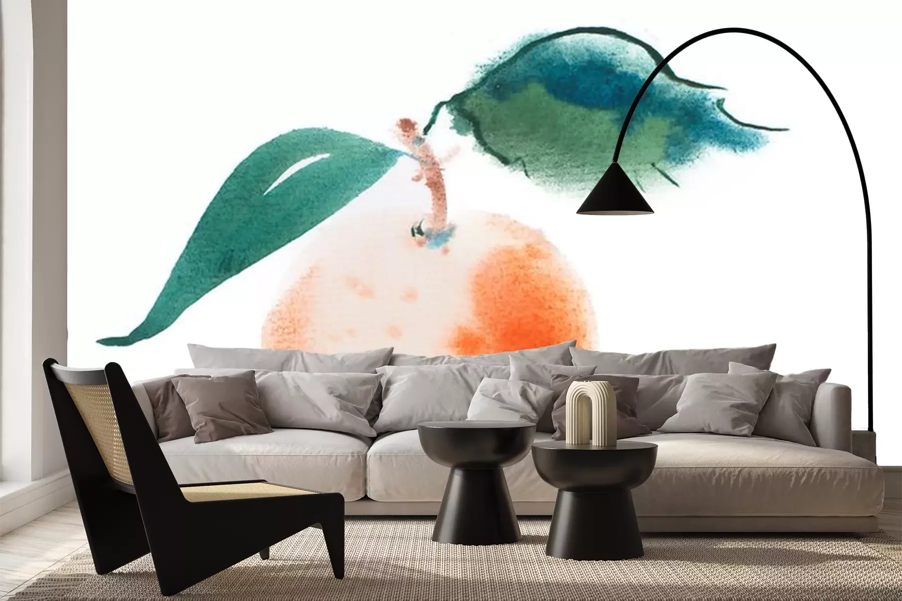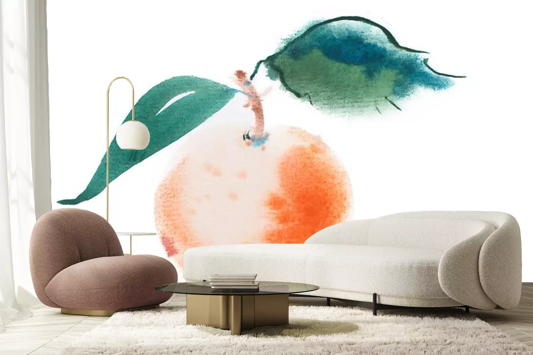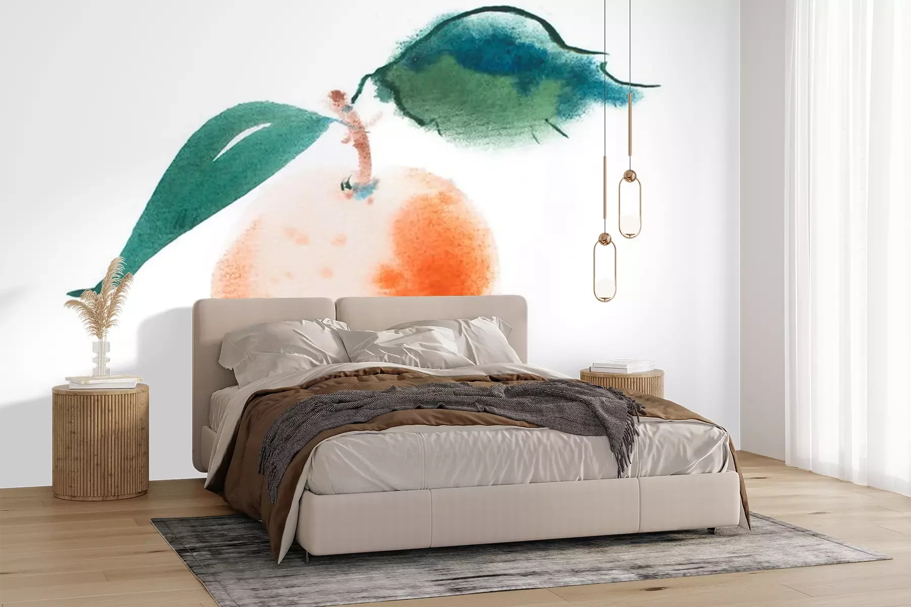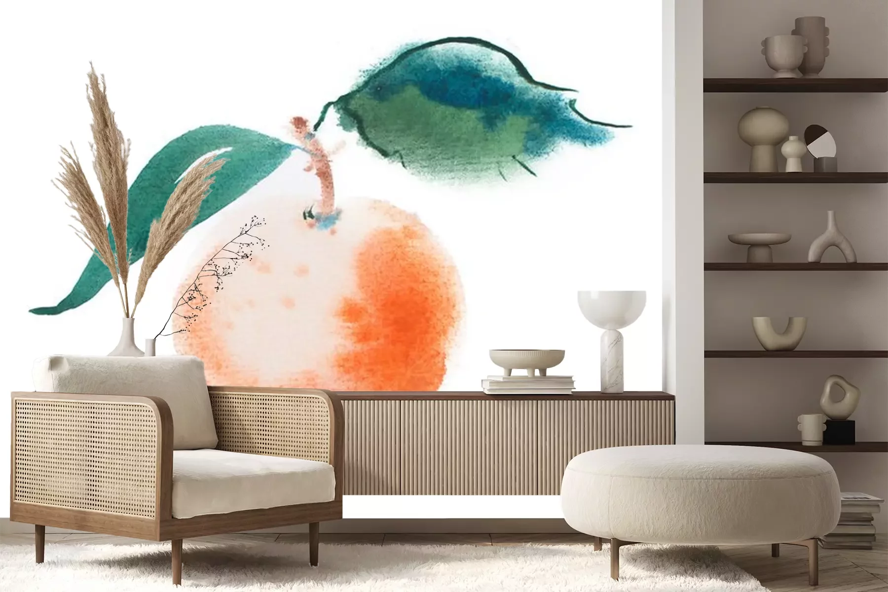Sticker Pfirsich mit Blättern mit Aquarellfarben gemalt