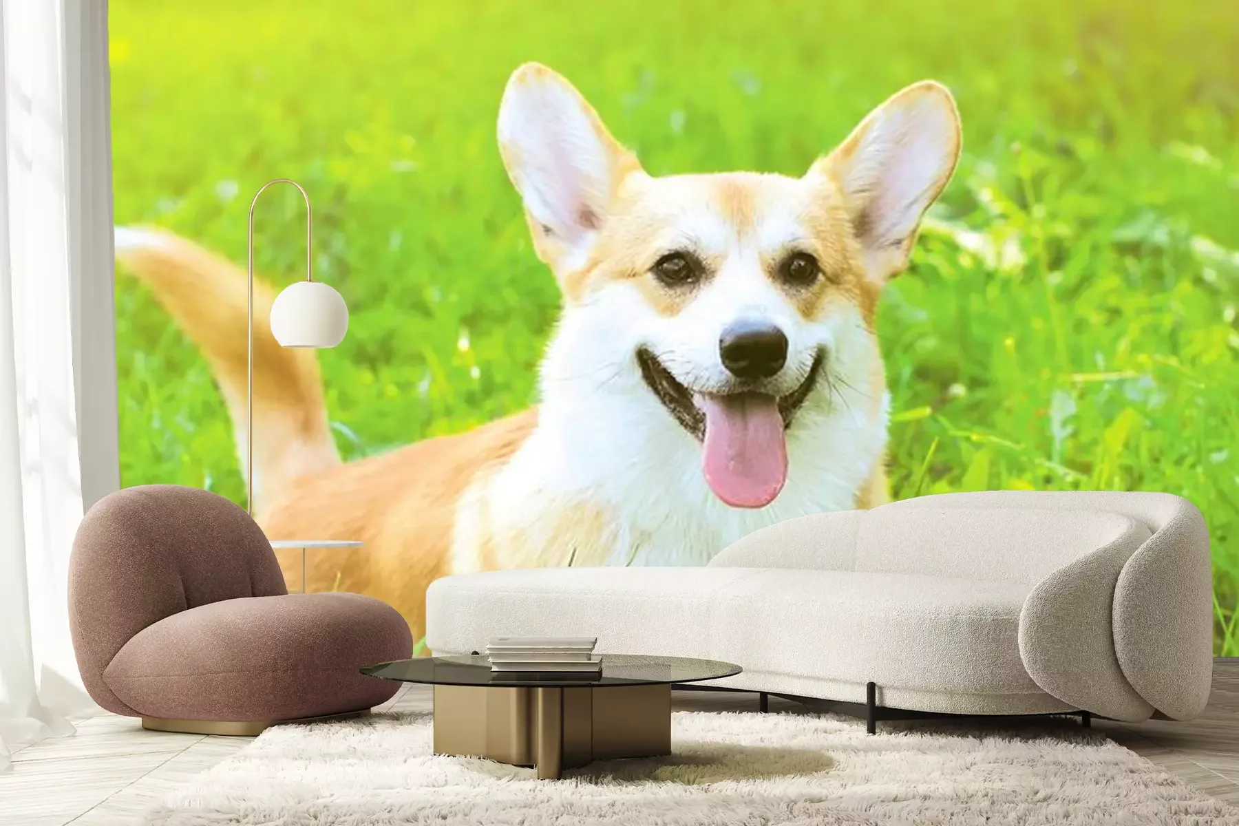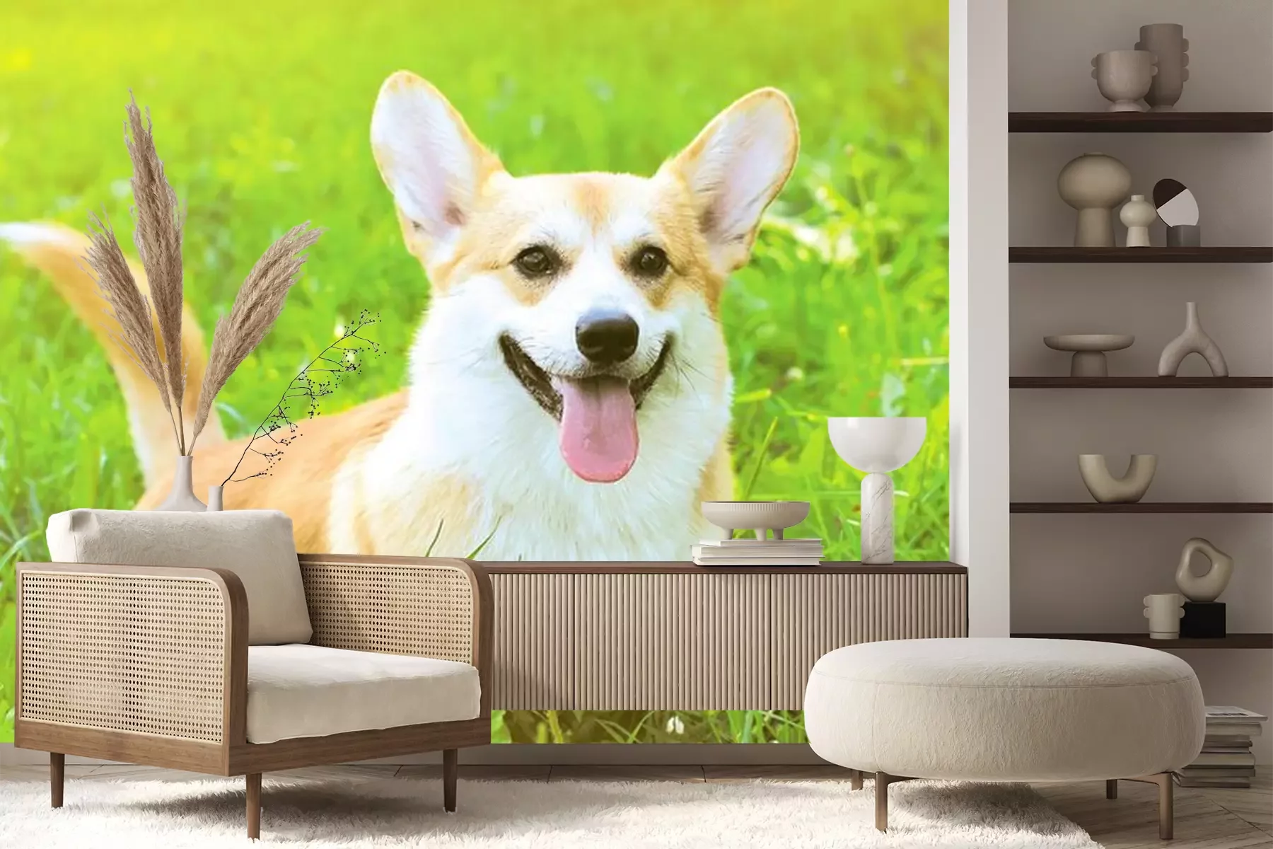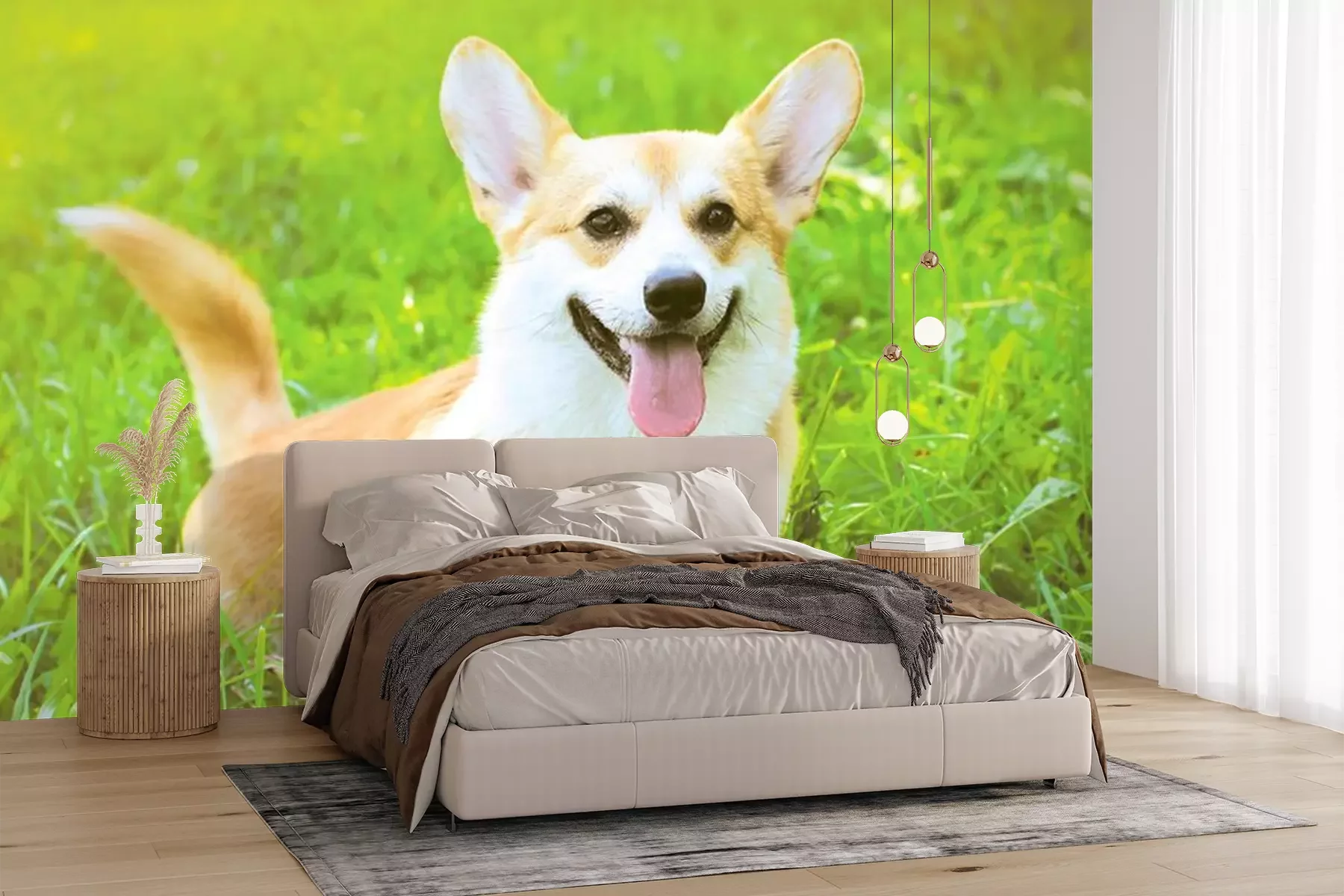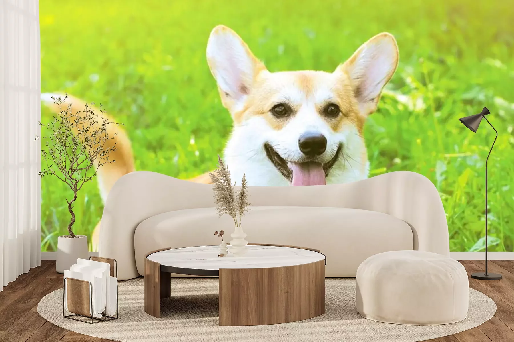 Sticker Pfoten eines Corgi-Hundes, der über eine im Gras versteckte Lichtung läuft