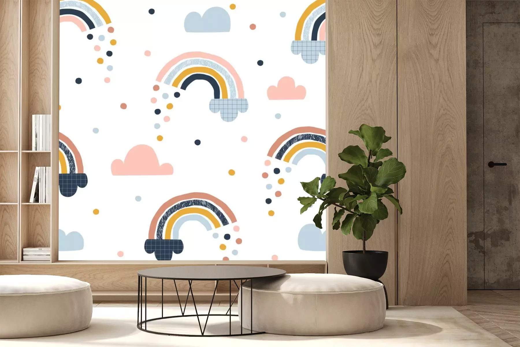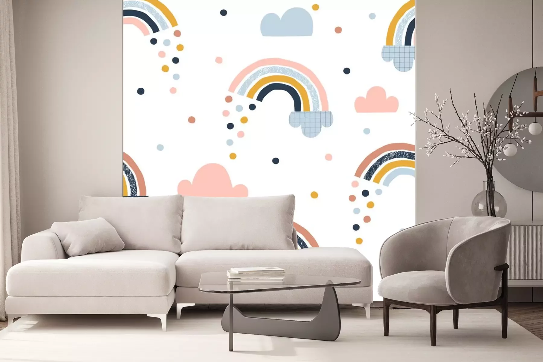 Sticker Regenbogen zwischen Wolken und bunten Regentropfen