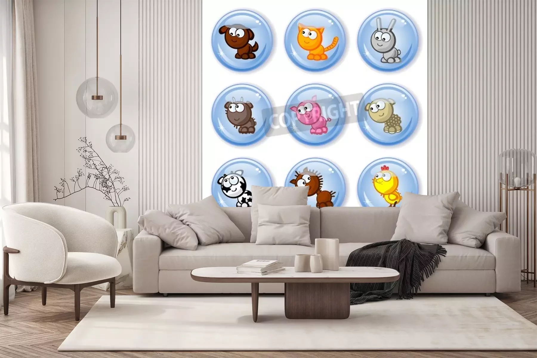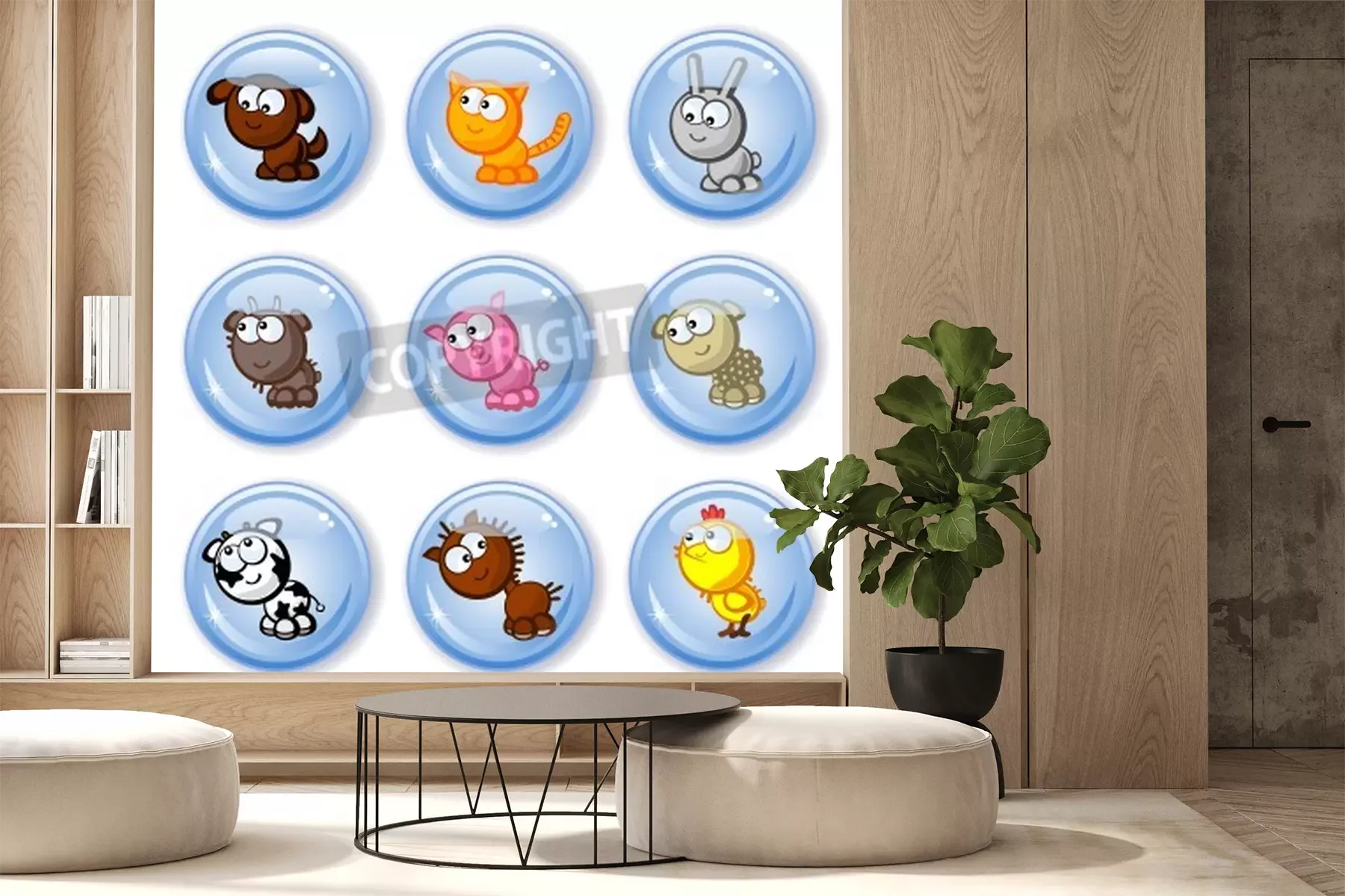 Sticker Reihe von Vektor-Tasten isoliert. Nette Nutztieren. Kinder-Comic-Stil Zeichnungen.