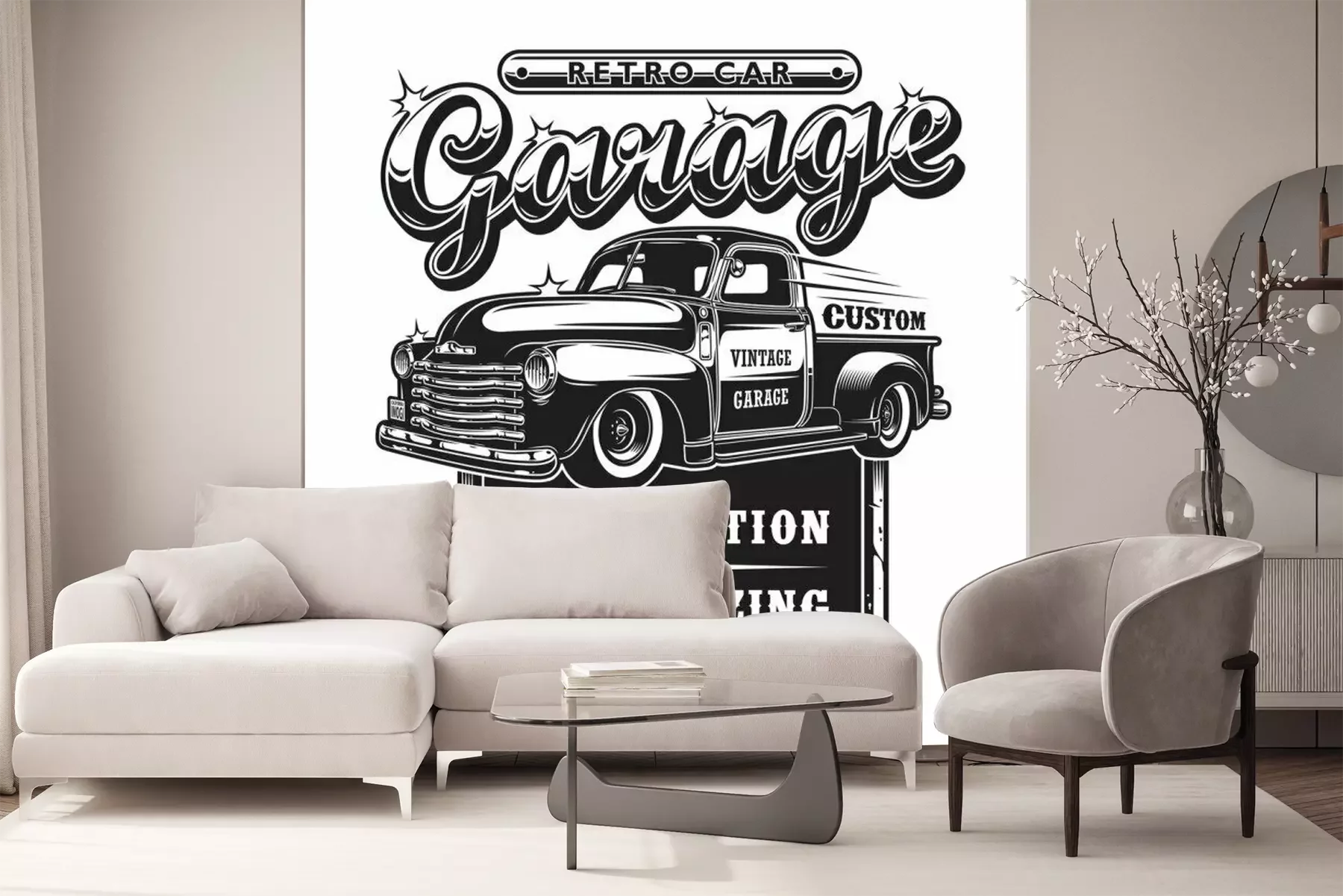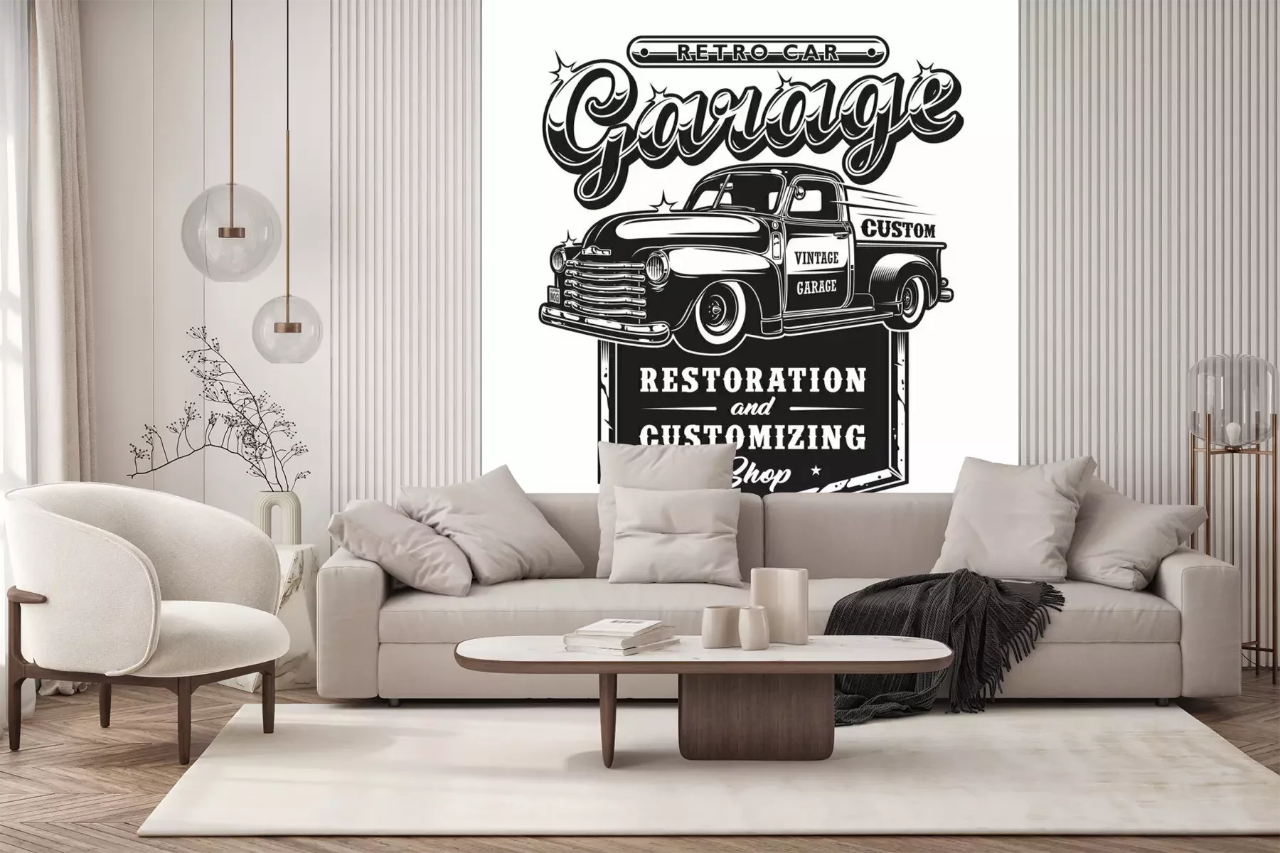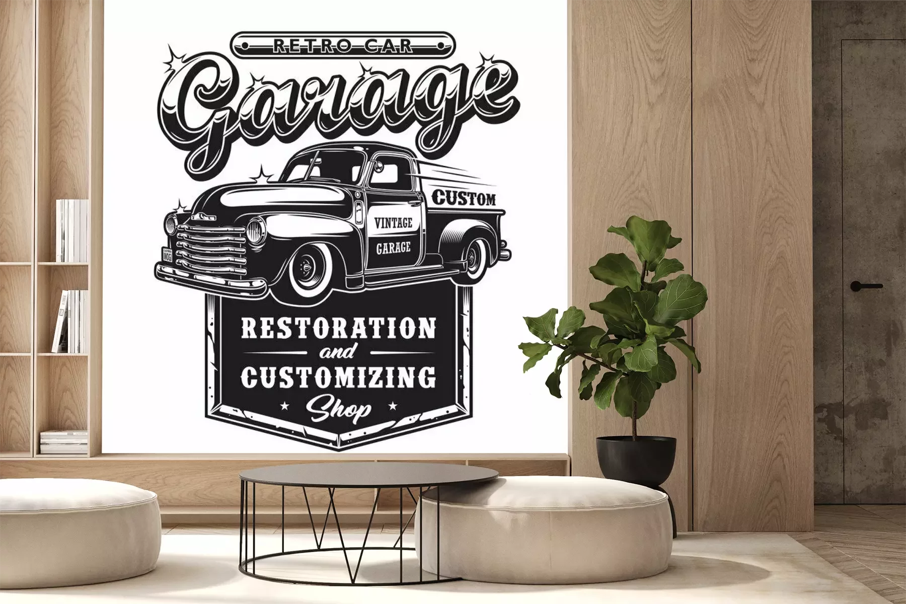Sticker Retro- Autoreparatur-Garagenzeichen mit Retrostil-LKW. Kundenspezifischer Wiederherstellungsshop.