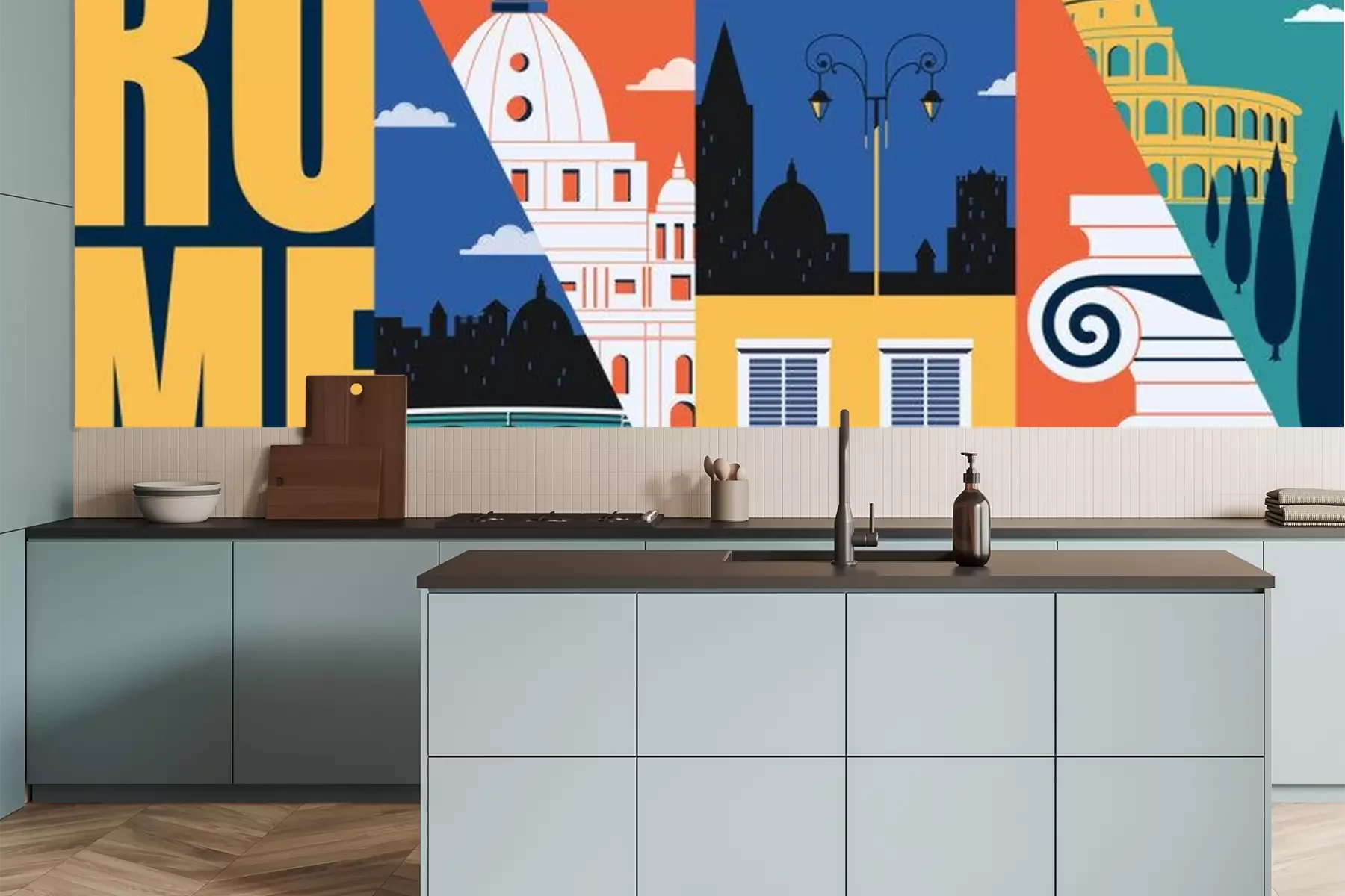 Sticker Rome, Italy vector banner, illustration. City skyline, historical buildings in modern flat design