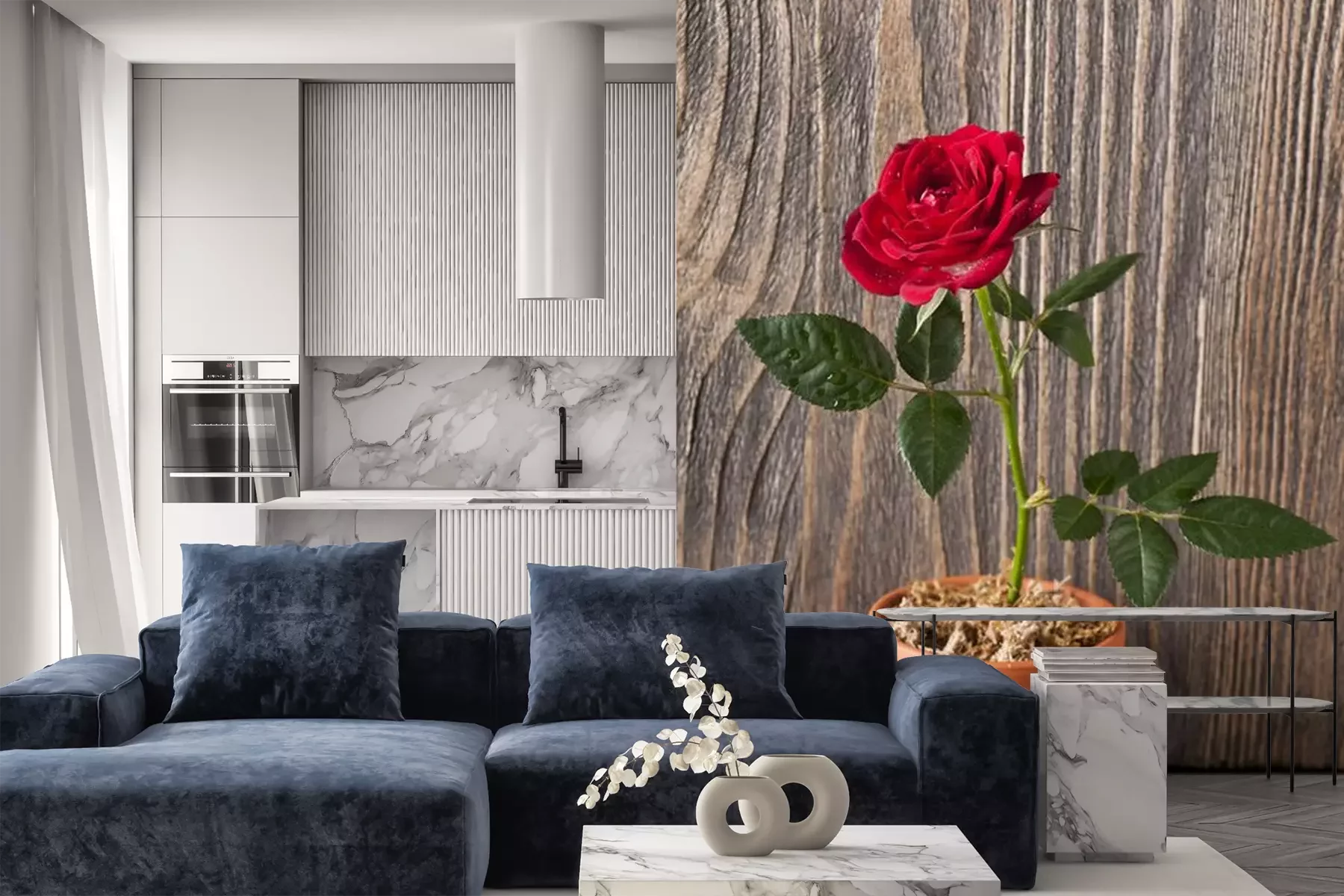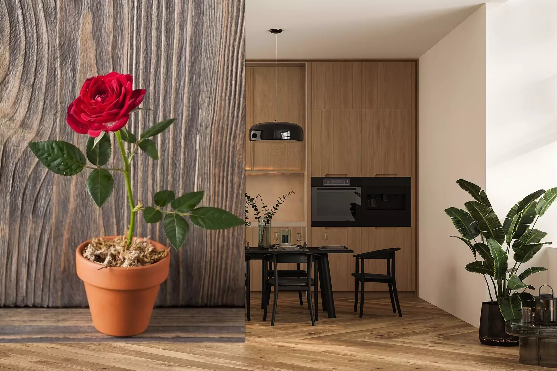 Sticker Rose in einem Topf auf einem hölzernen Hintergrund