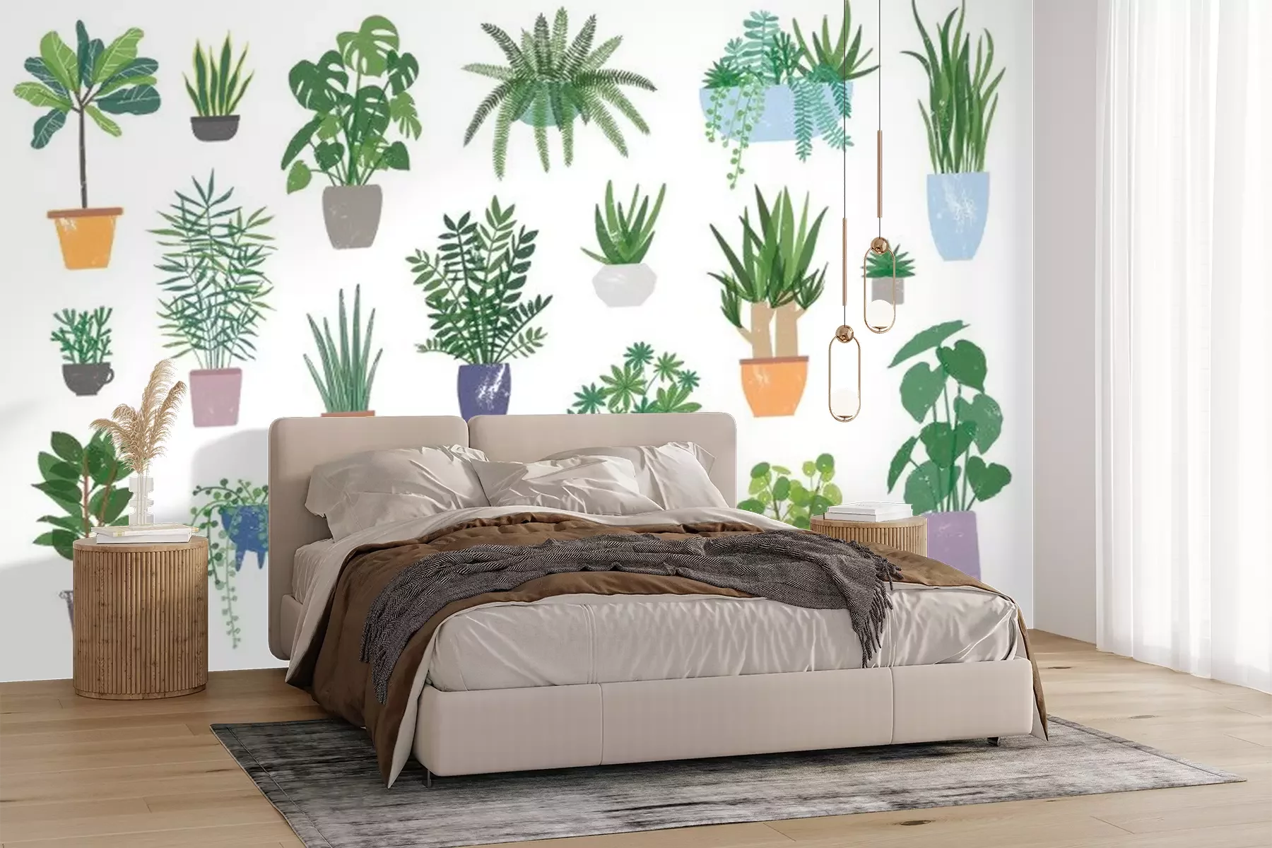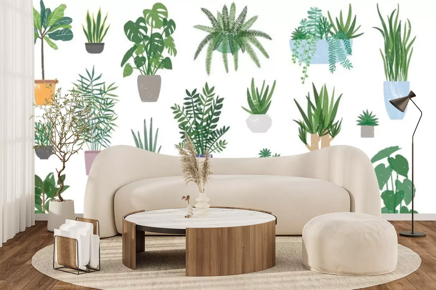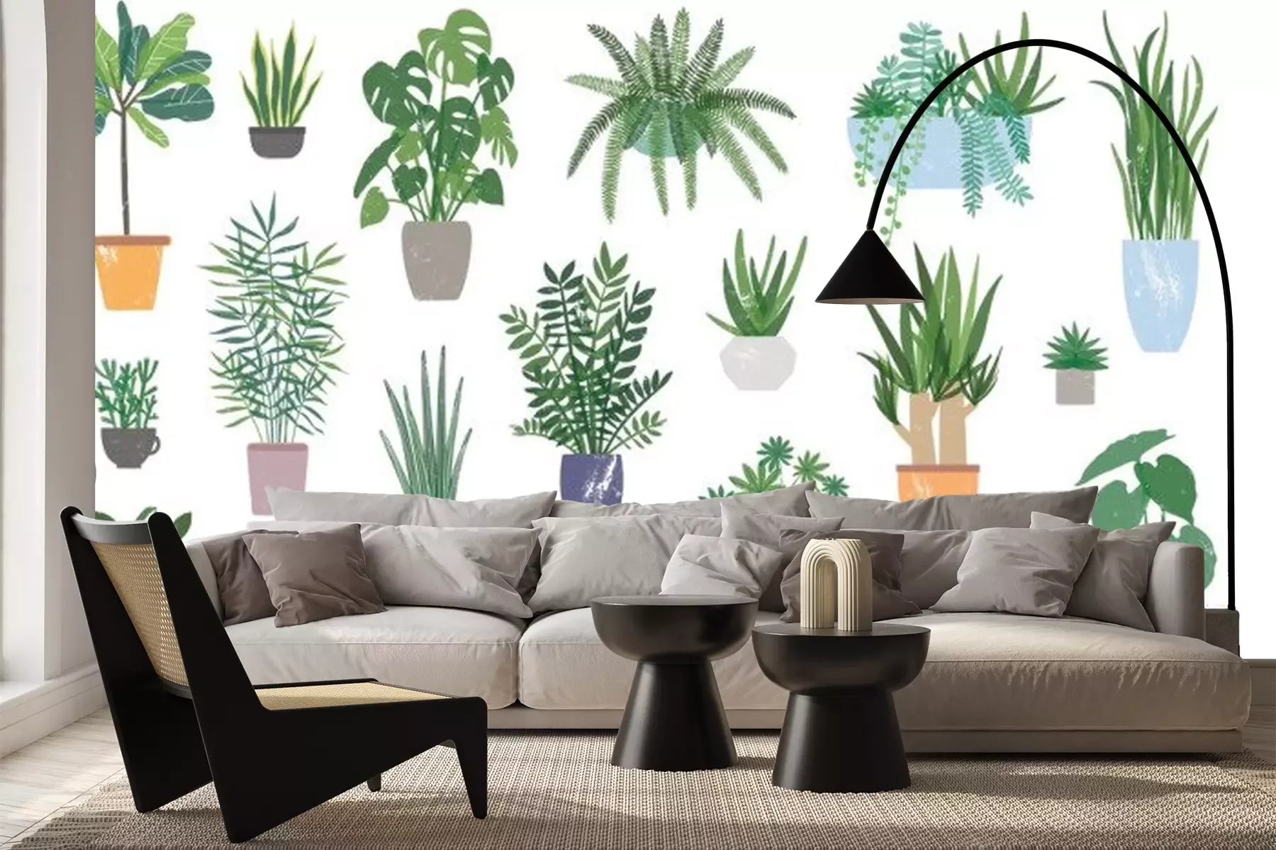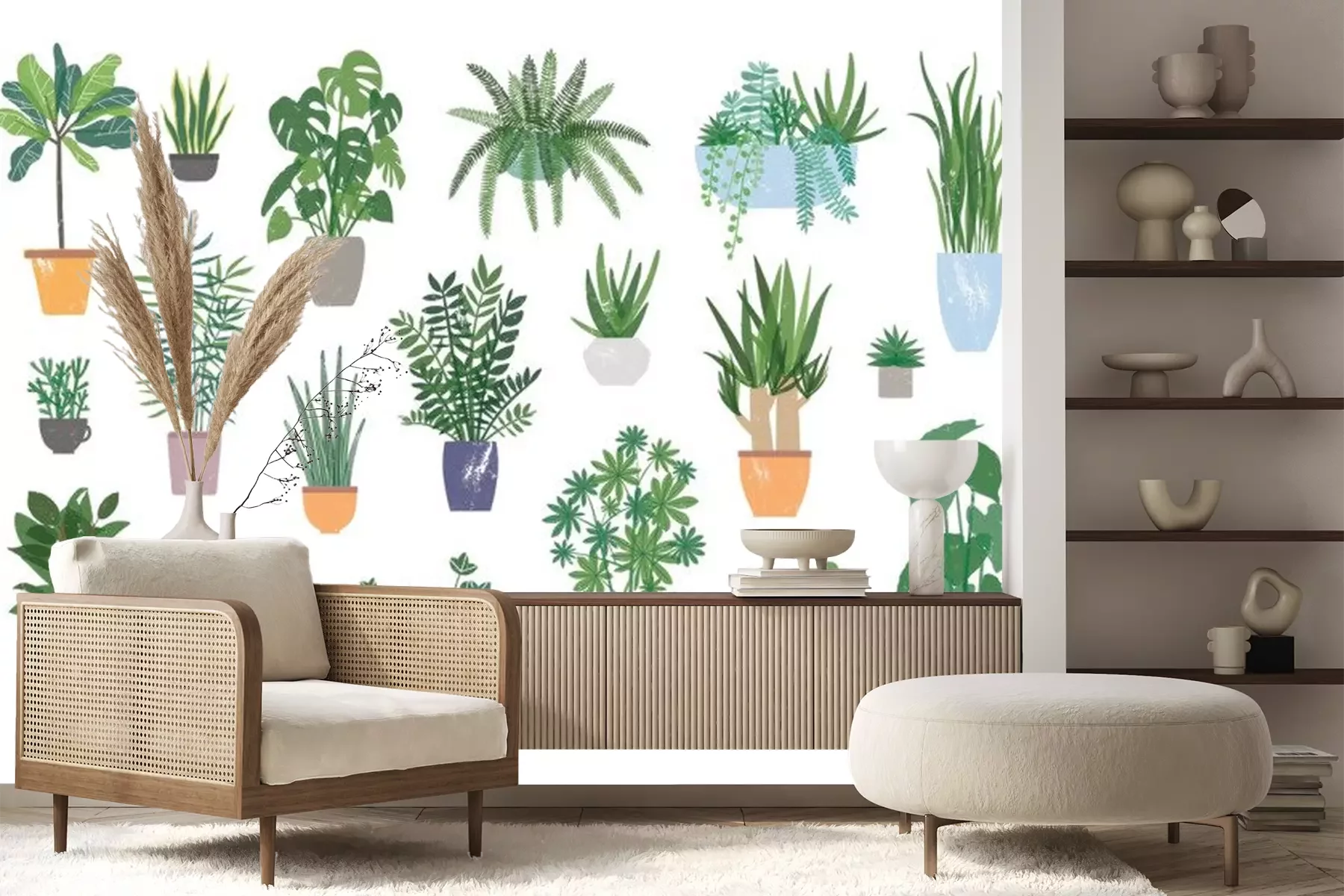 Sticker Sammlung von dekorativen Zimmerpflanzen lokalisiert auf weißem Hintergrund.  Bündel trendiger Pflanzen, die in Töpfen oder Pflanzgefäßen wachsen.  Satz schöne natürliche Hauptdekorationen.  Flache bun