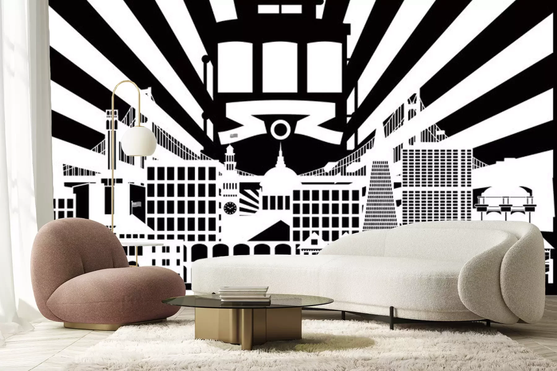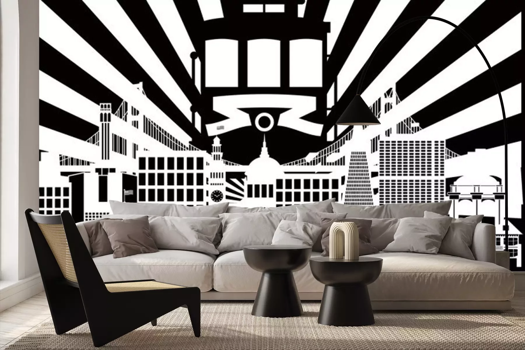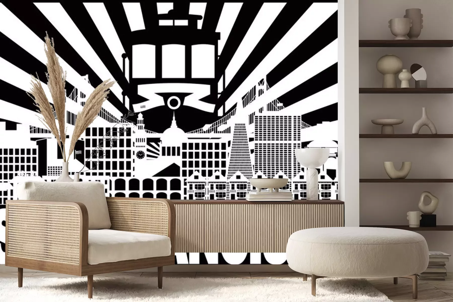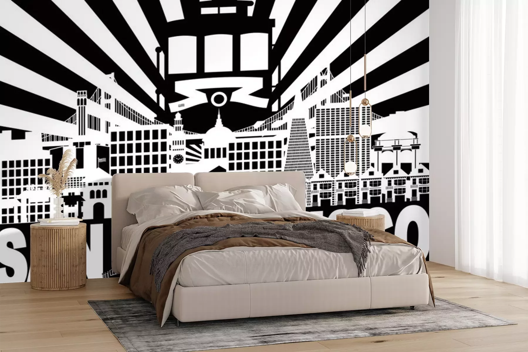 Sticker San Francisco Skyline Trolley und Sonnenstrahlen mit Textvektorillustration