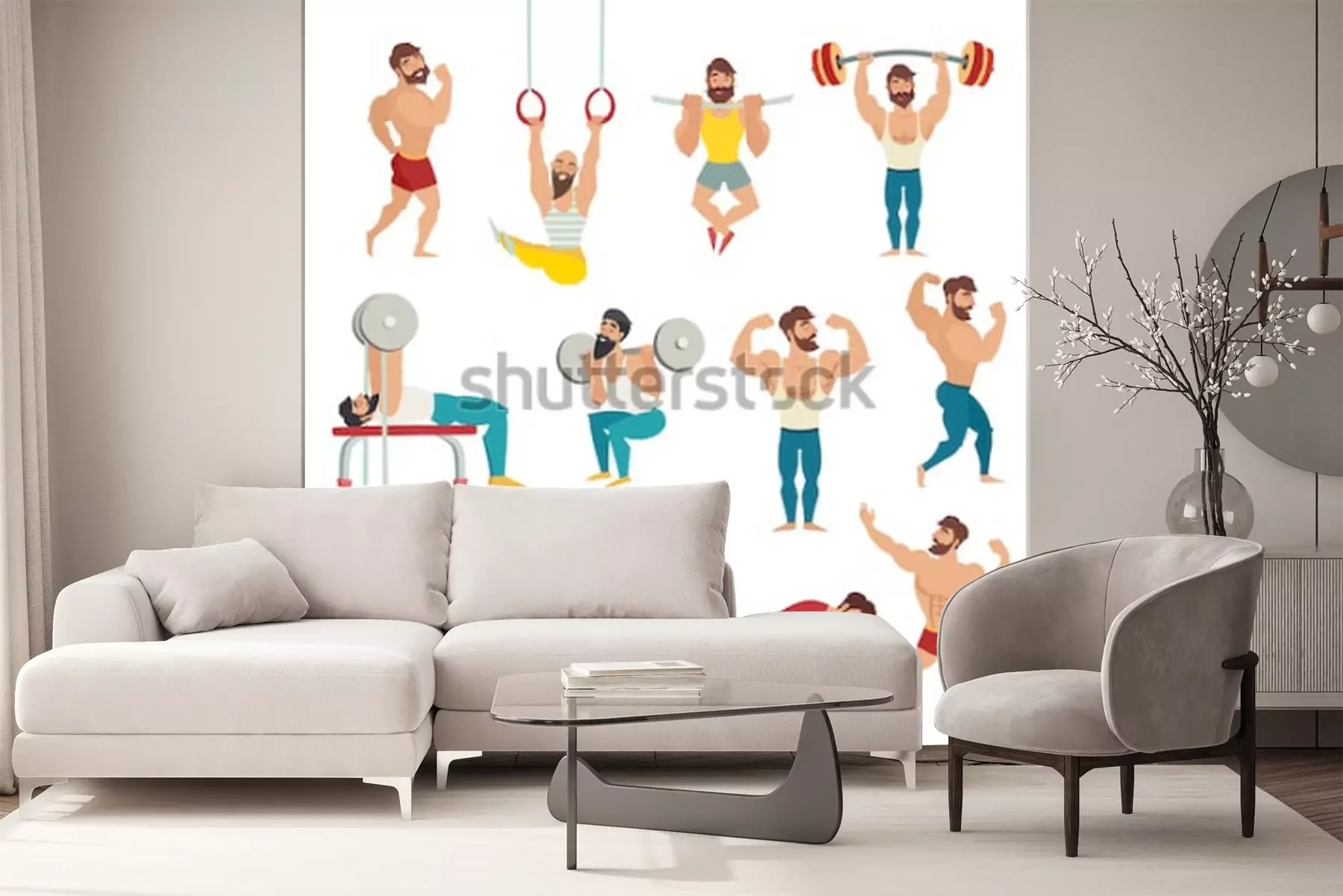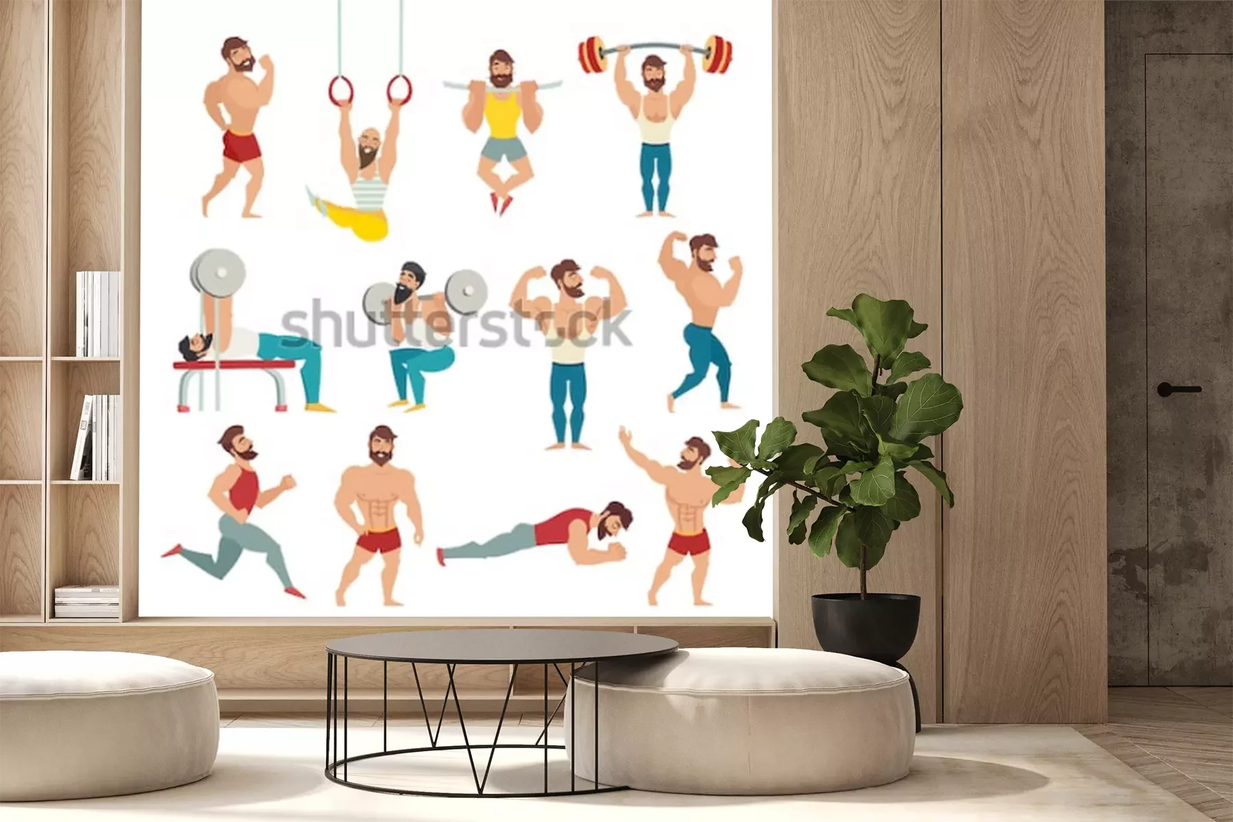 Sticker Satz der muskulösen, bärtigen bemannt Vektorillustration. Fitnessmodels, Posieren, Bodybuilding. Sportler in der Turnhalle. Gymnastikringe, laufend. Lokalisierter Vektor, weißer Hintergrund