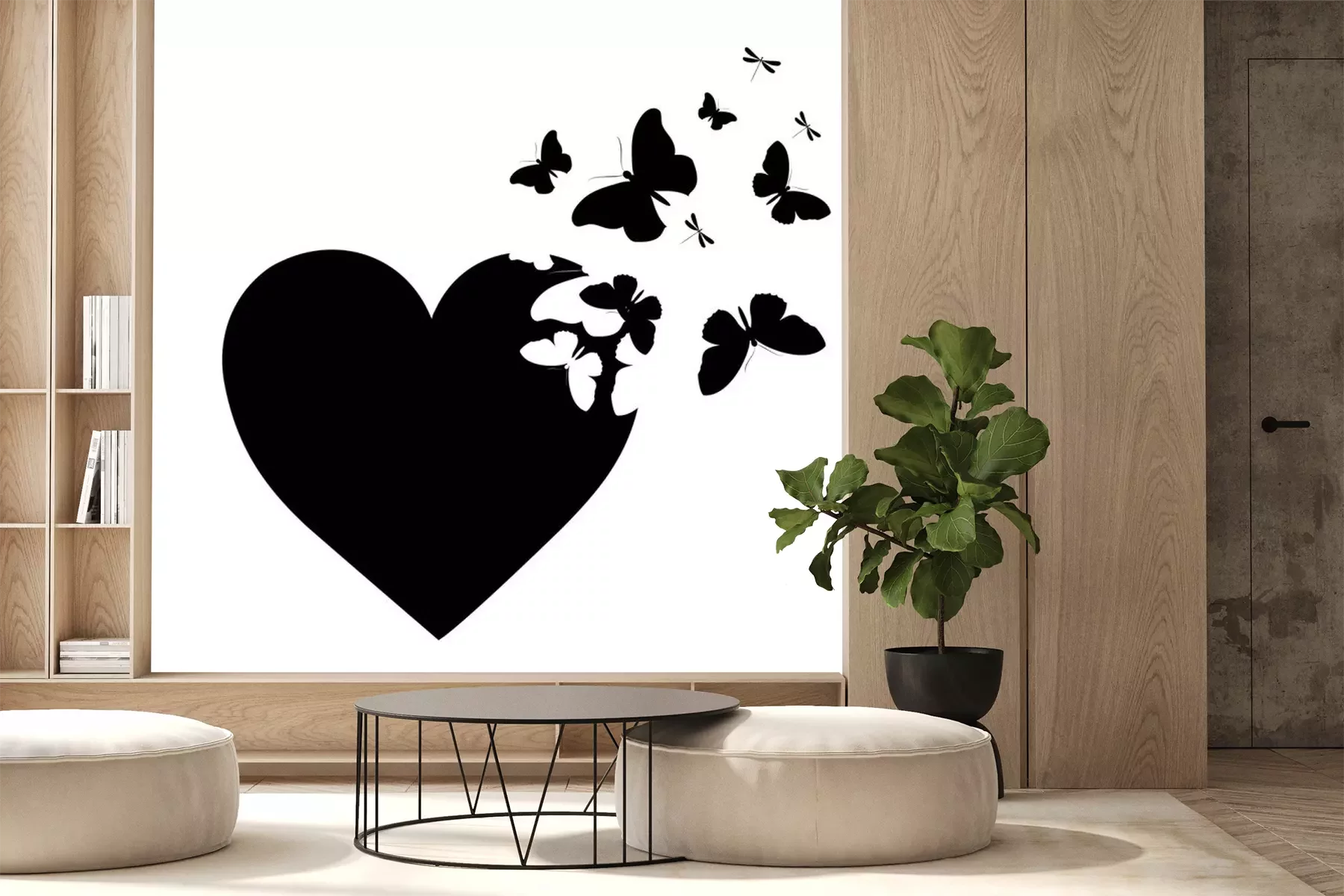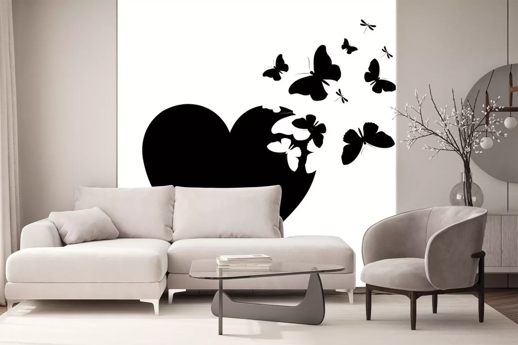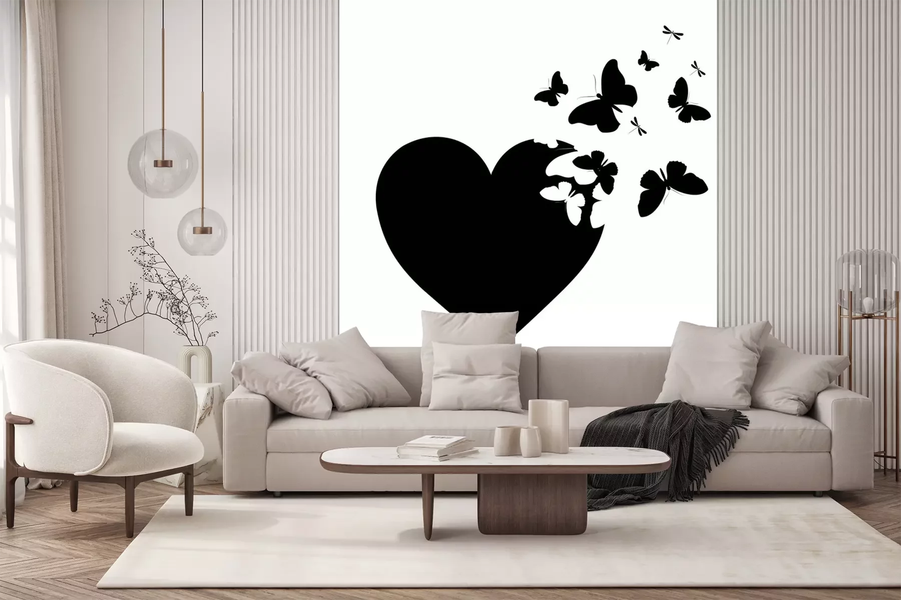 Sticker Schwarz-Weiß-Zeichnung eines Herzens mit Schmetterlingen