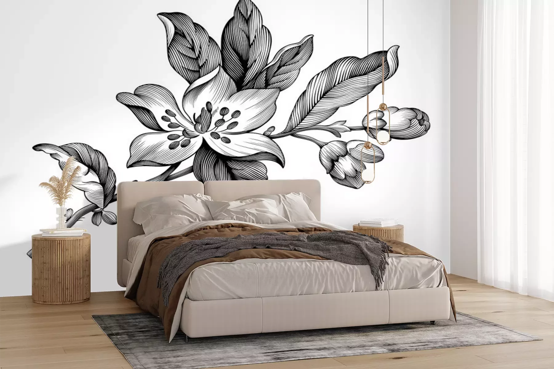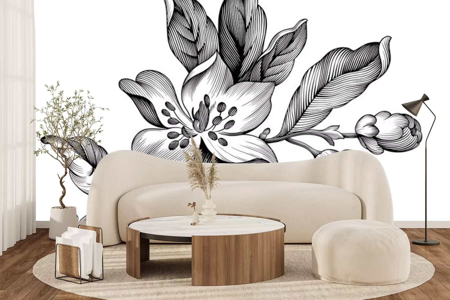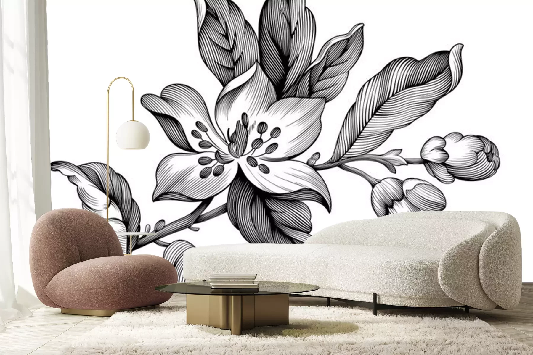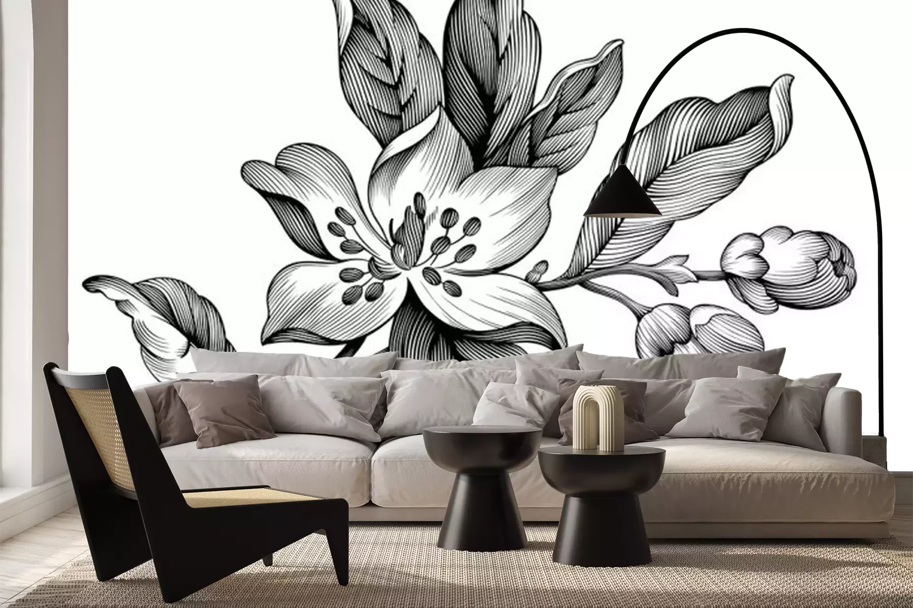Sticker Schwarz-weiße Blumen vom Apfelbaum florale Illustration