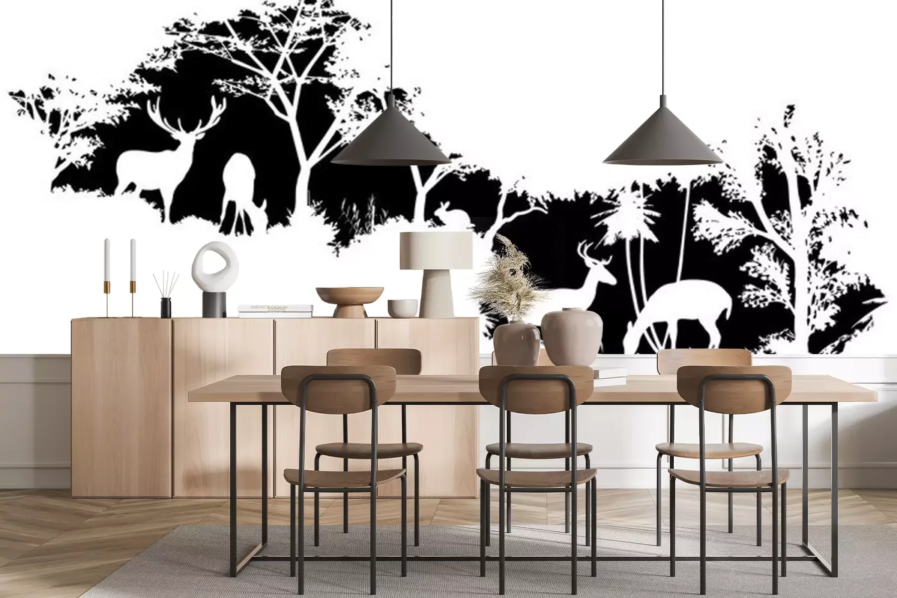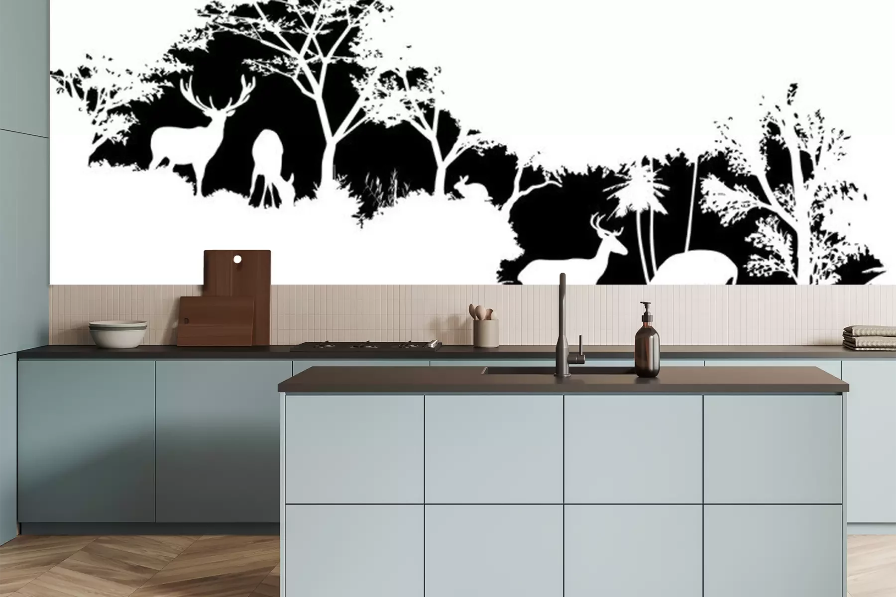 Sticker Schwarz-weiße Zeichnung Tiere auf Waldhintergrund