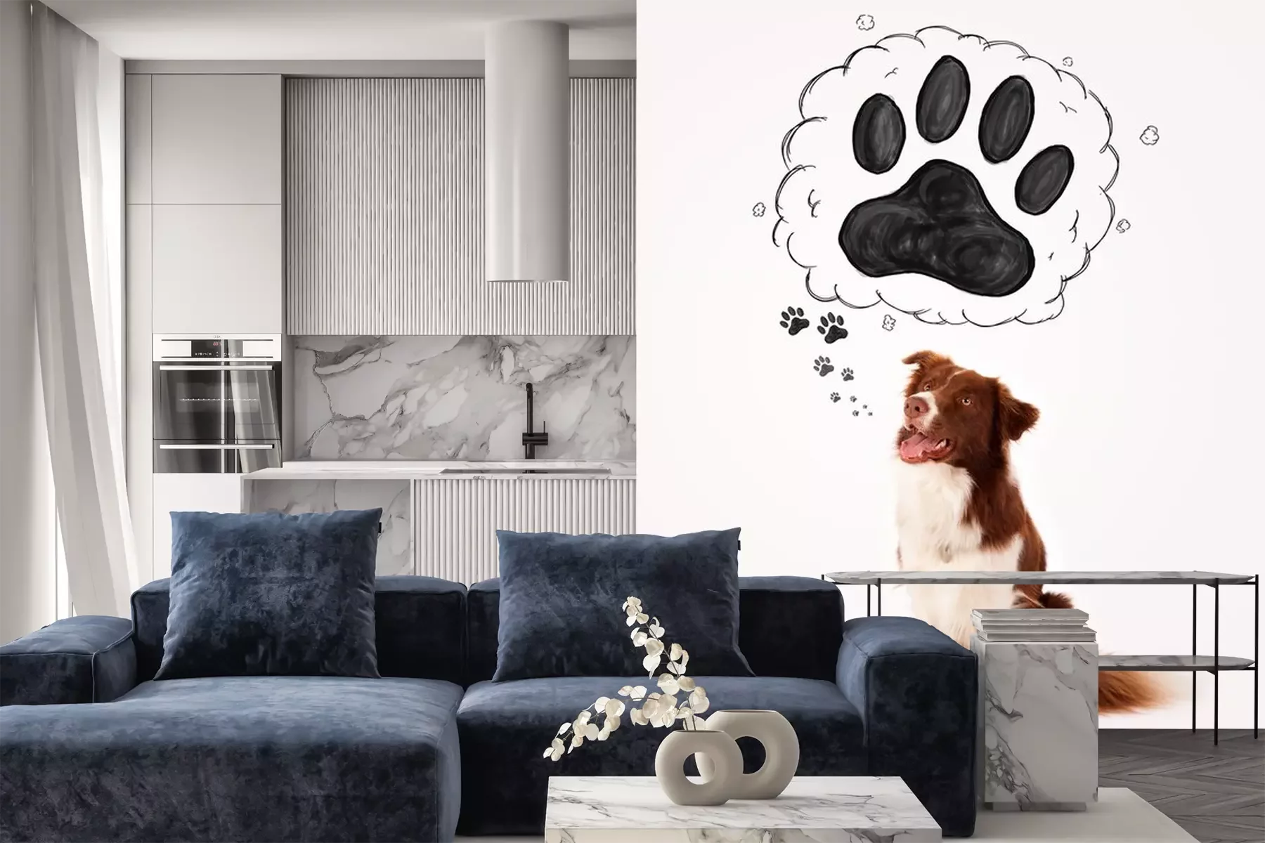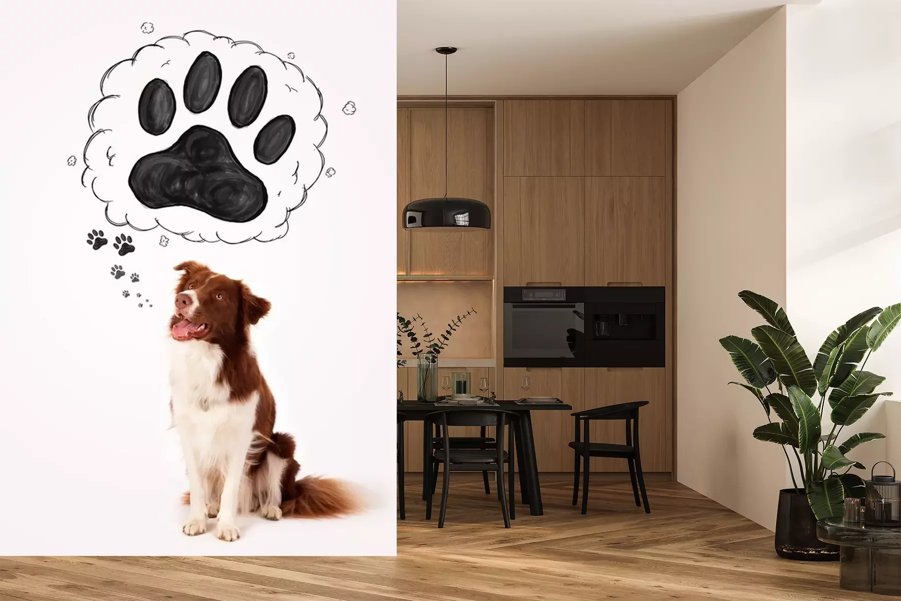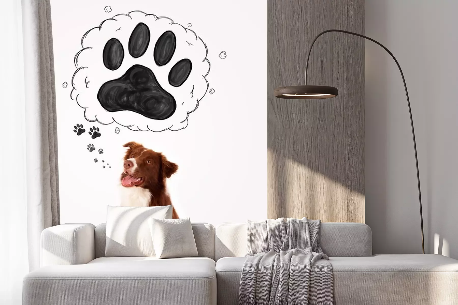 Sticker Schwarze Hundepfoten und Border Collie, der über sie nachdenkt
