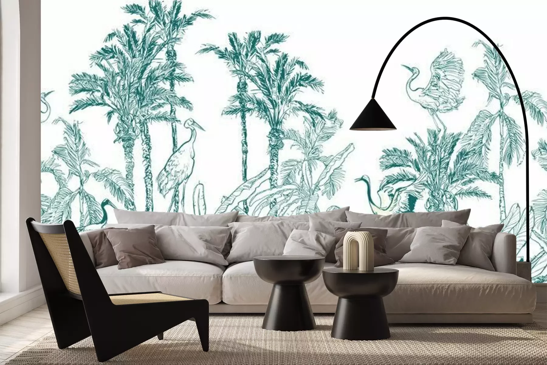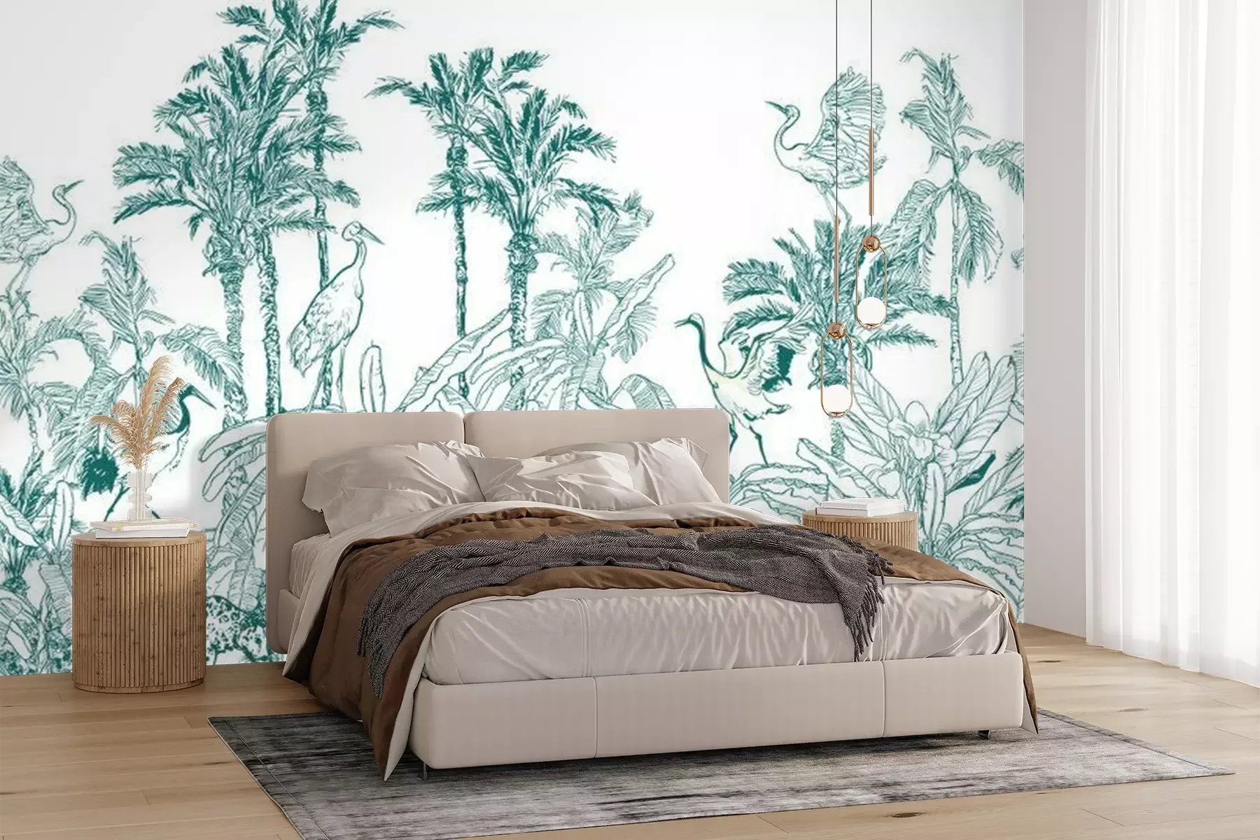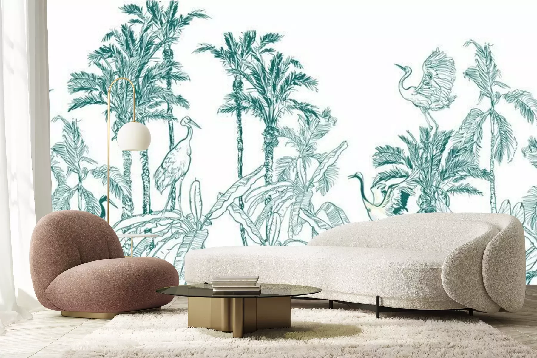 Sticker Seamless Border Animals in Tropical Forest with Banana Palms Blue on White background, Lithography Jungle Wallpaper Mural, Wildlife High End Back Drop Heron, Crane, Tiger, Leopard in Exotic Plants